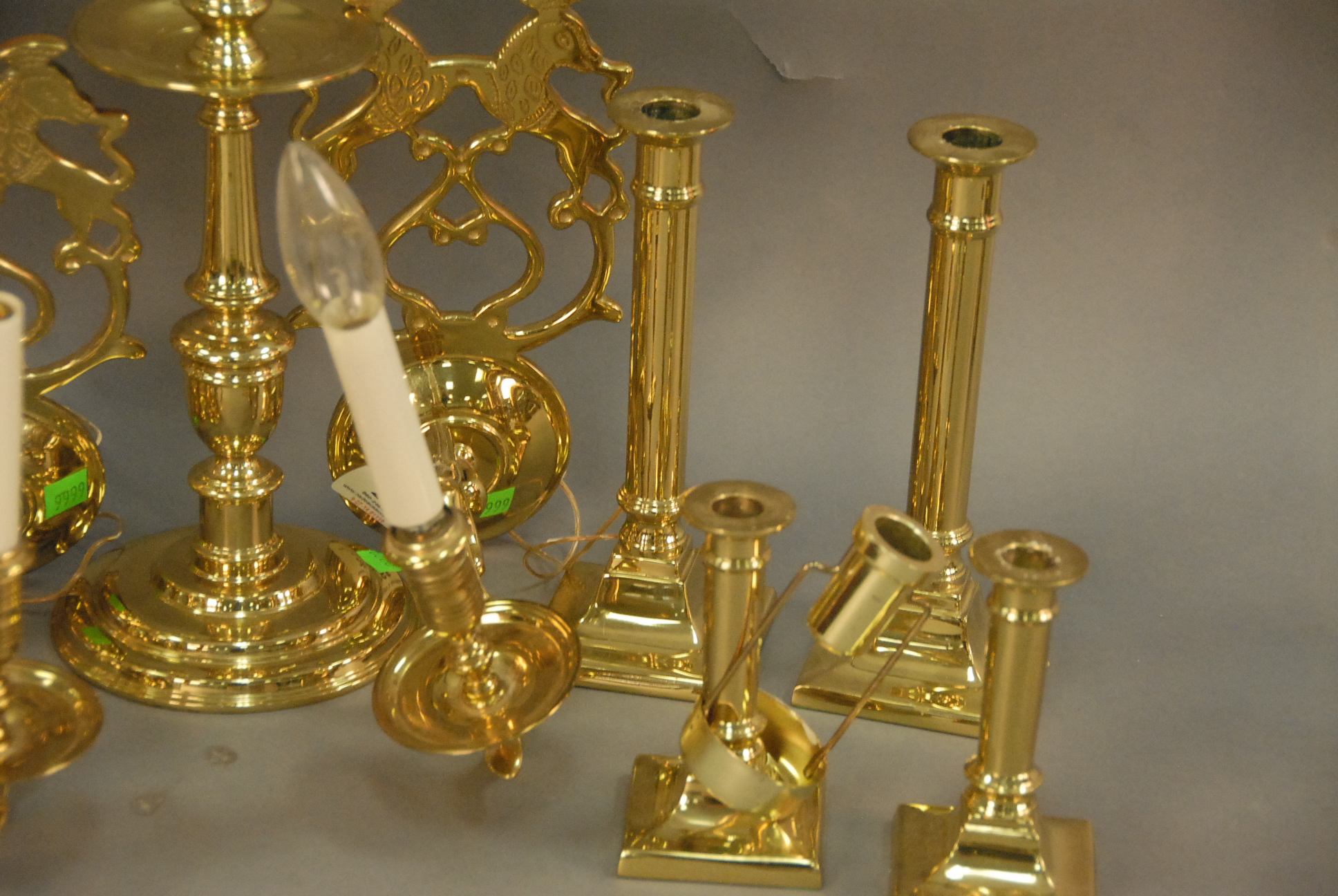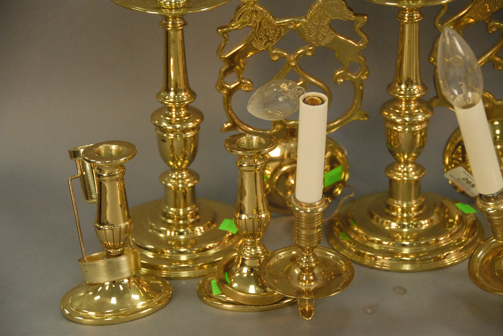 Lot 265: Colonial Virginia Williamsburg ten piece lot to include five pairs of brass candle sticks and sconces.