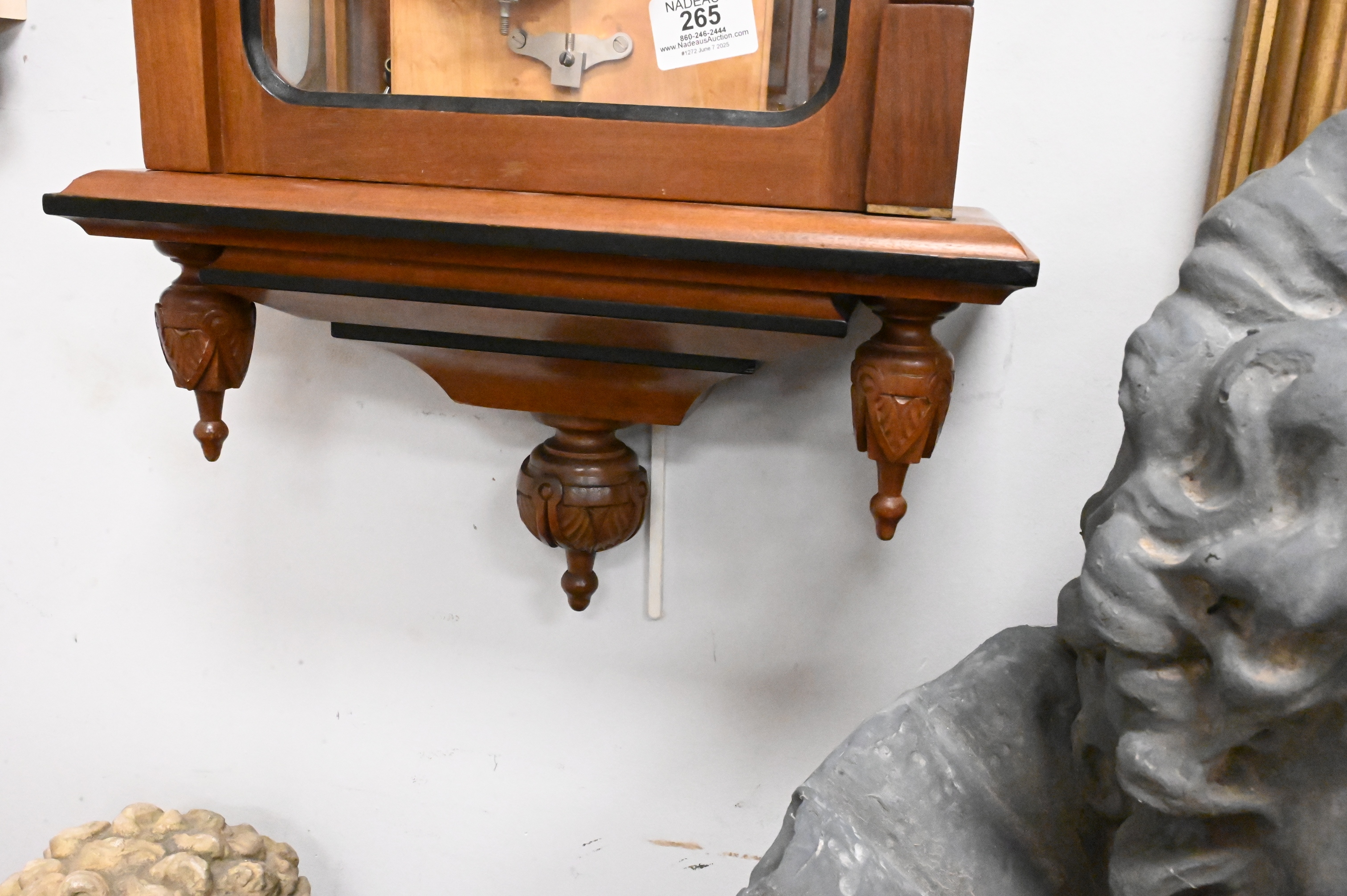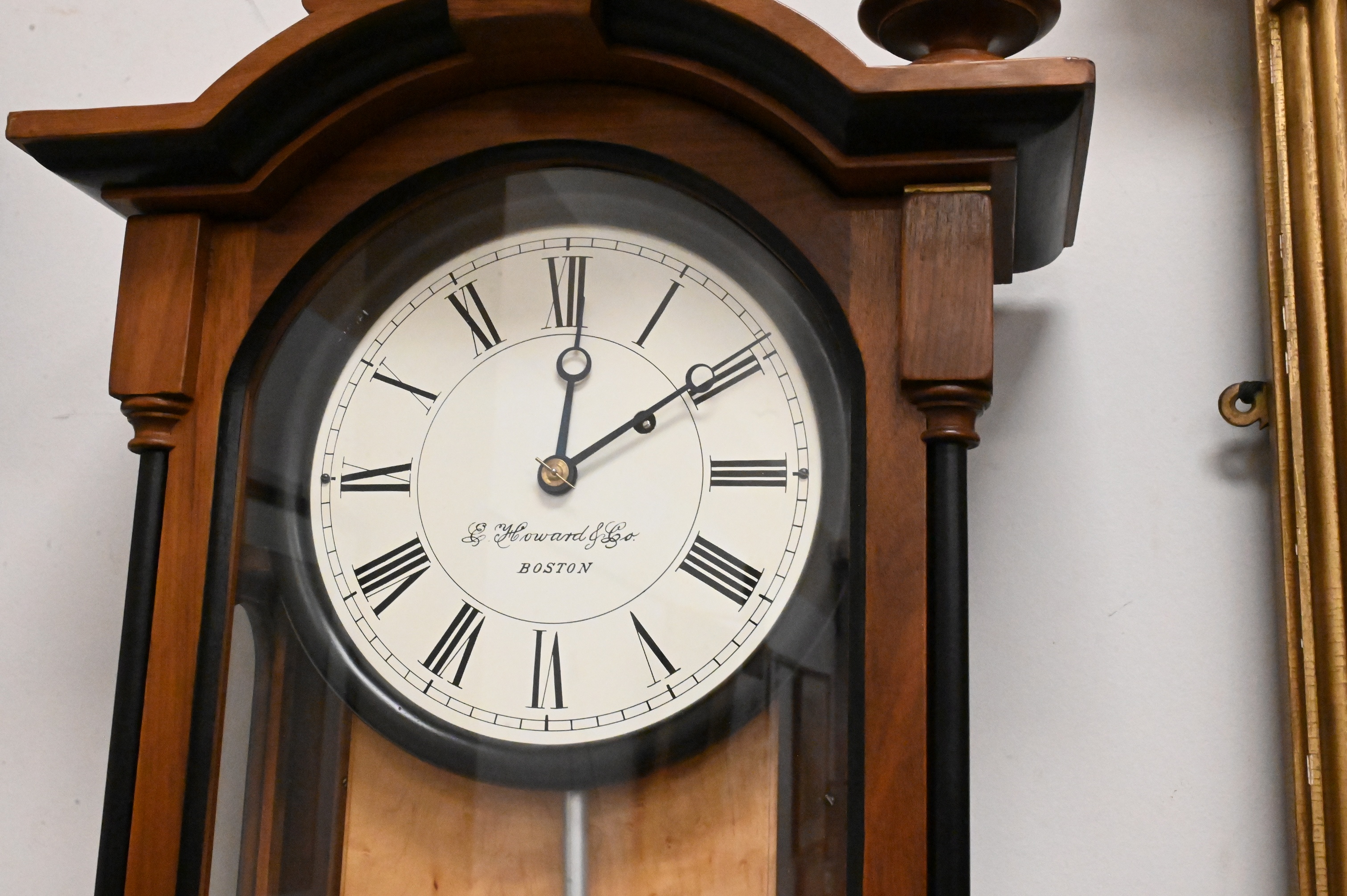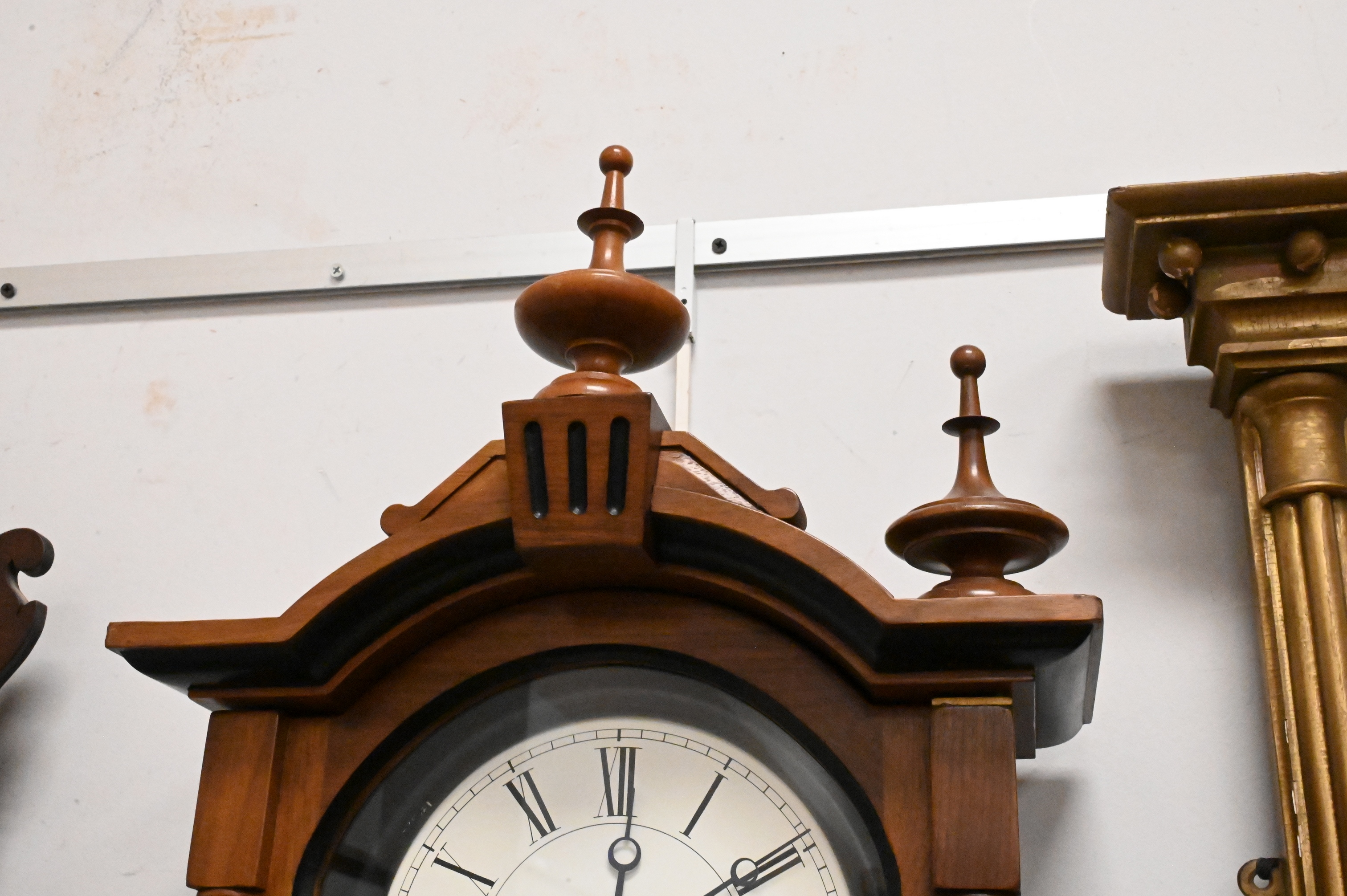 reissued wall clock having walnut case with ebonized trim, 8-day weight driven time movement, dial signed, missing one finial