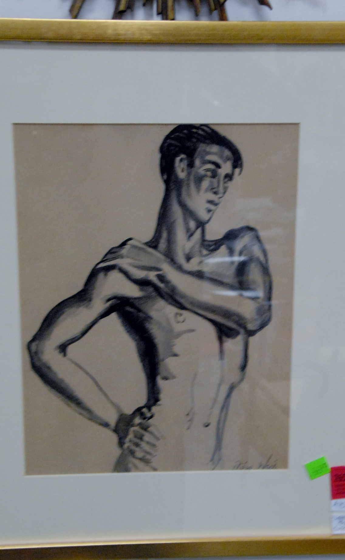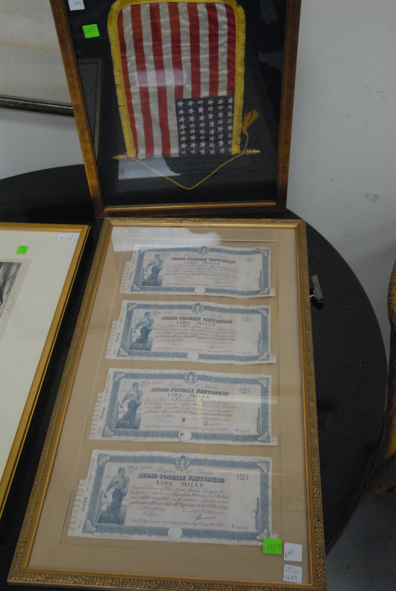 Lot 265: Four framed pieces framed flag, 4 Lire Mille Notes 1926 Bvono Postale Fruttifero, Umberto Romano print, and Irene Weis drawing.