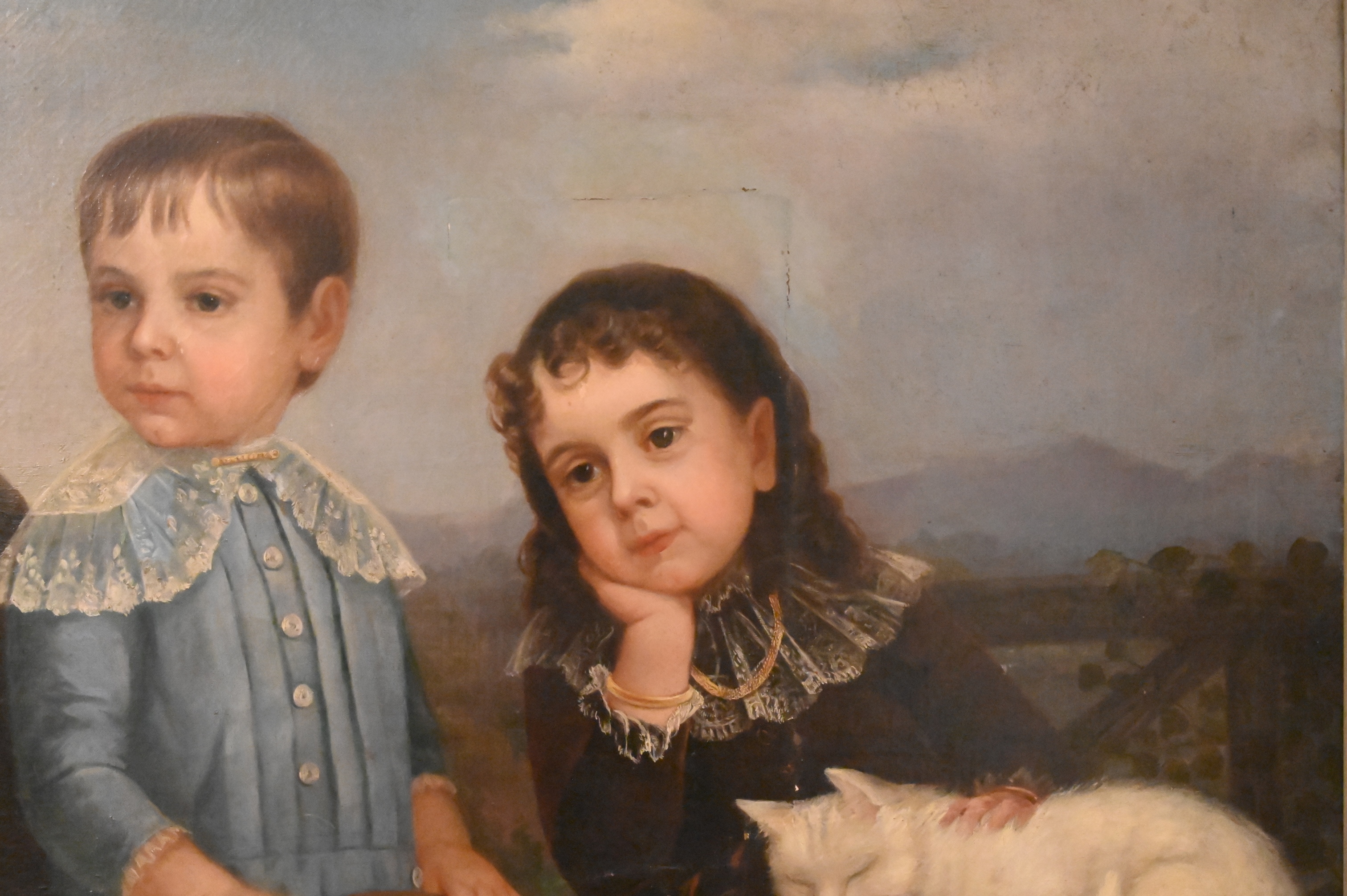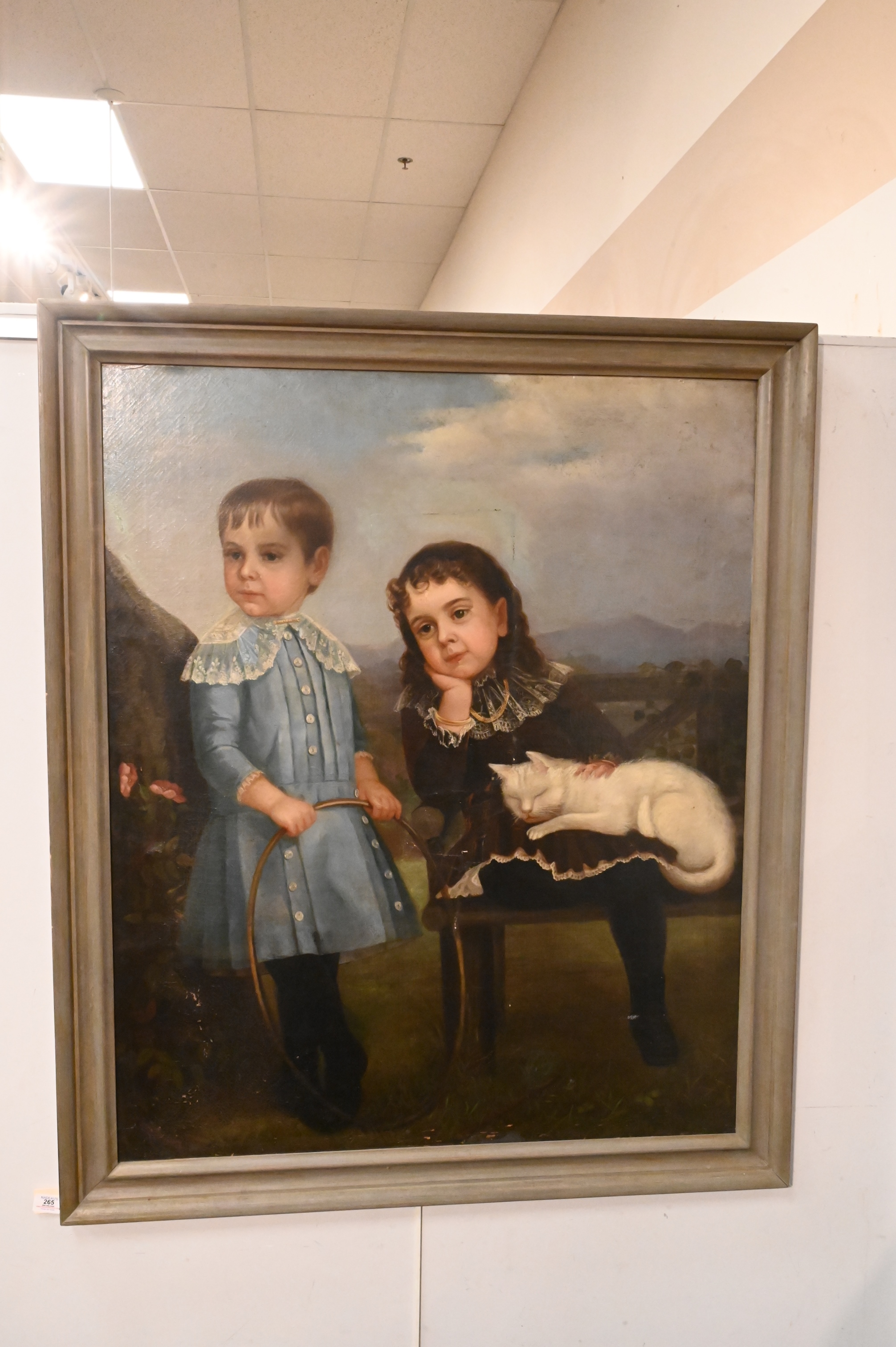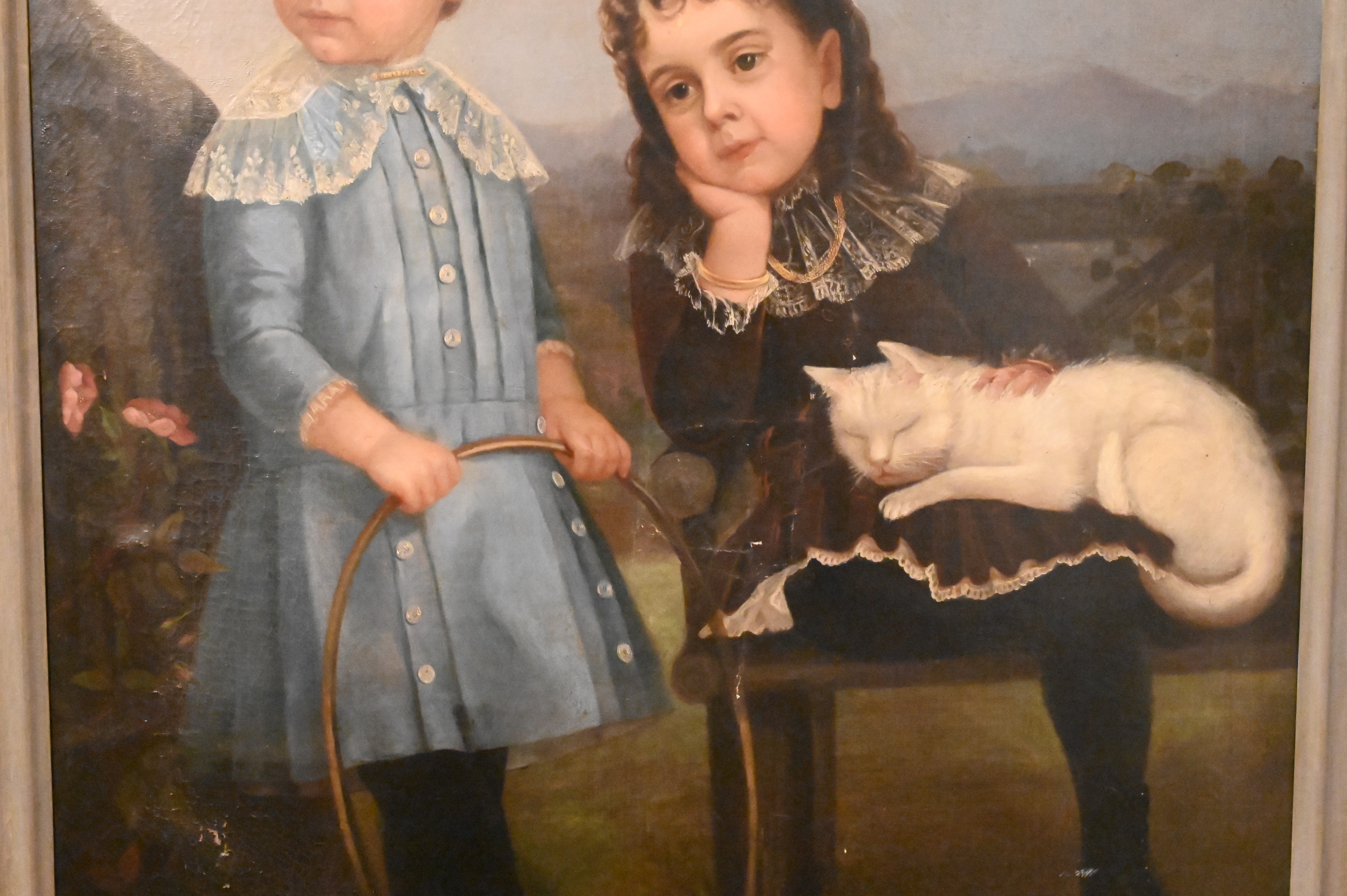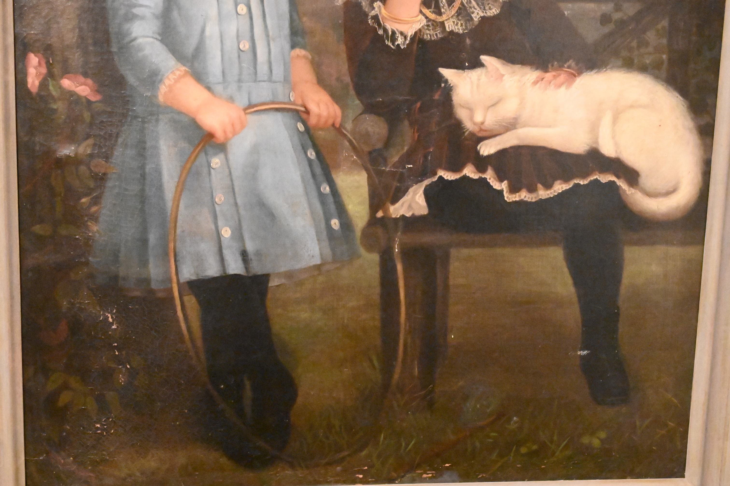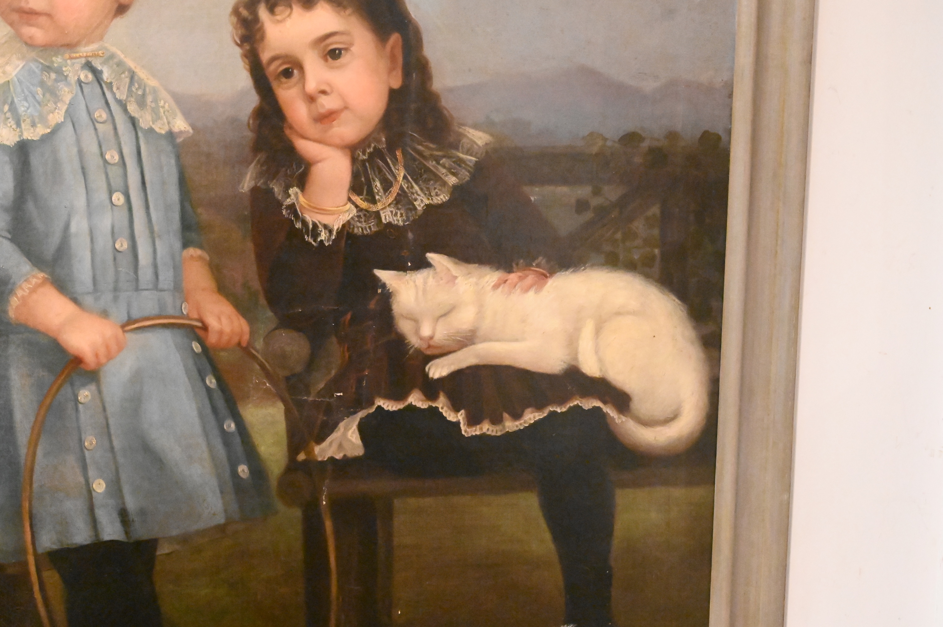 Featuring a boy in blue holding a hula hoop and girl petting a white cat