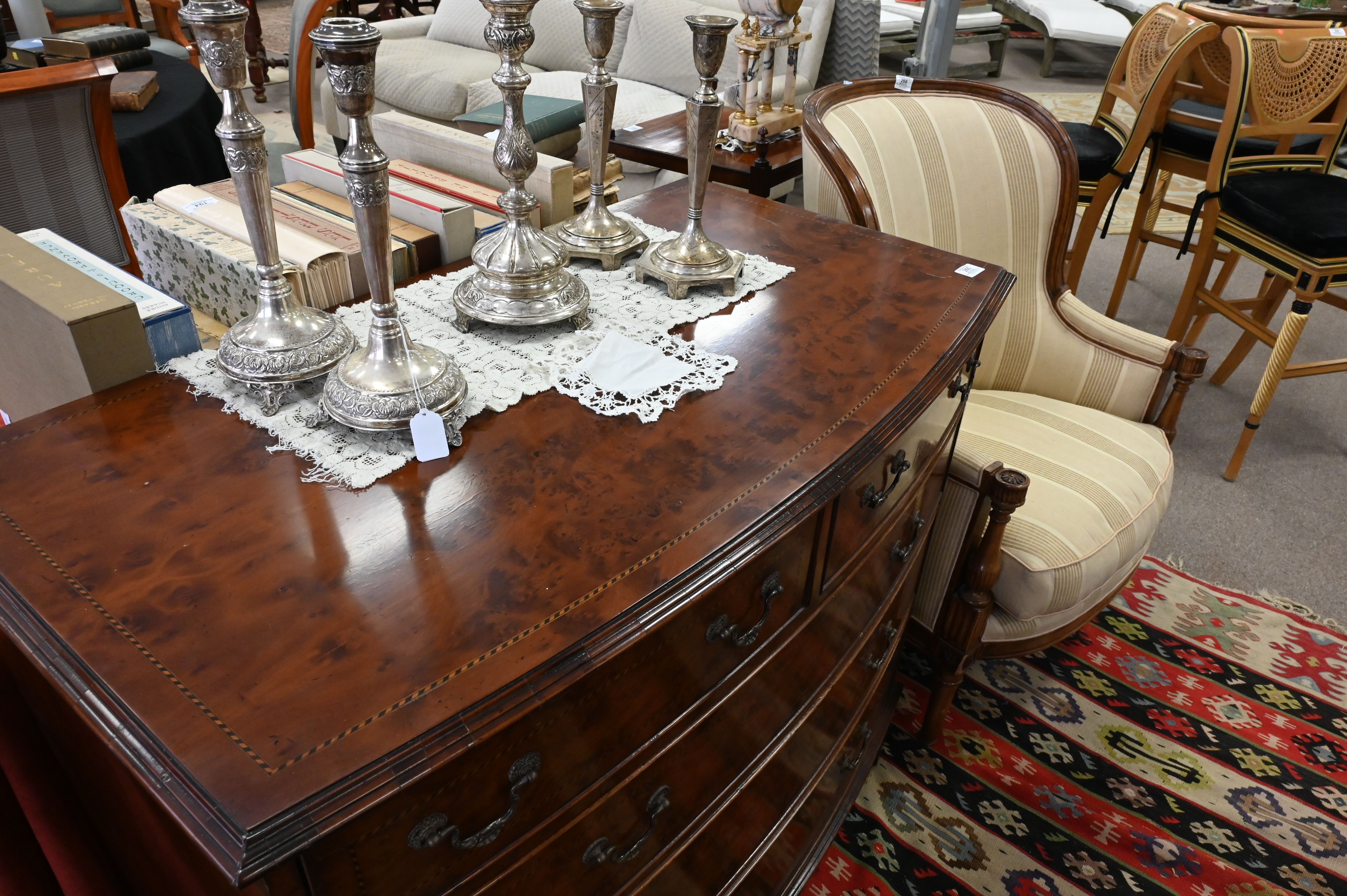 Lot 265: George IV Style Burlwood and Inlaid Two Over Three Drawer Bowed Front Chest