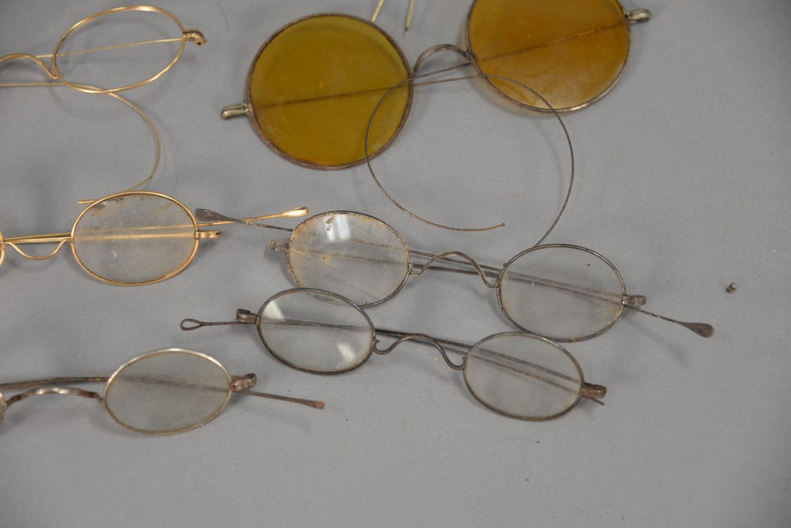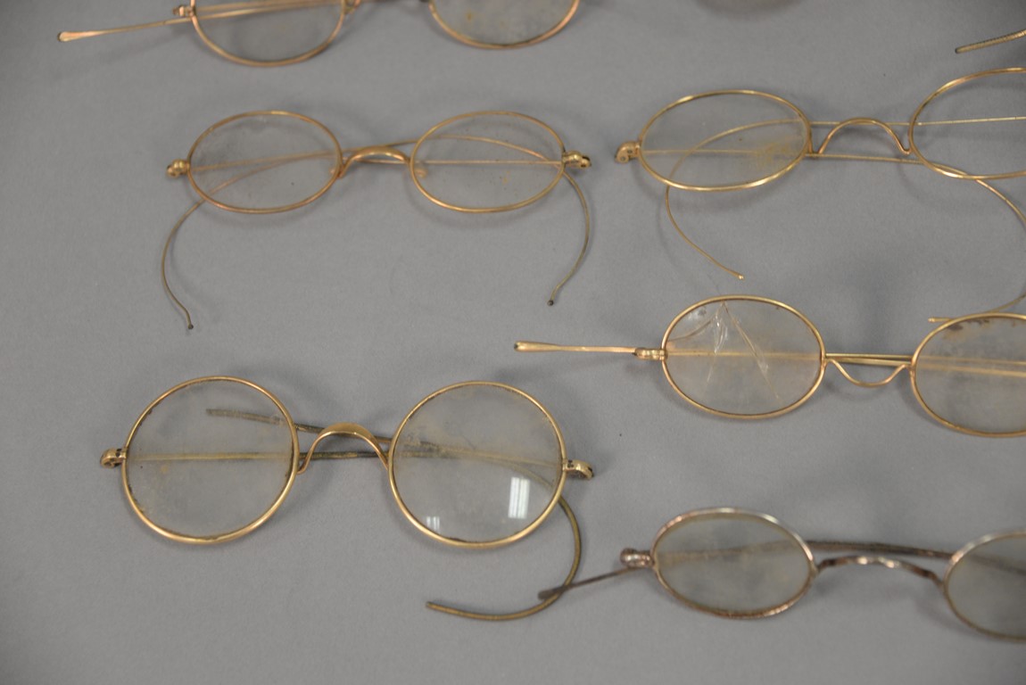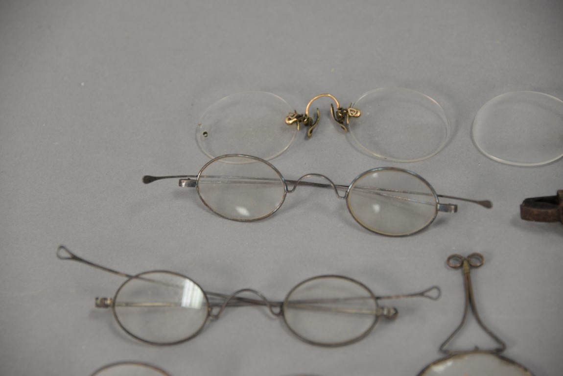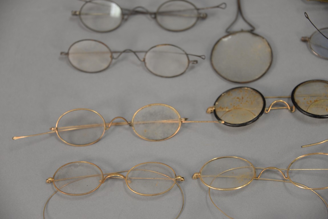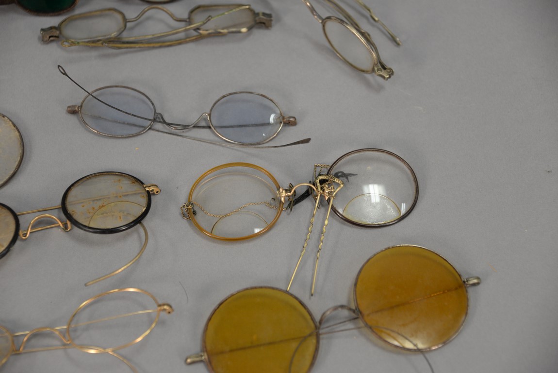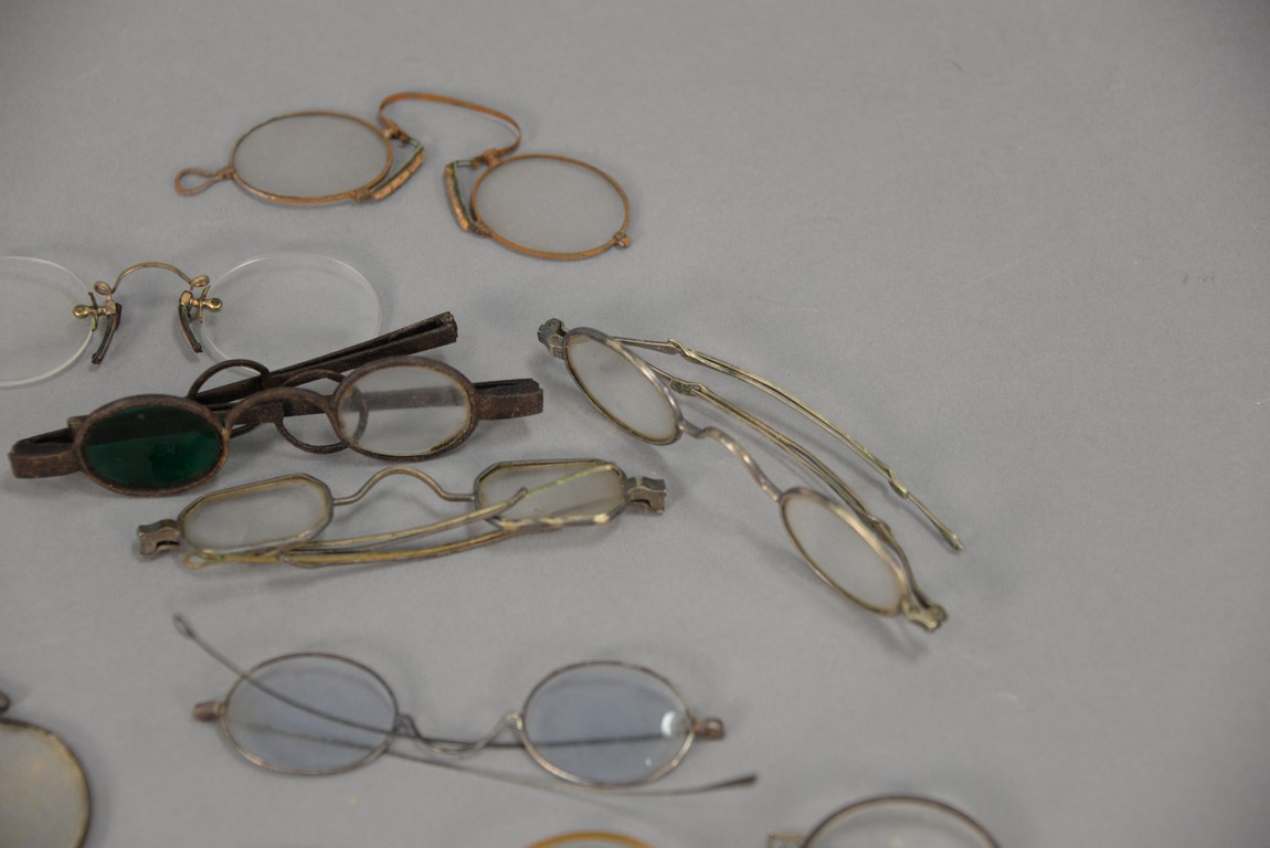 Group of approximately twenty-two early eyeglass spectacles, some with tinted glass.
