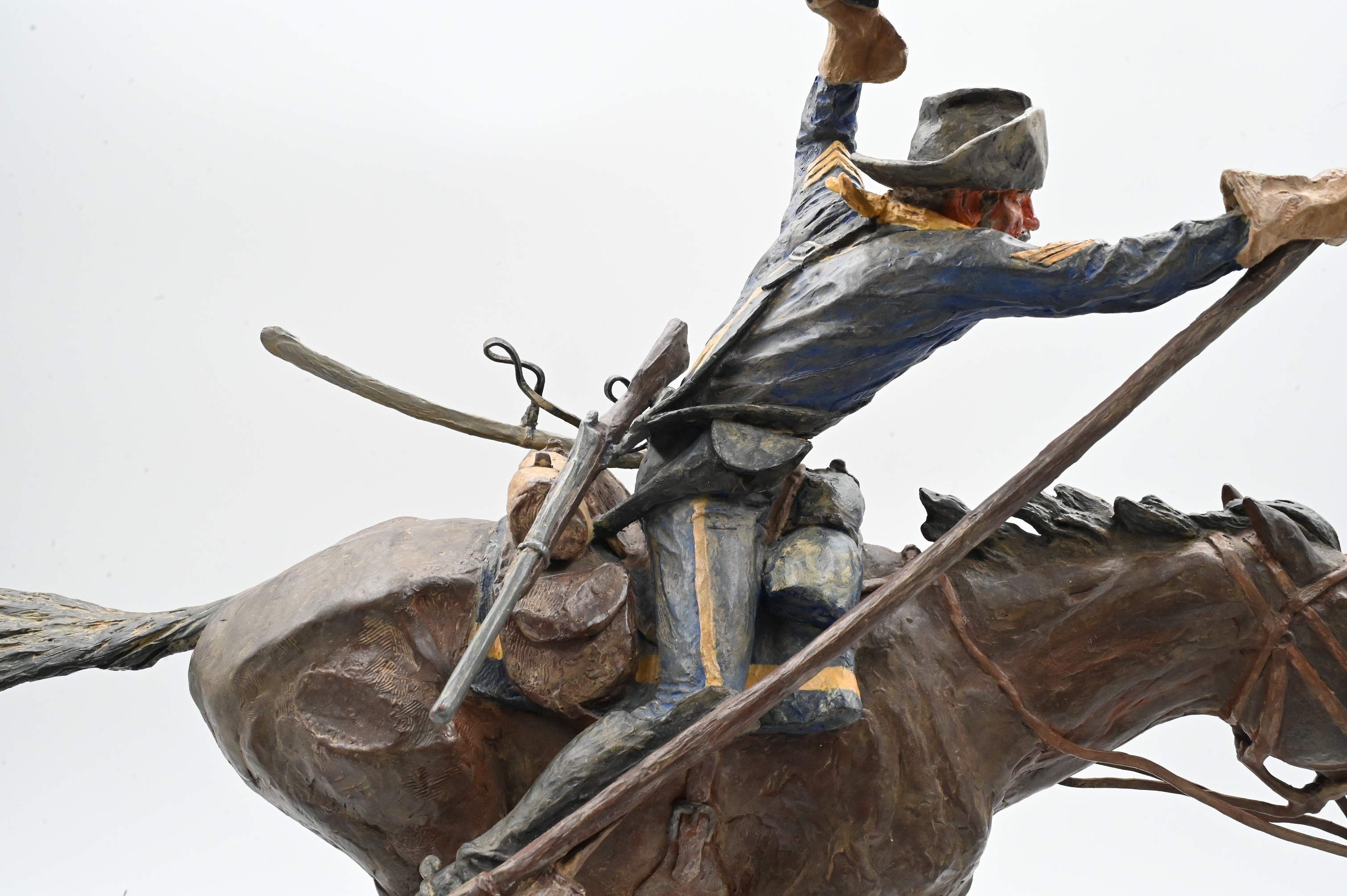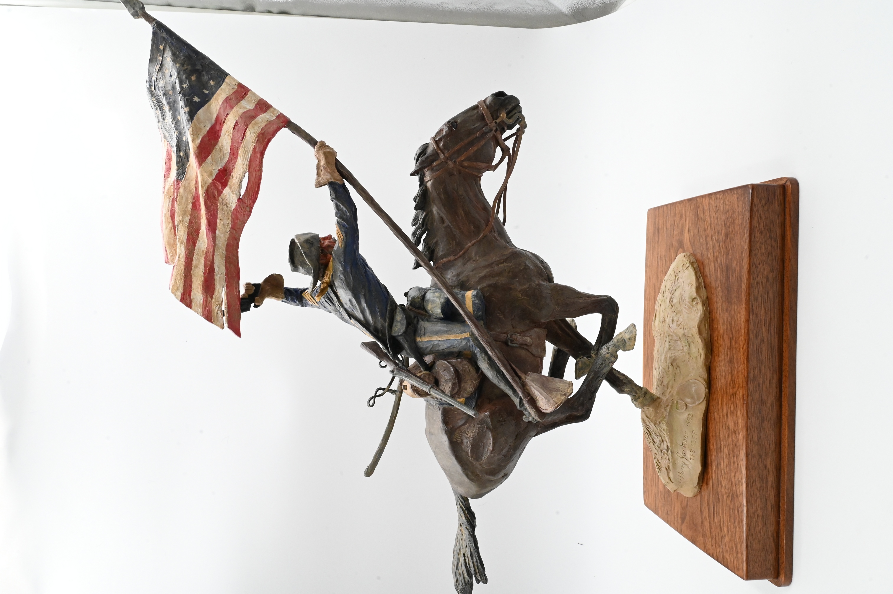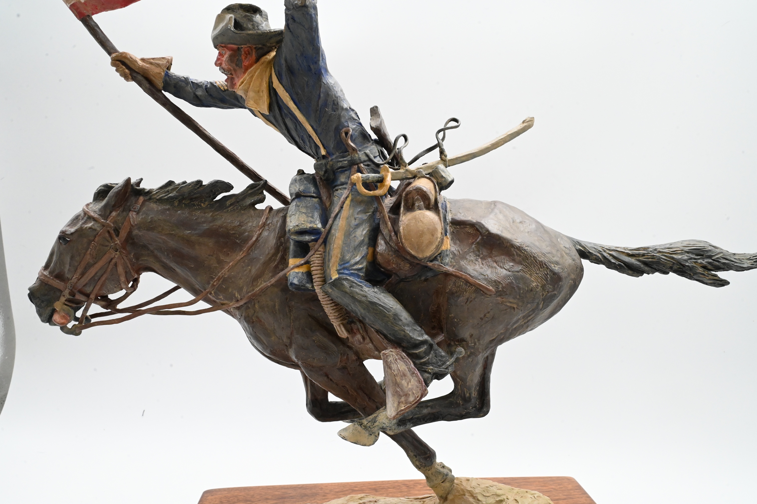 depicting a U.S. cavalry trooper at full gallop, brandishing a pistol in one hand while holding aloft a wind-tossed American flag in the other. Modeled with Harry Jackson’s hallmark intensity and motion, the surface is finished in egg/oil tempera on bronze, giving the work vivid coloration and painterly depth. The trooper’s uniform, tack, and equipment are rendered with exceptional detail, and the horse is shown in a powerful forward stride. Mounted on an oak display base with title plaque.