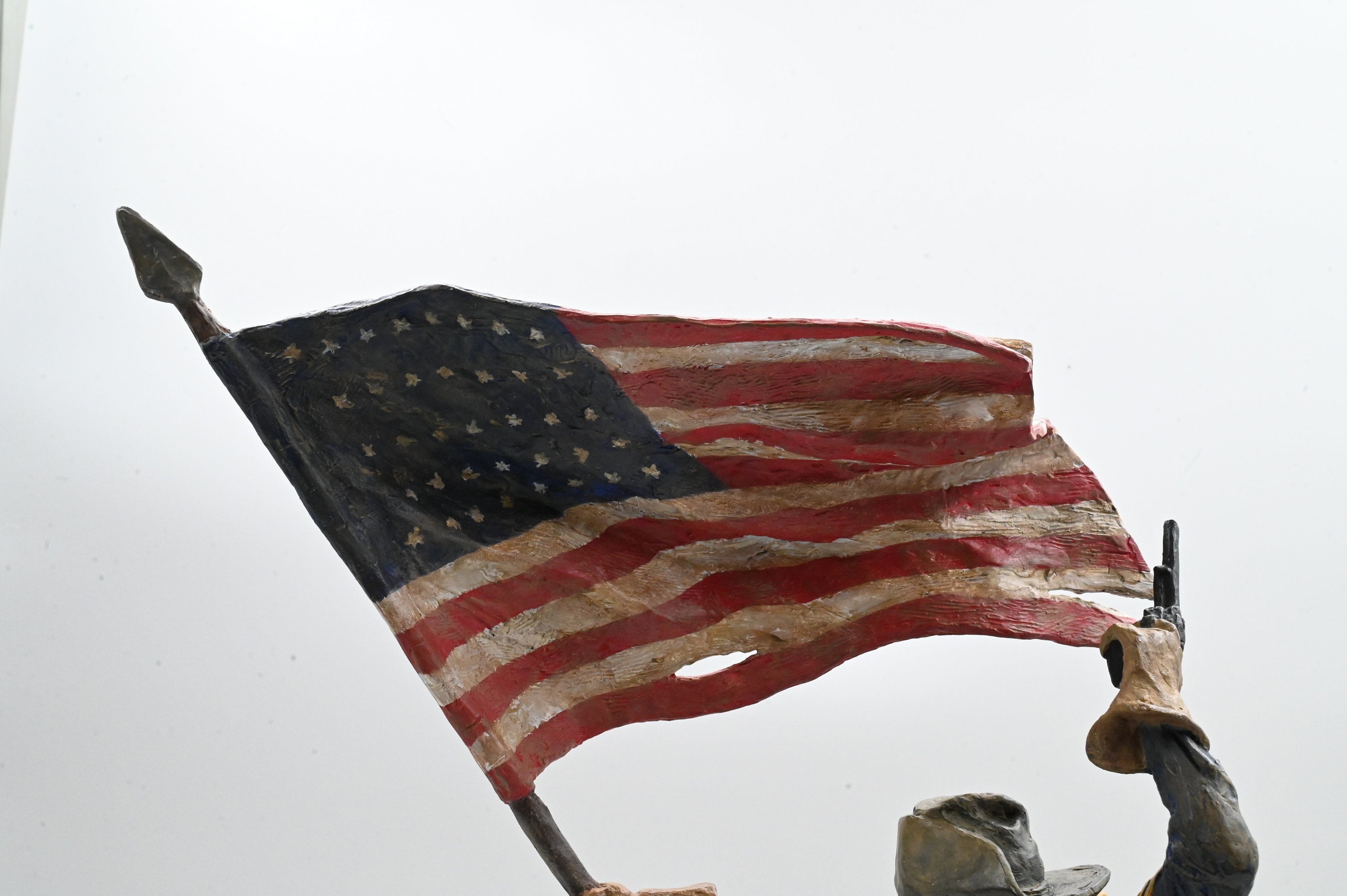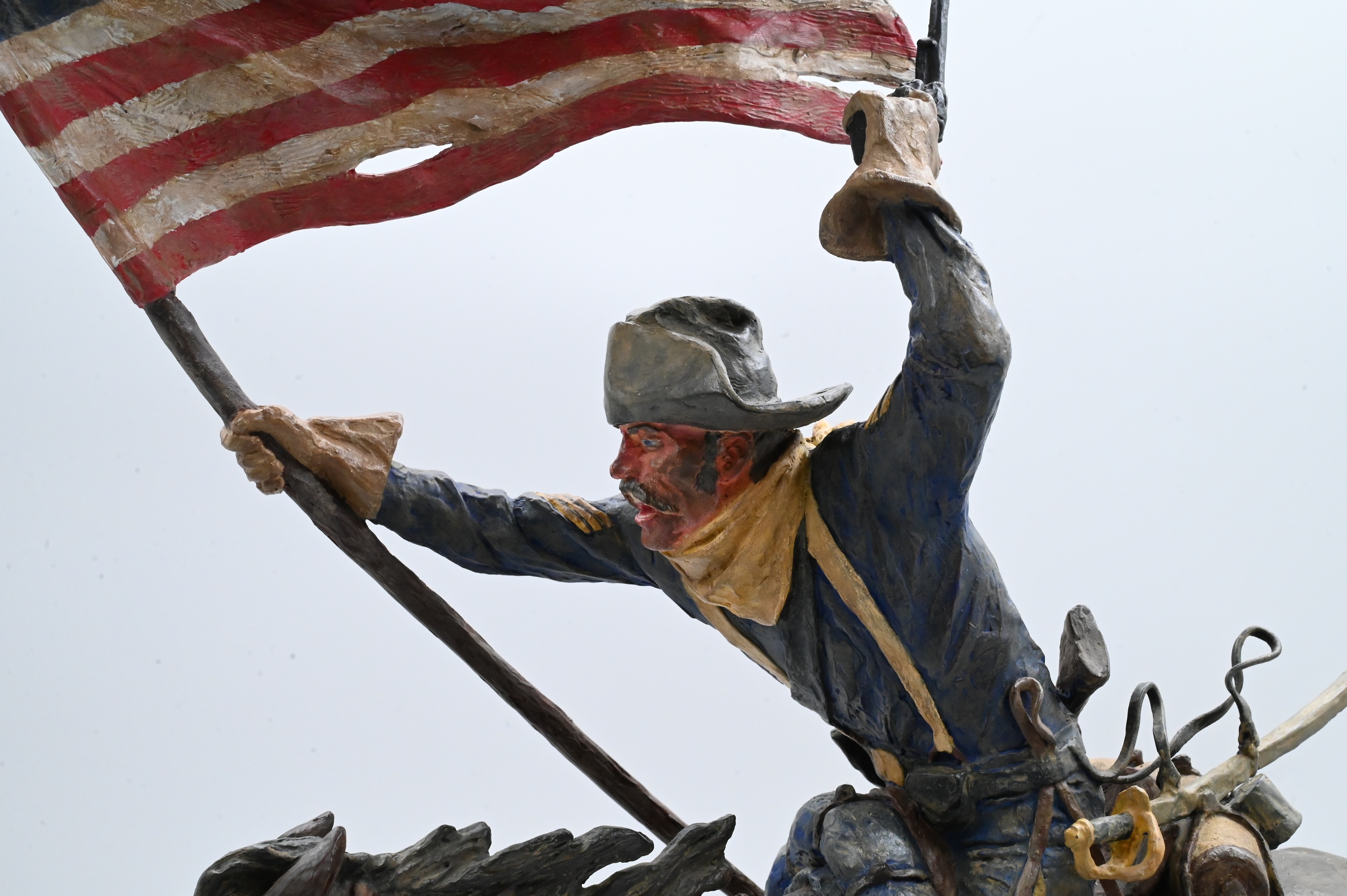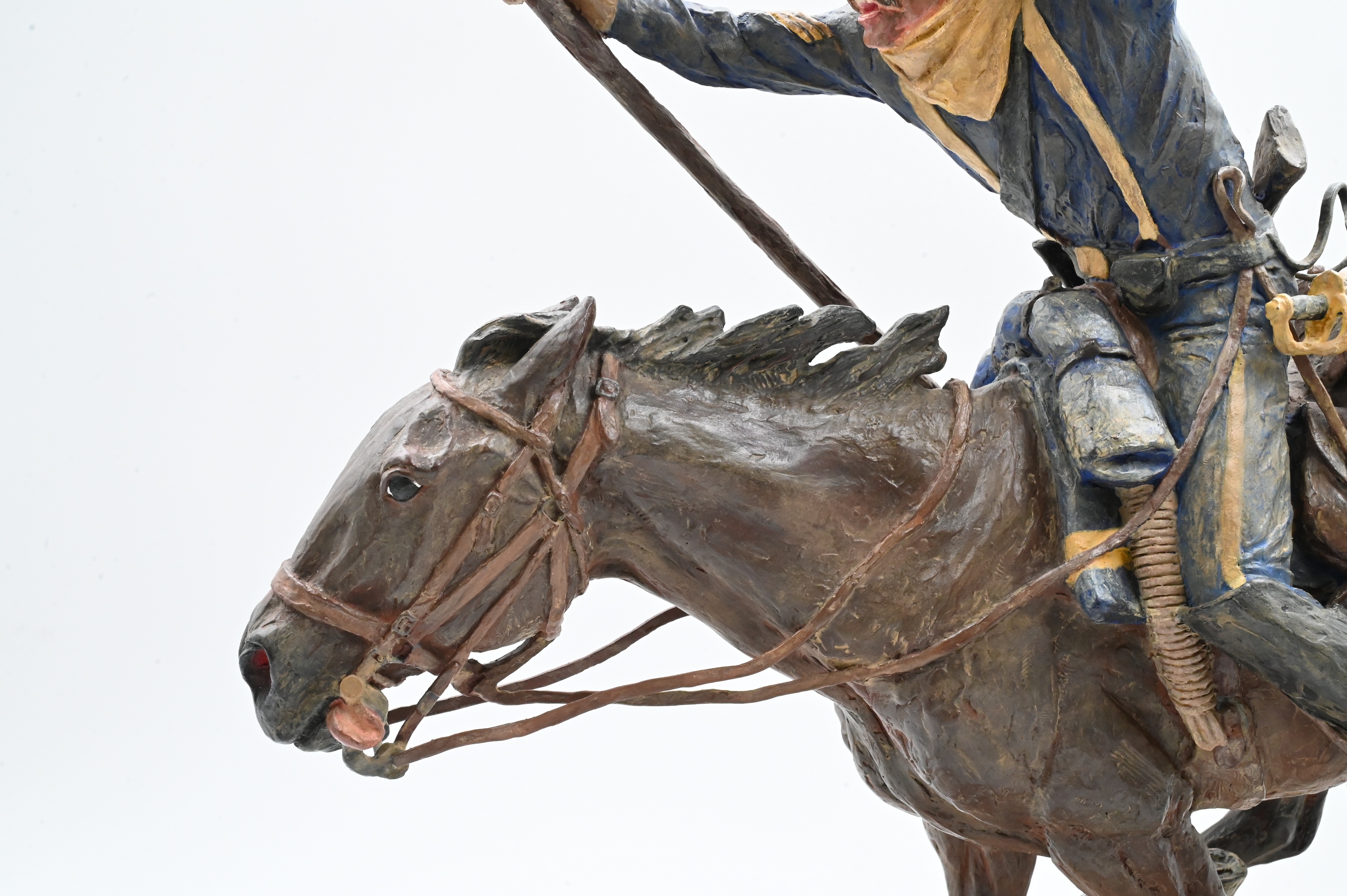 depicting a U.S. cavalry trooper at full gallop, brandishing a pistol in one hand while holding aloft a wind-tossed American flag in the other. Modeled with Harry Jackson’s hallmark intensity and motion, the surface is finished in egg/oil tempera on bronze, giving the work vivid coloration and painterly depth. The trooper’s uniform, tack, and equipment are rendered with exceptional detail, and the horse is shown in a powerful forward stride. Mounted on an oak display base with title plaque.