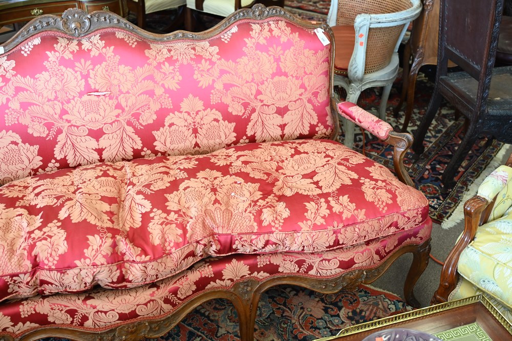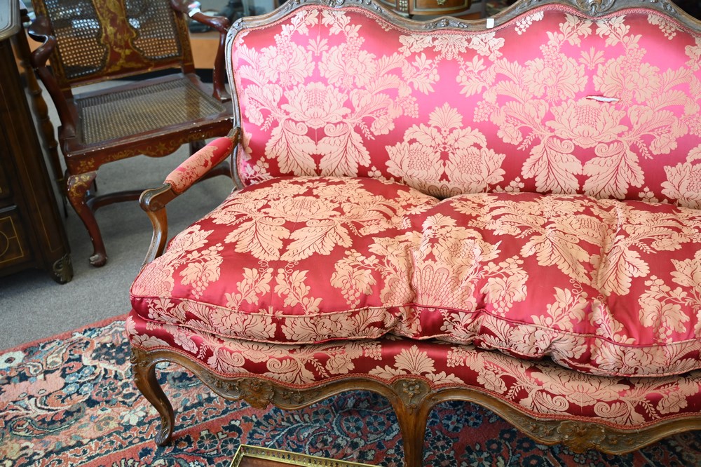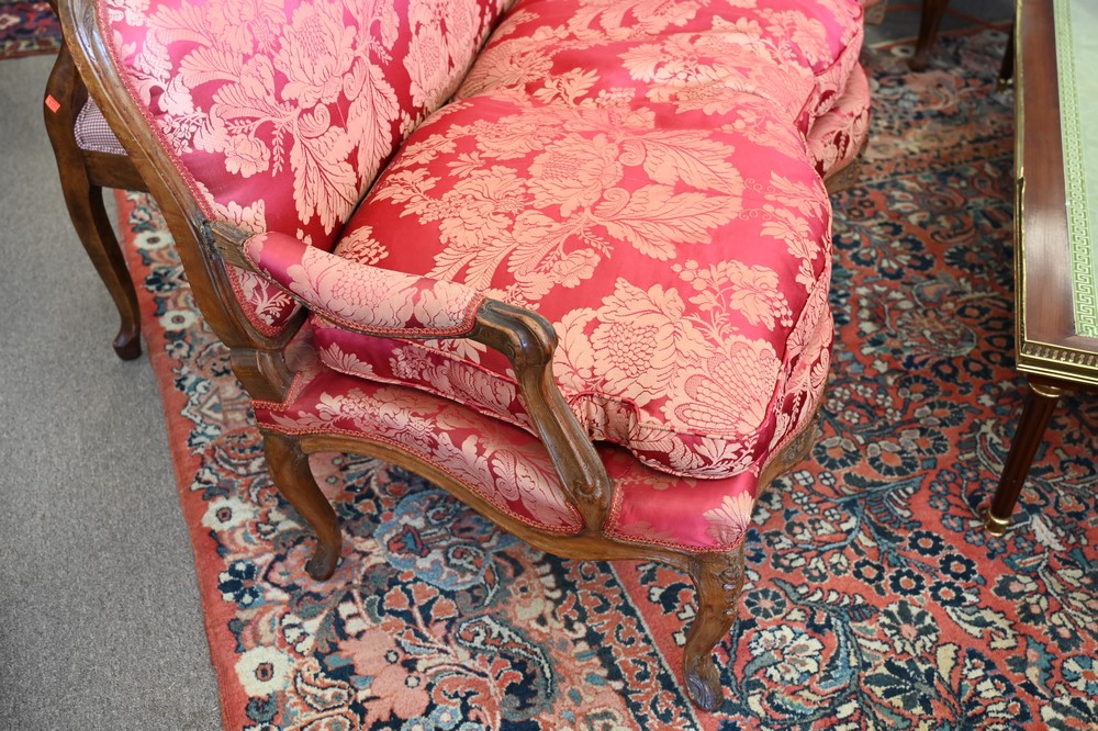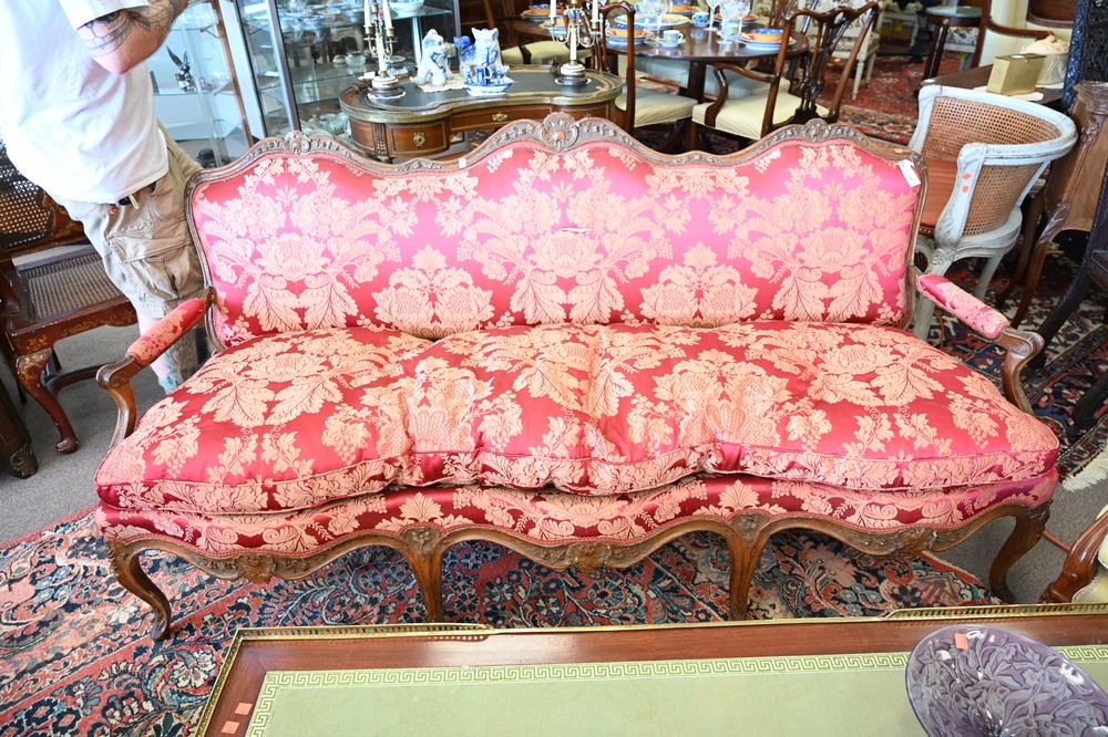 Lot 265: Louis XV 18th Century Sofa, having open arms and custom upholstery with serpentine front, one tear in back upholstery, restored, height 36 inches, length 80 inches.