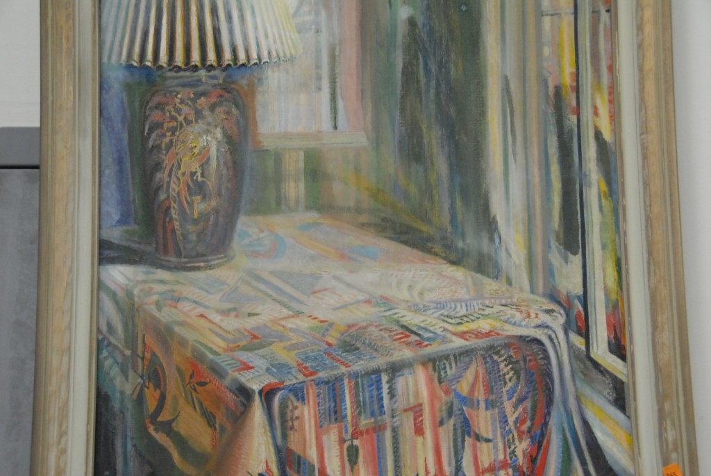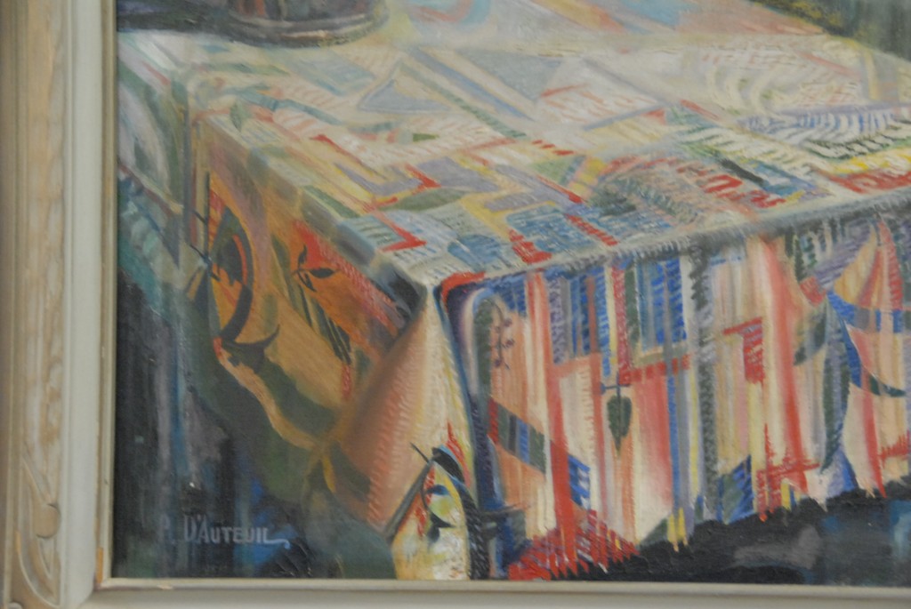 Oil on canvas interior scene a table with lamp on top signed lower left D’Auteuil.
