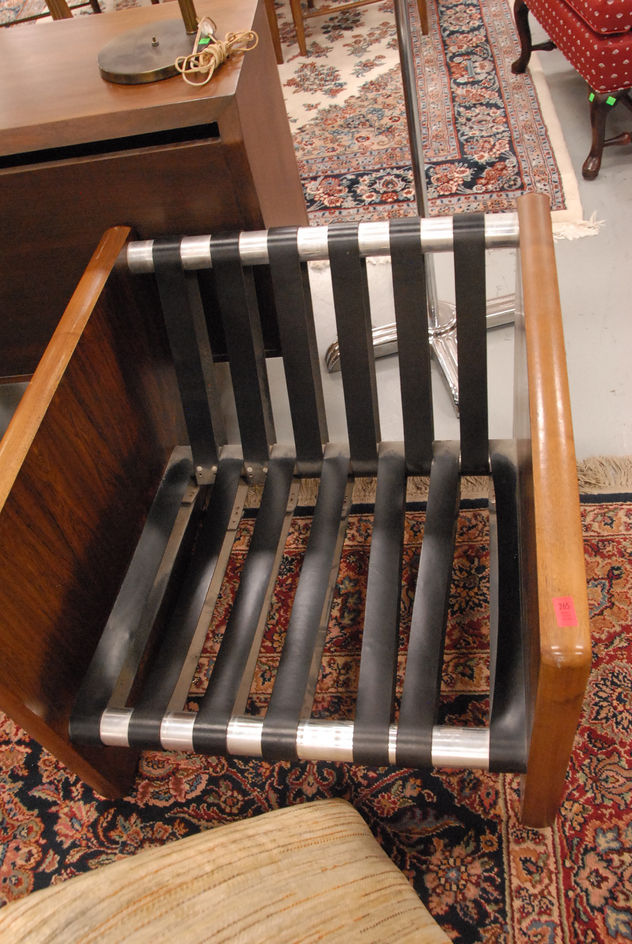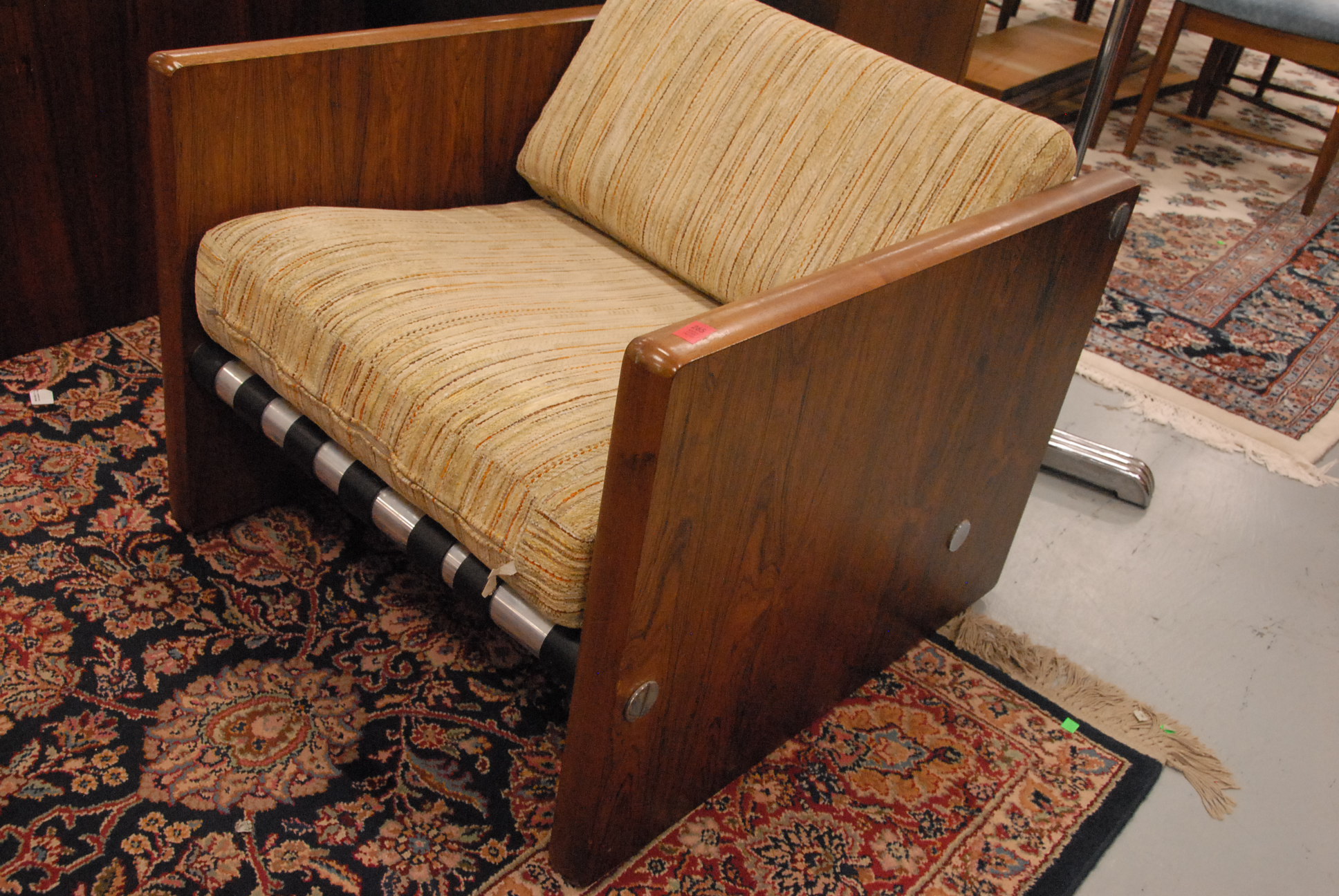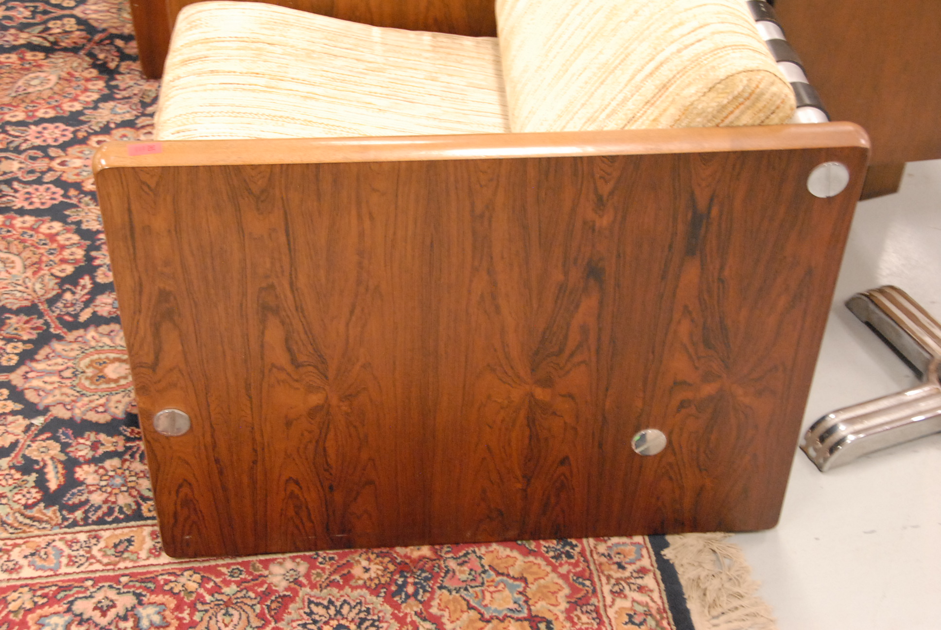 Lot 265: Pair of rosewood slab sided cube chairs with loose cushions supported by leather strapping and chrome cross beams, circa 1970, possi…