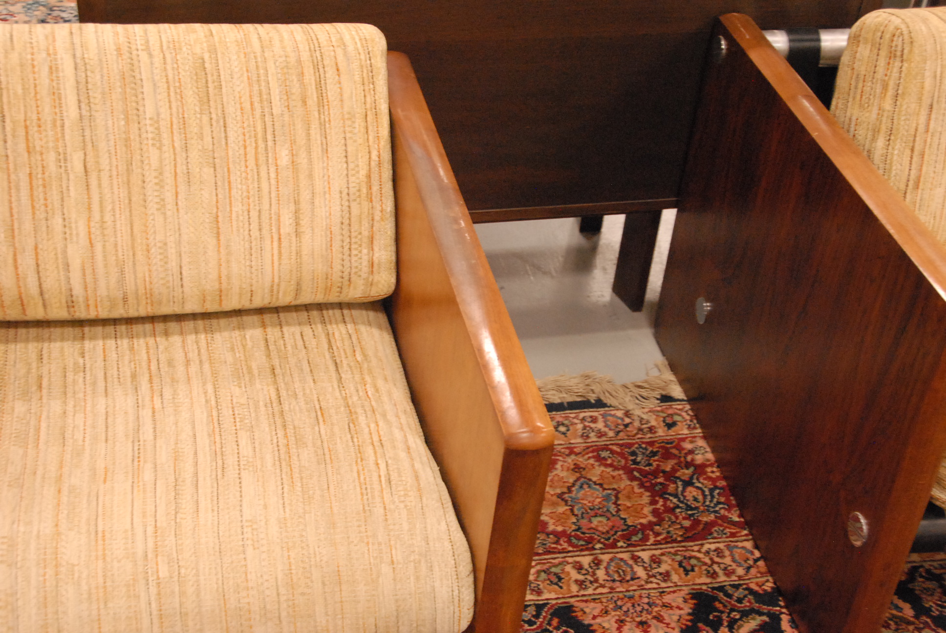 Pair of rosewood slab sided cube chairs with loose cushions supported by leather strapping and chrome cross beams, circa 1970, possibly Kagan.