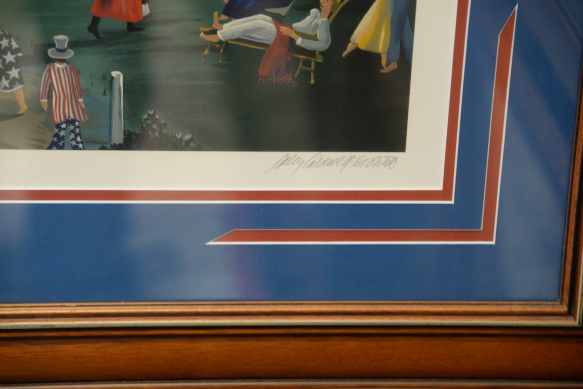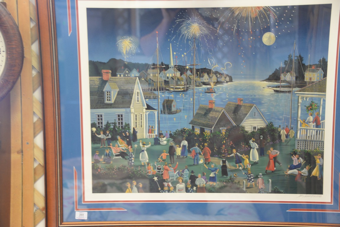 Sally Caldwell Fisher 1951 three prints including Beach Pier sight size 12 x 33, Ocean Edge sight size 23 1/2 x 31, and Fourth of July moonlit sky sight size 25 1/2 x 31 1/2.
