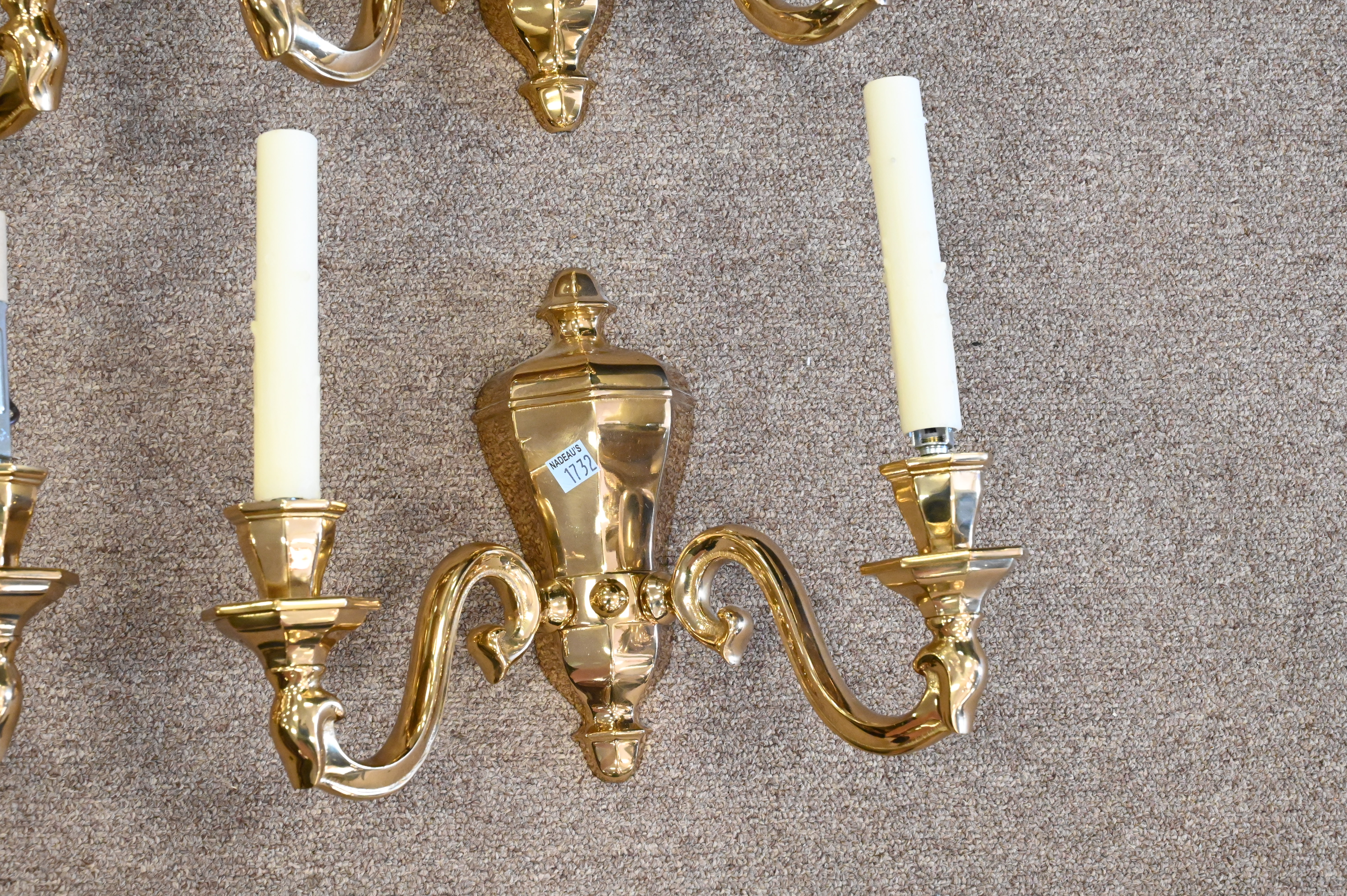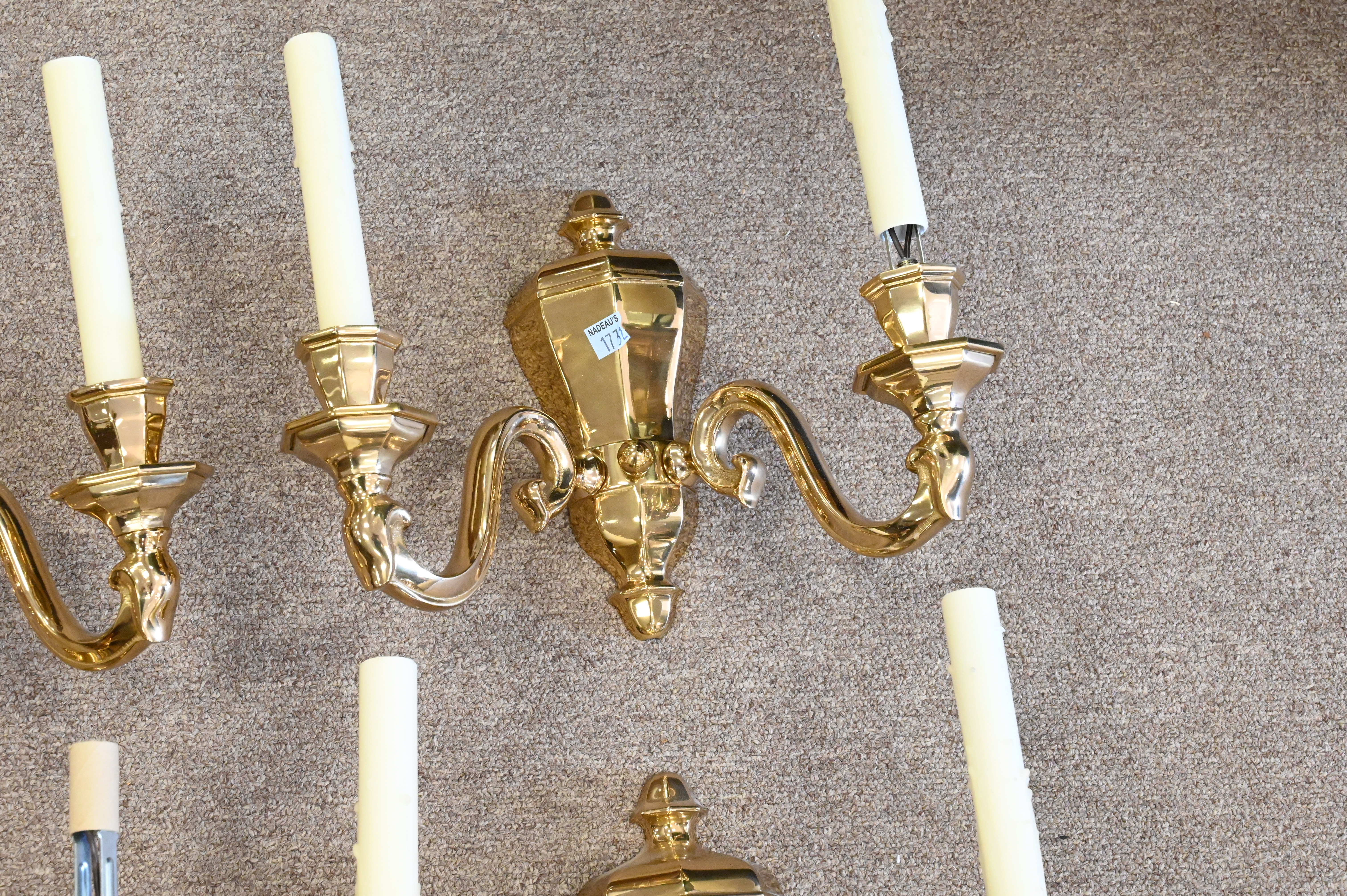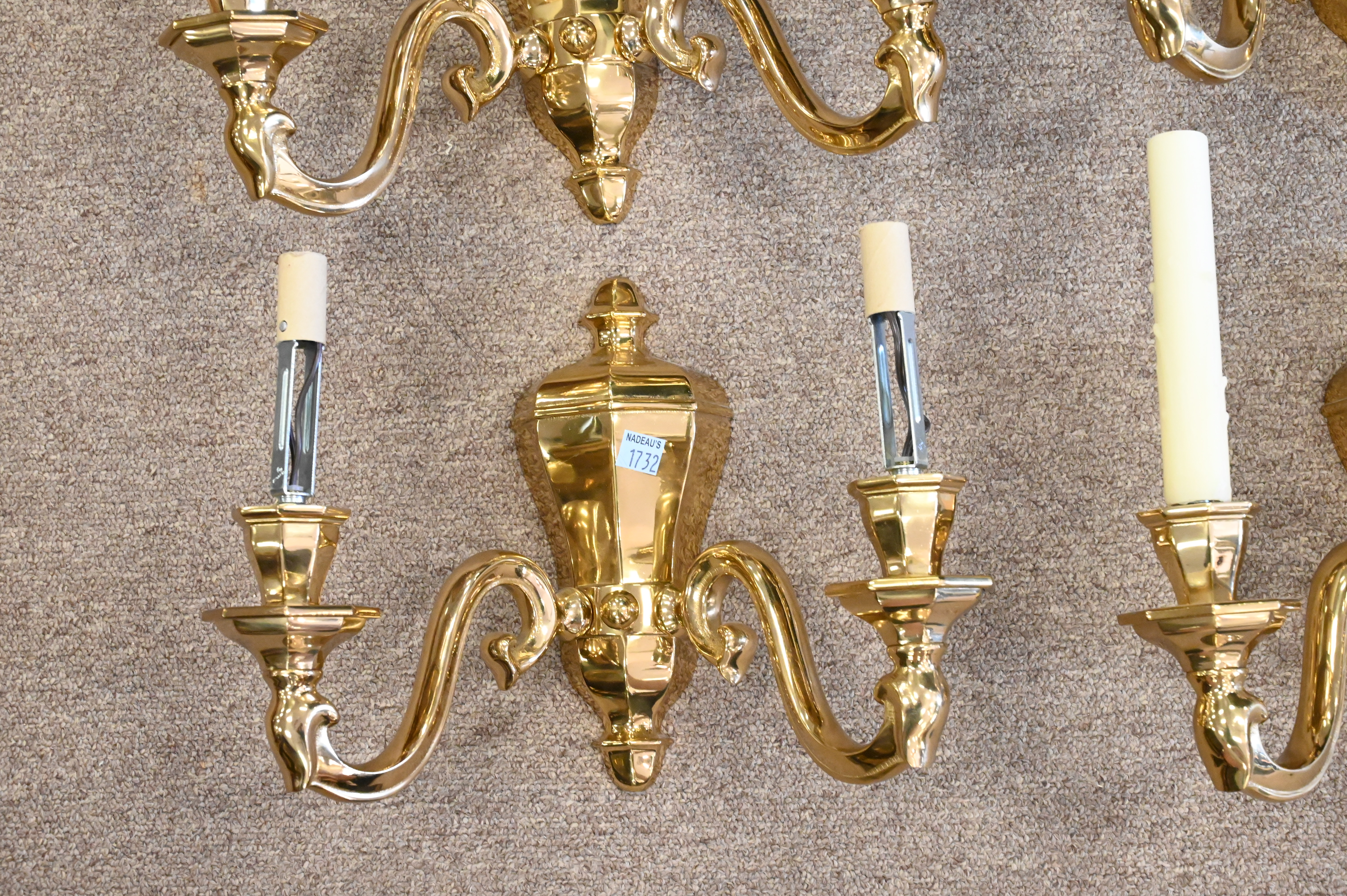Set of Four Brass Sconces, each having 2 scrolled arms, 1 missing faux candle sleeves. Approximate height 12 inches, width 12 inches