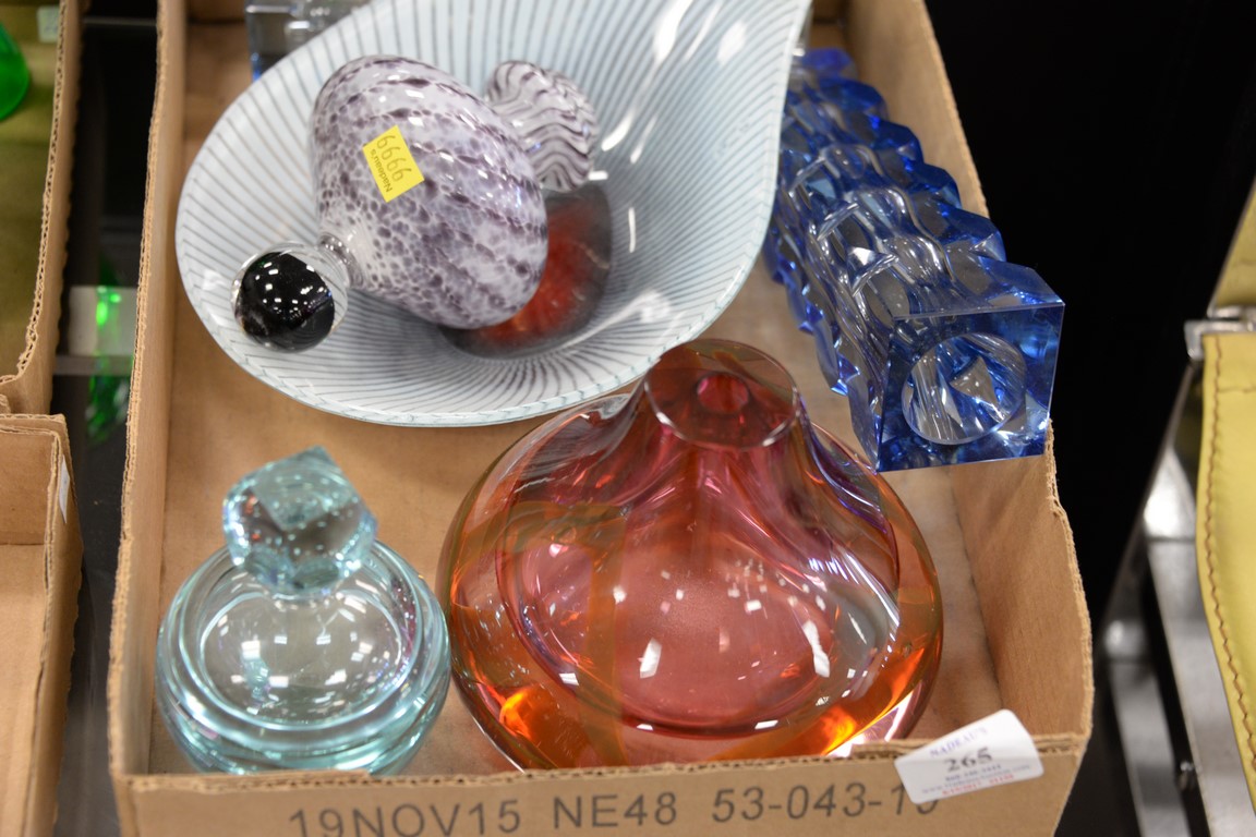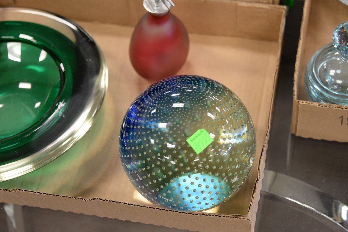 Lot 265: Three tray lots with Murano and art glass to include large bubble glass door stop, bowls, pink art glass vase, large green center bo…