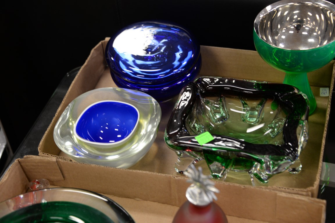 Three tray lots with Murano and art glass to include large bubble glass door stop, bowls, pink art glass vase, large green center bowl, paperweight, clear with blue glass bowl, Alessi compote, Moser covered dish, and pair of Oldrich Lipsky Exbor undulating art glass vases marked Exbor Czechoslovakia with etched stamp.