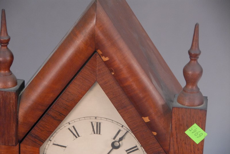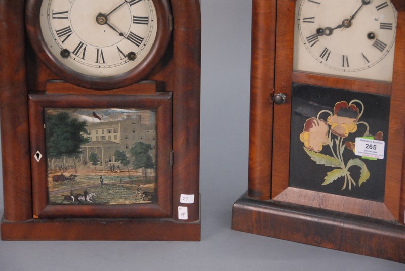 Lot 265: Two mahogany mantle clocks to include a steeple clock with flower painted glass bottom and a beehive clock with painted scene in bot…