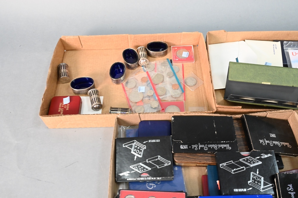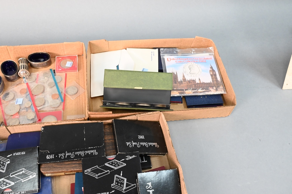 Lot 265: Two Tray Lots, to include ten proof sets, 1970’s – 1980’s, 1980’s mint sets, two bicentennial proof sets, six silver ingots, 20 grams each, Queen Elizabeth II July 1981, .999 fine.