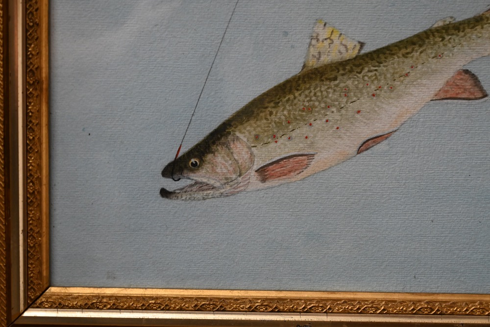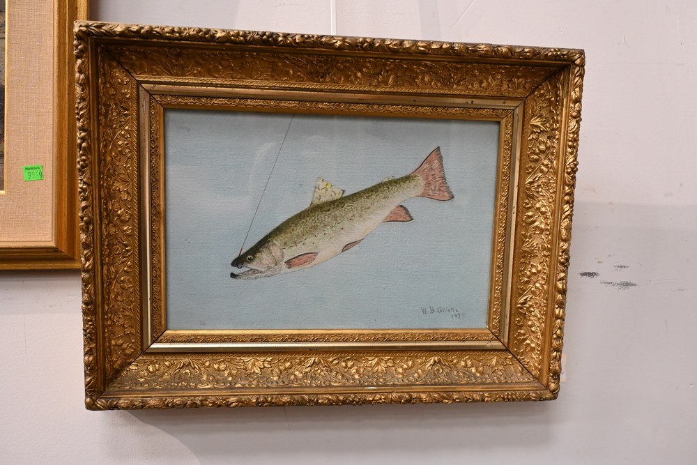 Lot 265: William Gillette American/Canadian, 1864 – 1939 Trout watercolor and pencil on paper in victorian gilt frame signed and dated lower right “W.B. Gillette 1897” sight size 9 3/4 x 14 3/4 inches