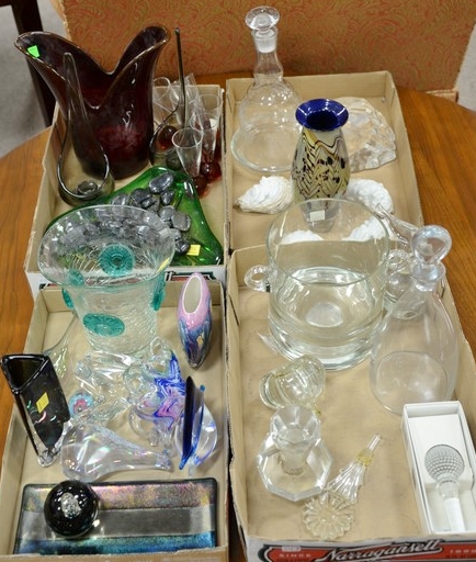 Four box lots of art glass vases, Venetian glass vases, Versace Rosenthal bottle stopper, sterling cut glass ice bucket, three crystal perfumes, and two crystal decanters. Provenance: Estate of Arthur C. Pintor, MD
