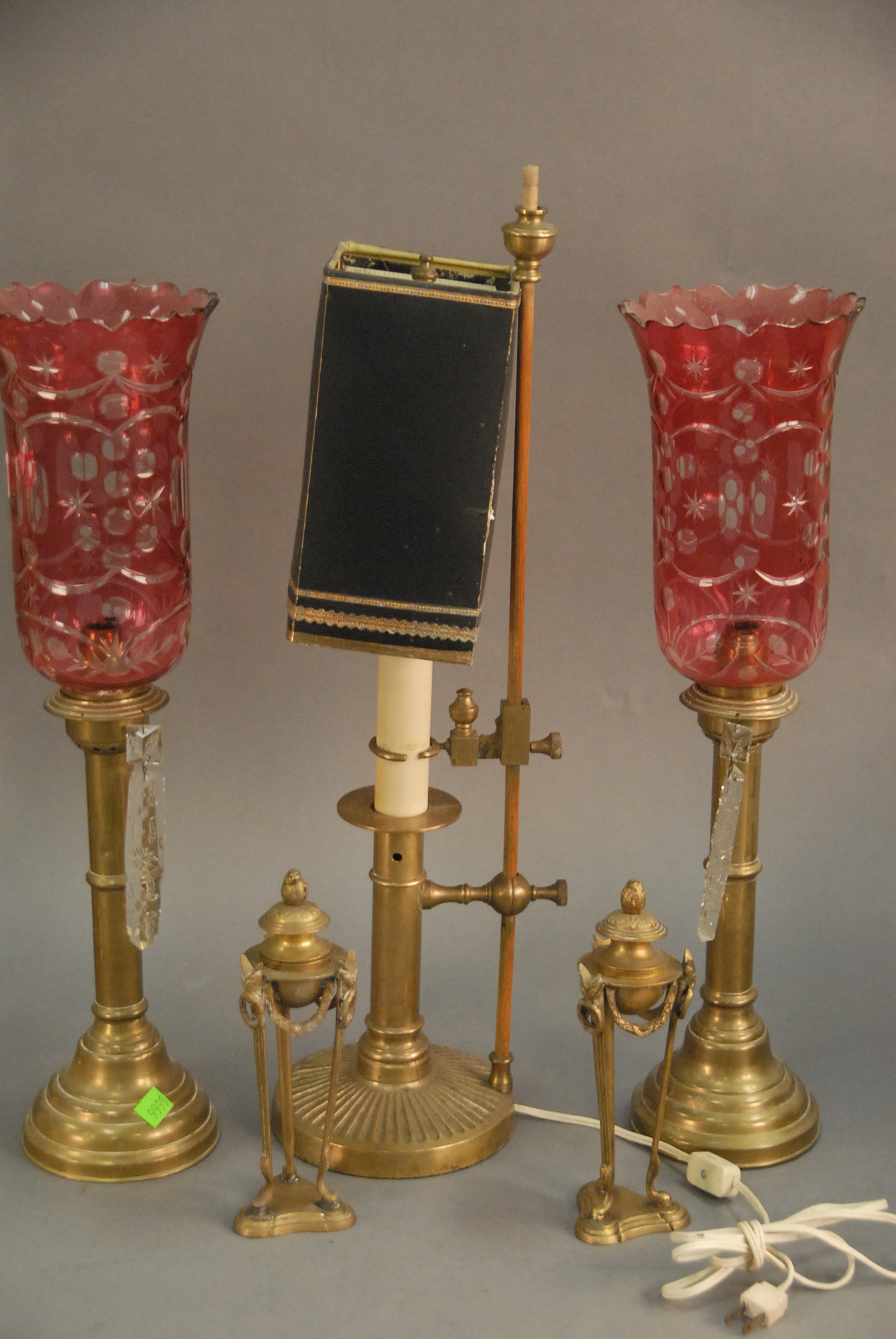Five piece brass lot to include pair of candlesticks with cranberry shades, pair of urns, and an adjustable lamp.