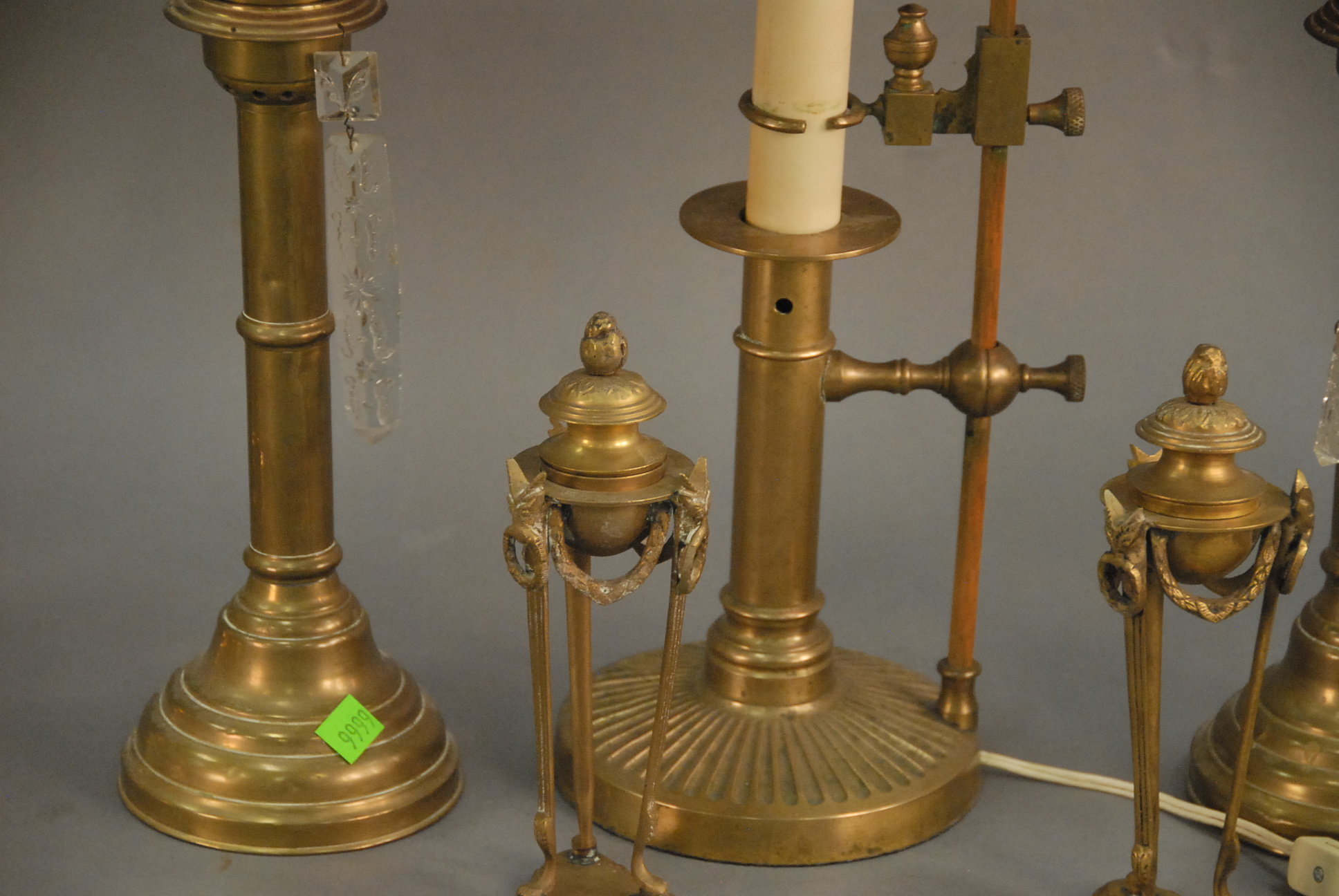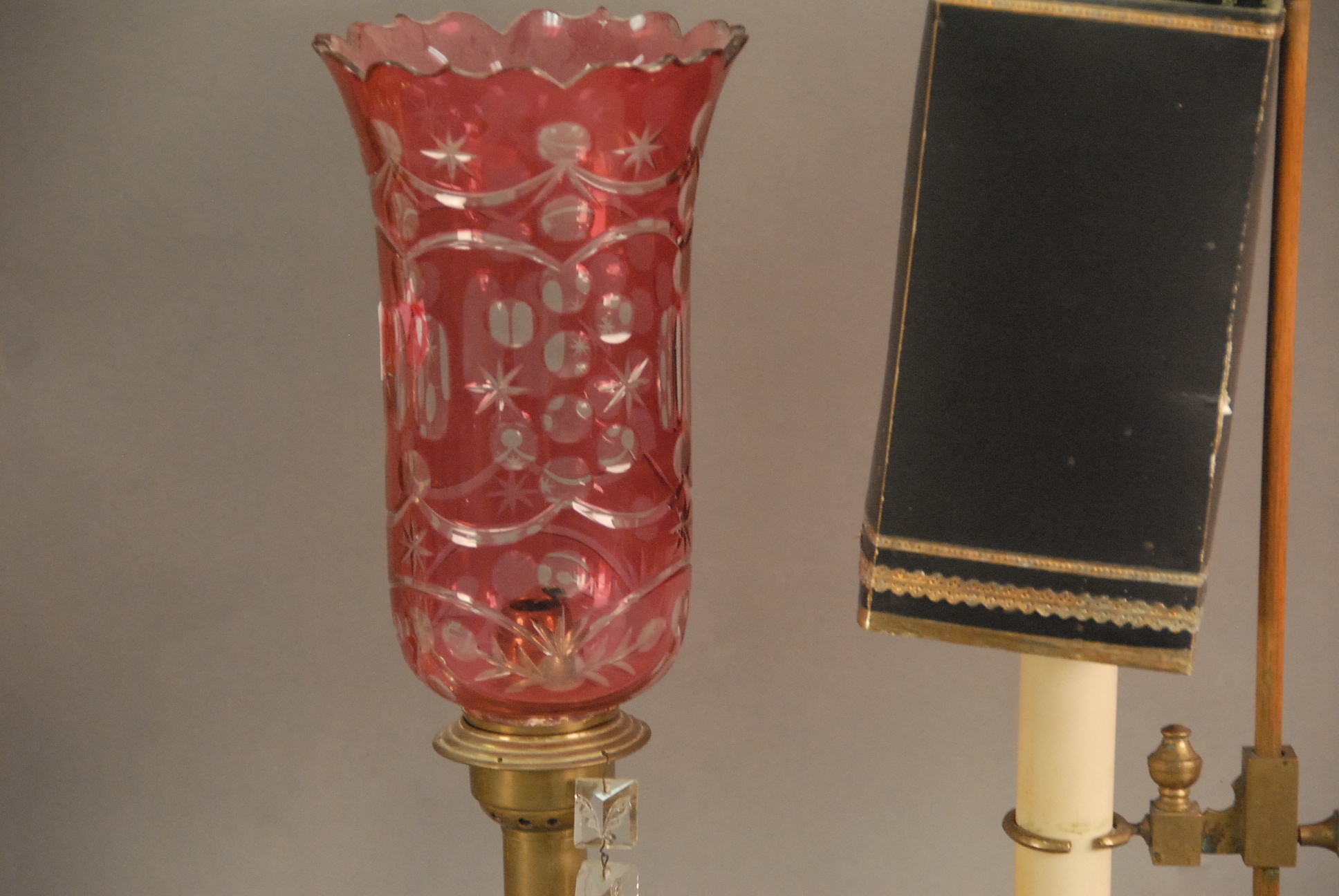 Lot 266: Five piece brass lot to include pair of candlesticks with cranberry shades, pair of urns, and an adjustable lamp.