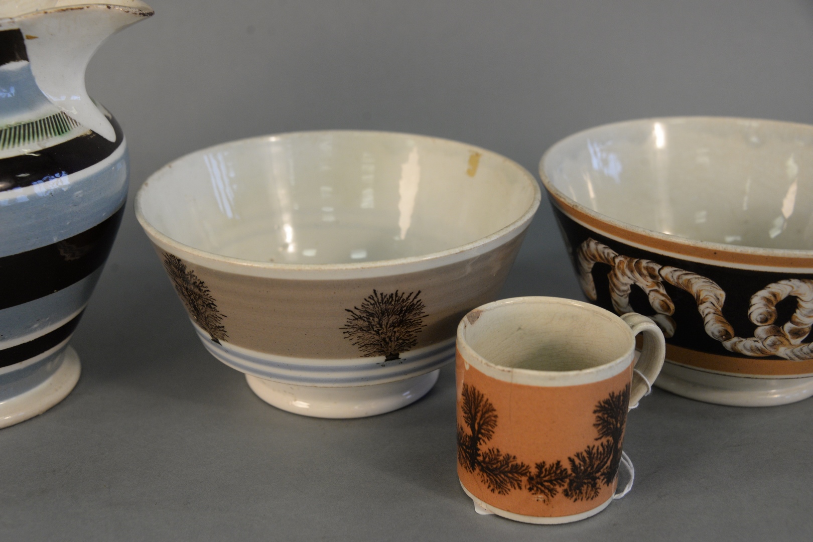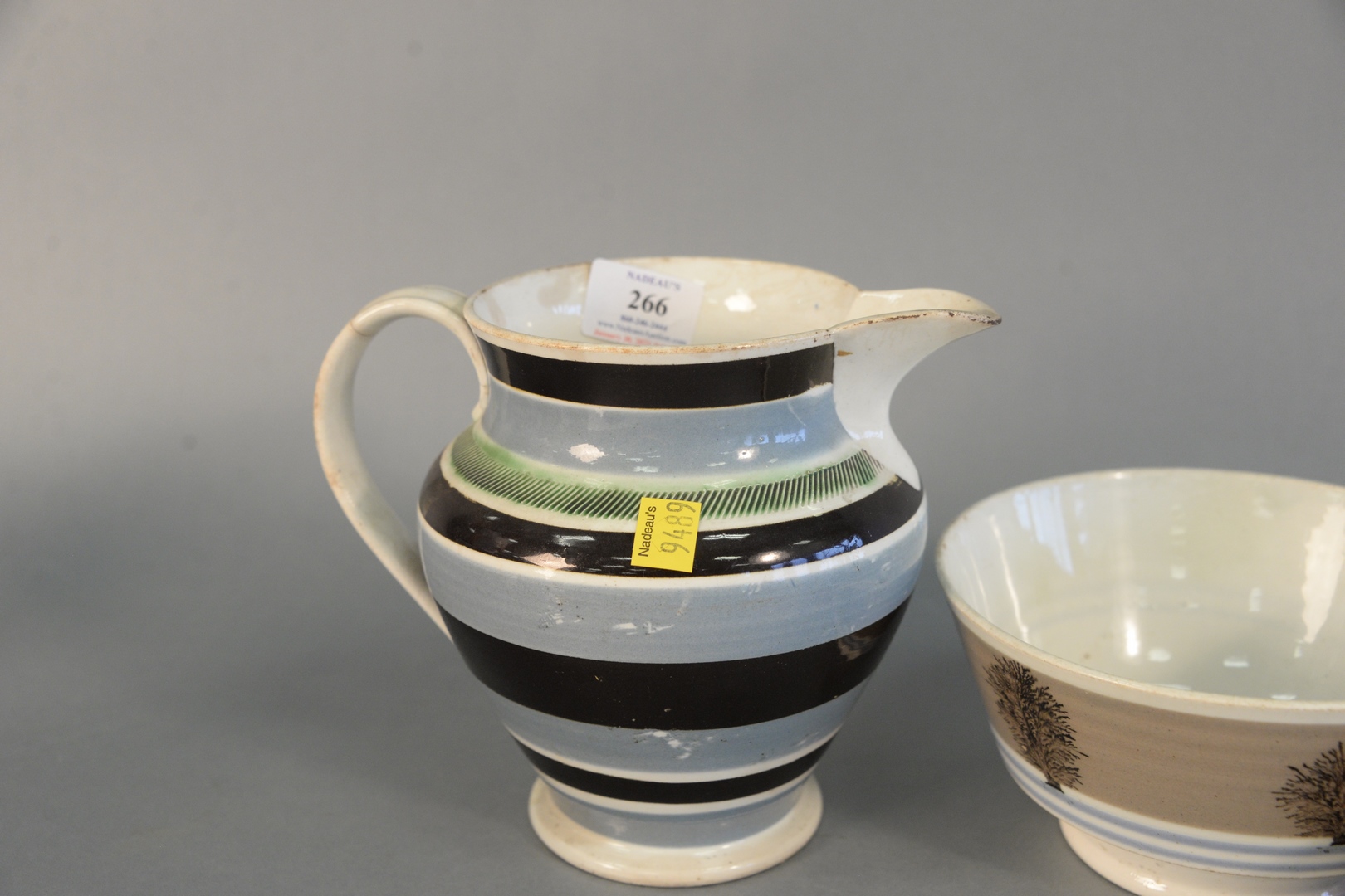 Lot 266: Five Piece Lot of Mochaware to include mocha jug having engine turnings with line and slip banding handle has crack along with tw…