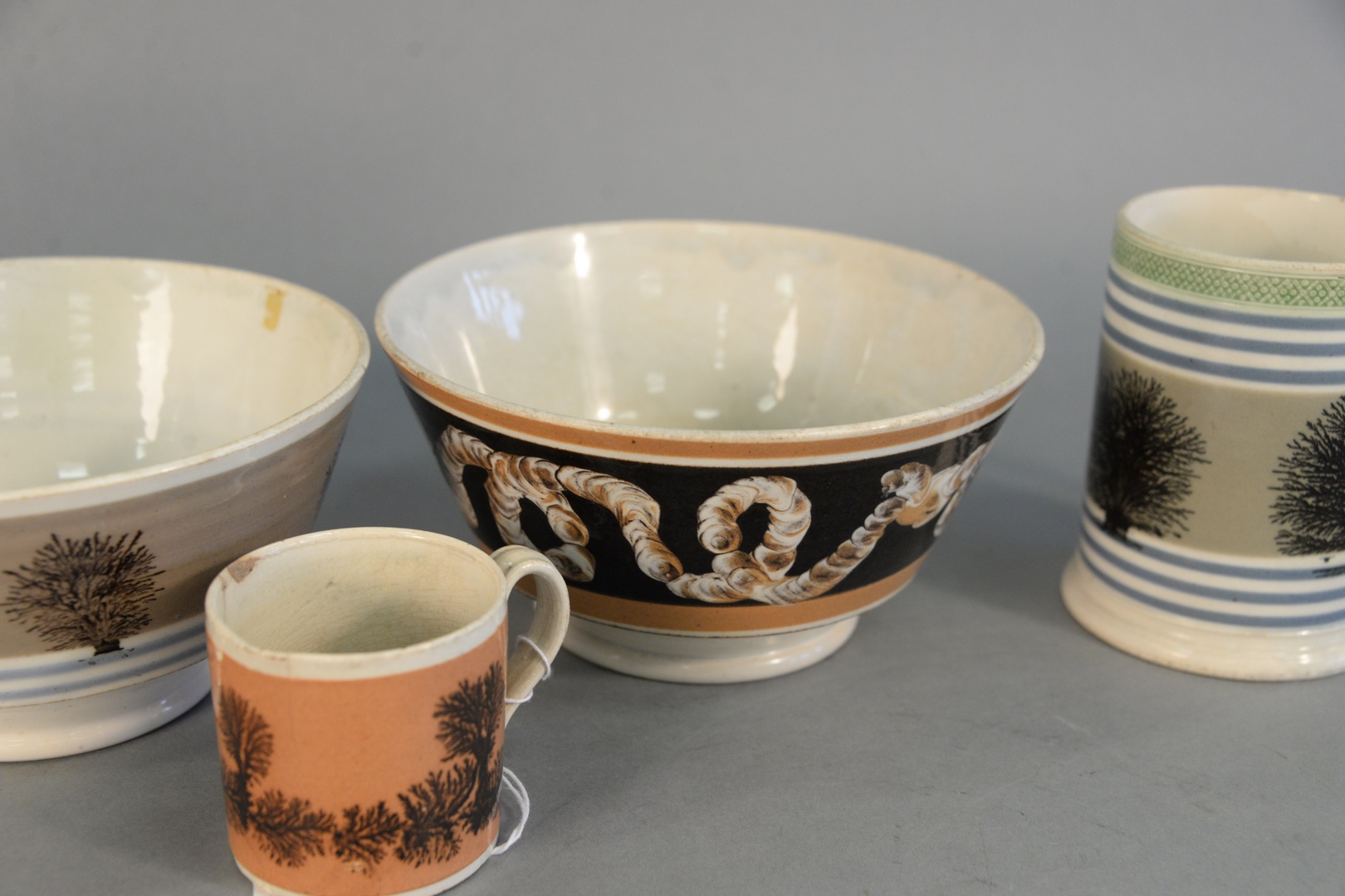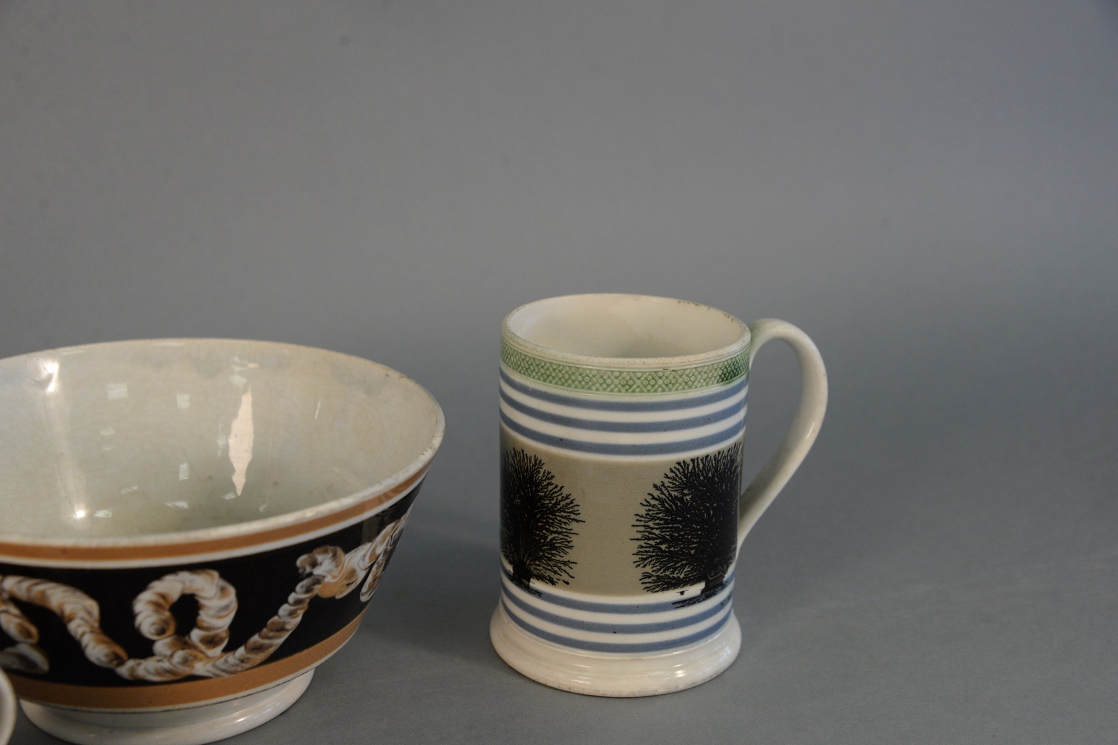 two Pearlware mocha bowls one with tri-colored cable or worm decoration, the other with trees one bowl with repaired bottom