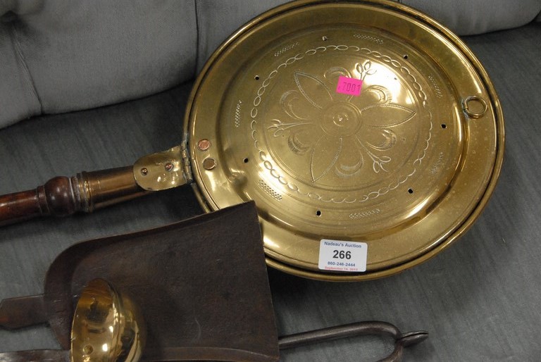 Four piece brass lot with two Federal fire tools, one early brass ladle, and one bed warmer.