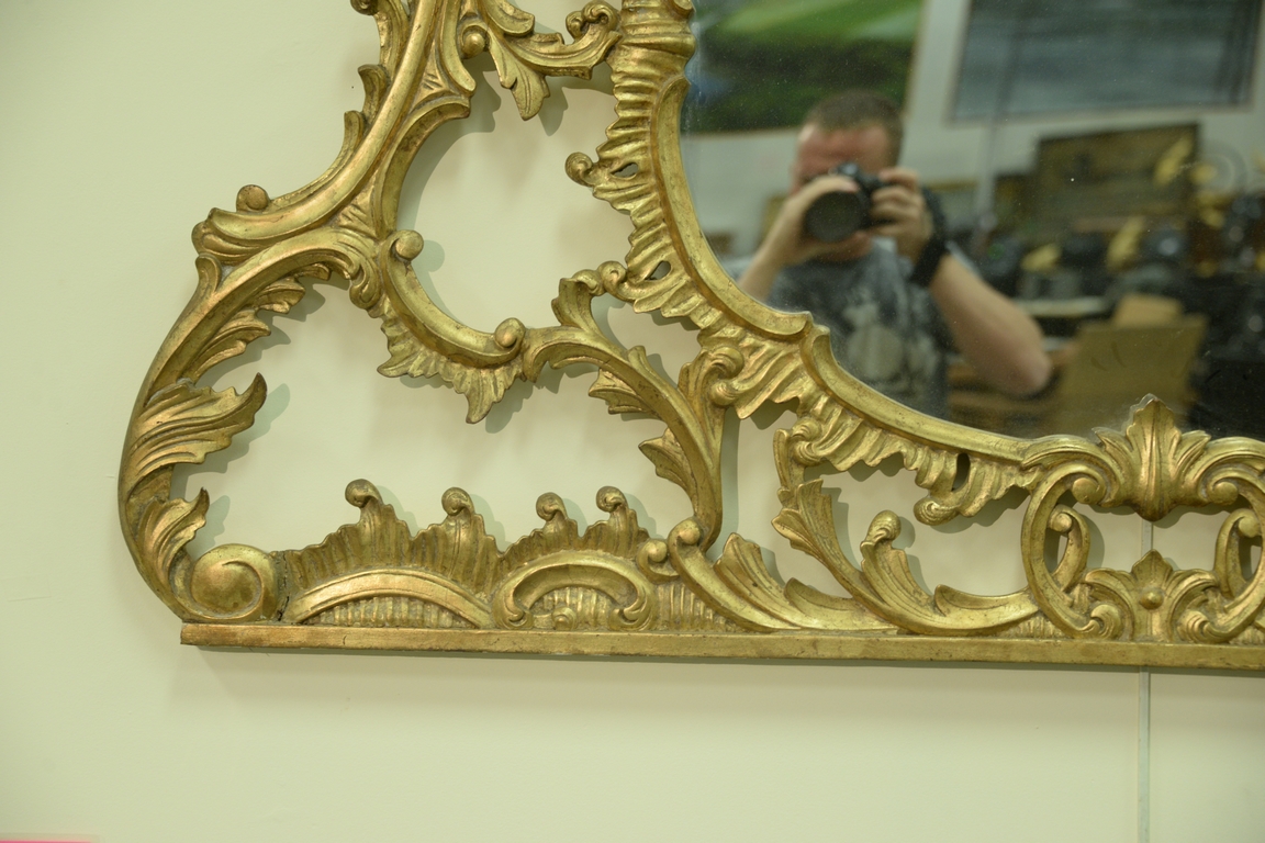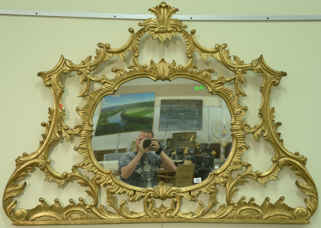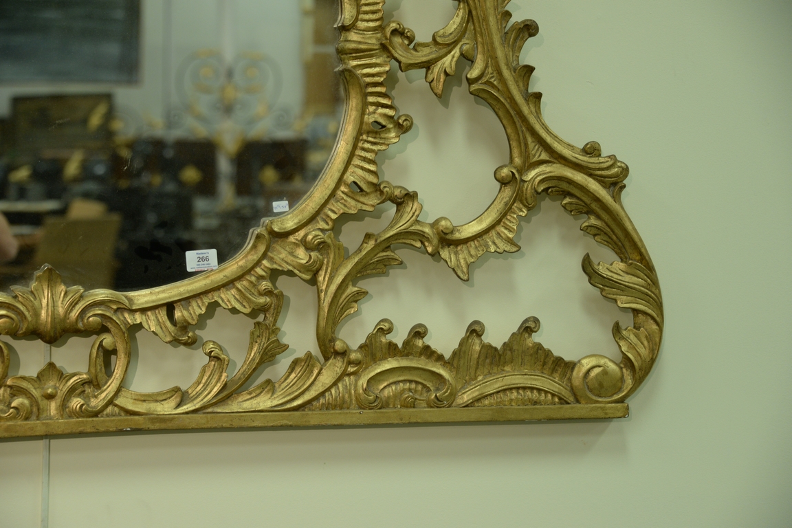 Lot 266: George III style gilt wood over mantle mirror, Chippendale style shaped oval mirror plate with pierced frame with C-scrolls foliage…