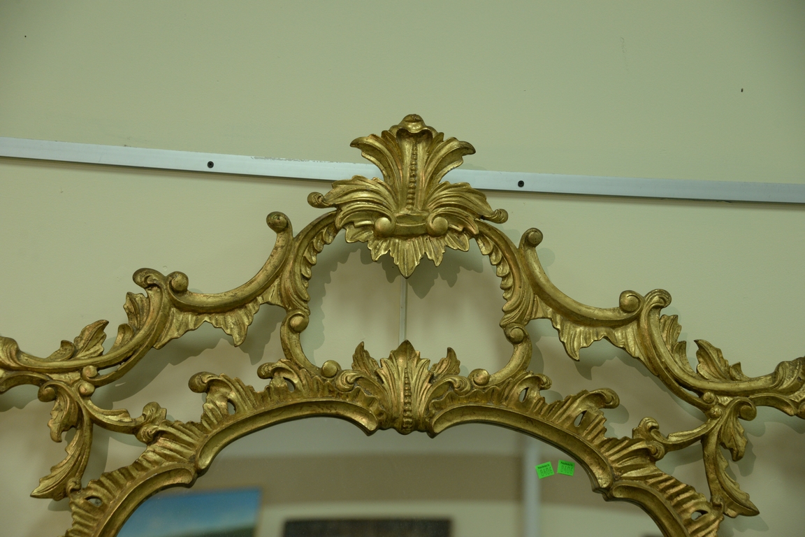George III style gilt wood over mantle mirror, Chippendale style shaped oval mirror plate with pierced frame with C-scrolls foliage and garrya. ht. 46in., wd. 62in. Provenance: Collection of Anne Jones Willis and the late John Ralph Willis, New Jersey