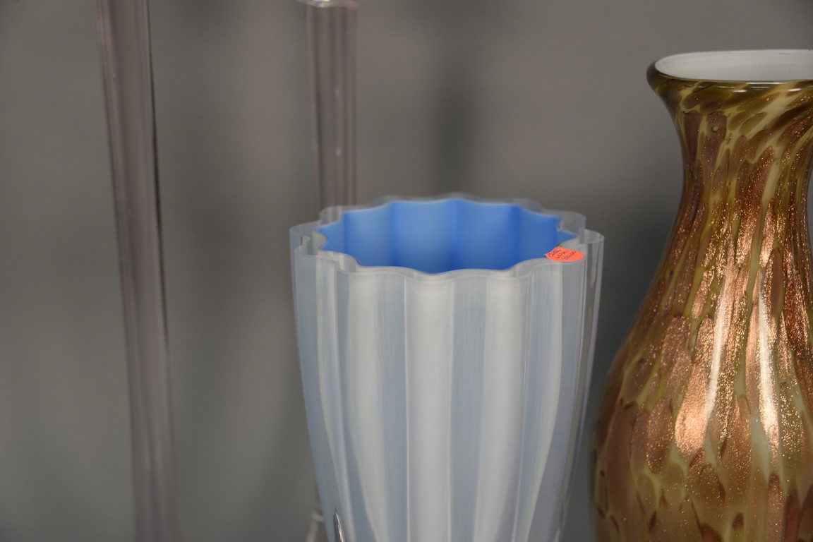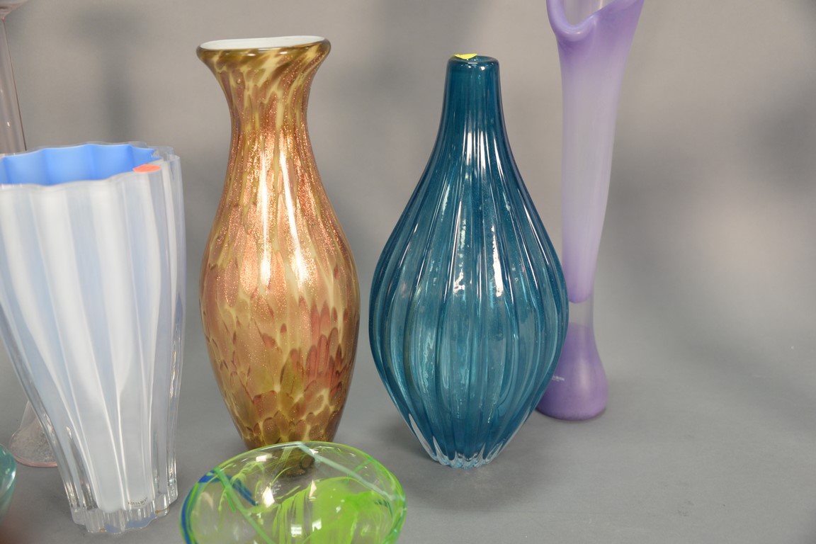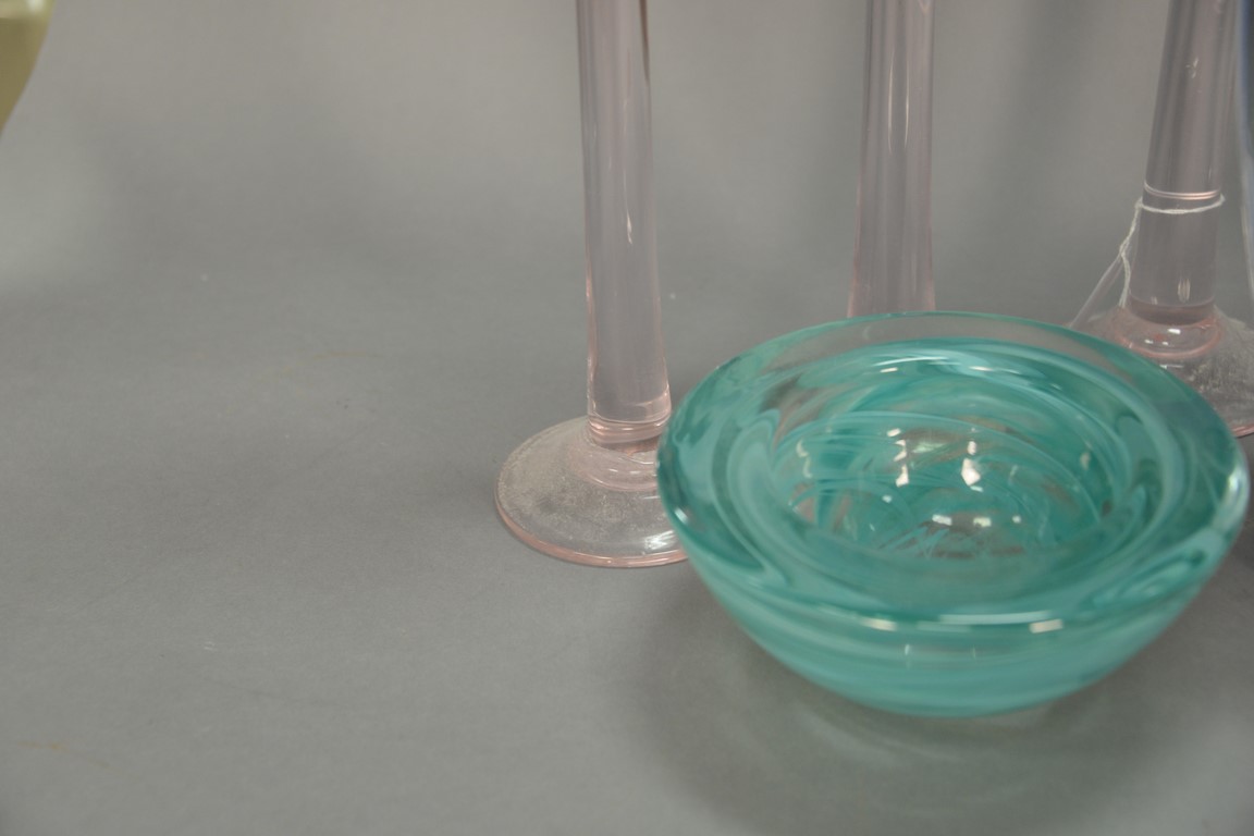 Group of nine art glass pieces: five Kosta Boda art glass pieces to include to tall vases signed Wahlstrom, two bowls, and a purple tall vase a tall vase with gold flecking, and three tall candlesticks. ht. 3 1/4 in. to 19 1/2 in.