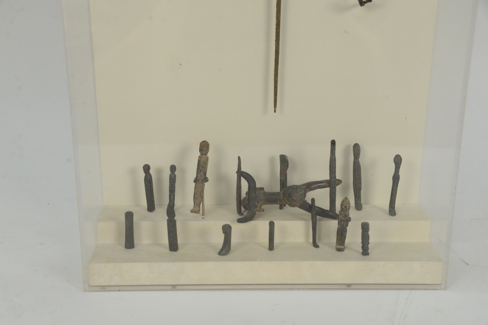 Lot 266: Group of Seventeen Bronze Egyptian Figures, to include pin with animal figure bull small figures of Osiris Mummiform B.C. or later in plexiglass fitted case, height 15 1/4 inches, width 11 1/4 inches.