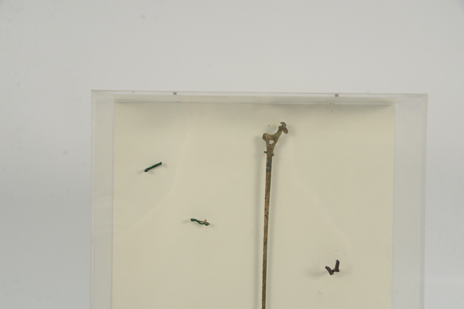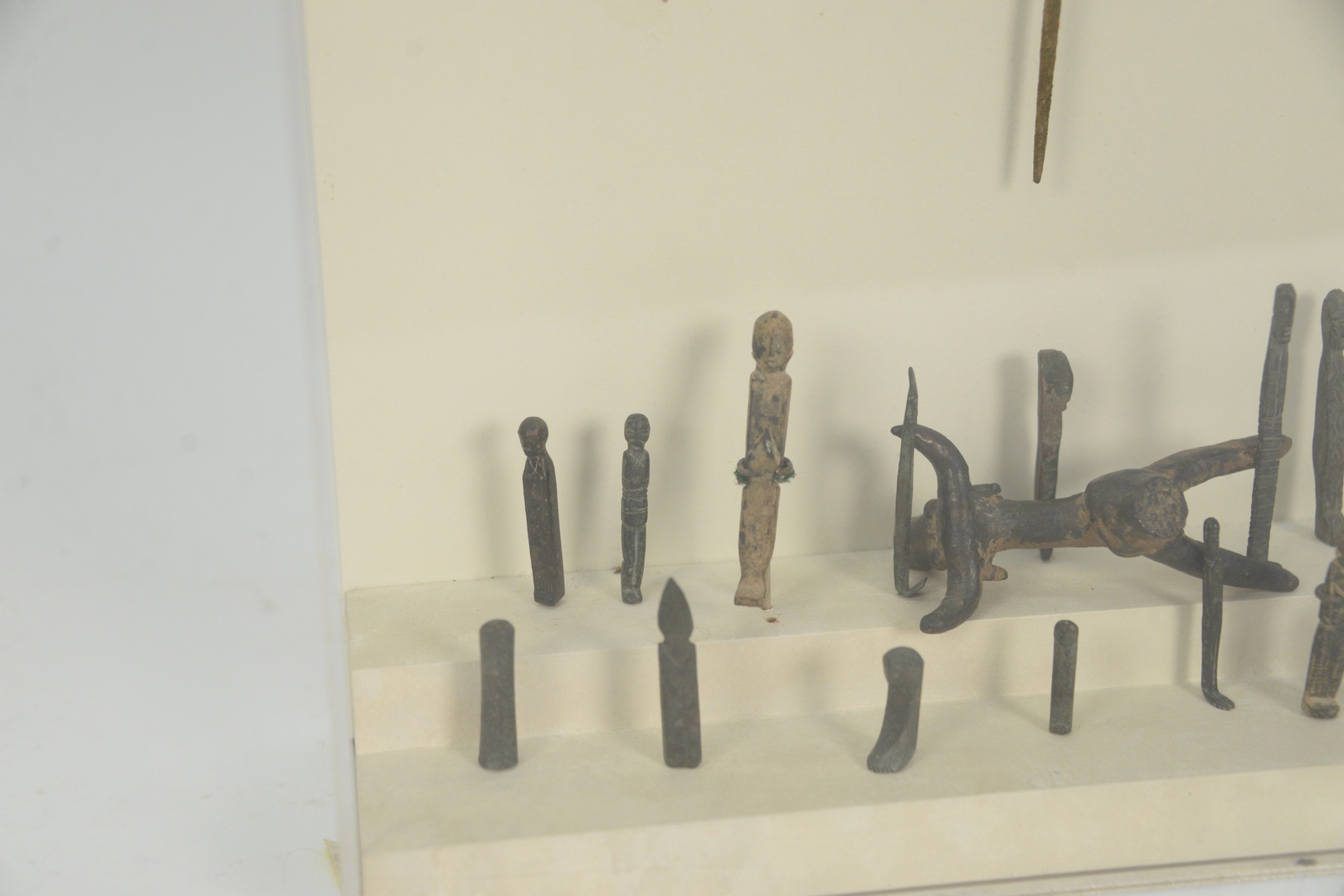 Group of Seventeen Bronze Egyptian Figures, to include pin with animal figure bull small figures of Osiris Mummiform B.C. or later in plexiglass fitted case, height 15 1/4 inches, width 11 1/4 inches.