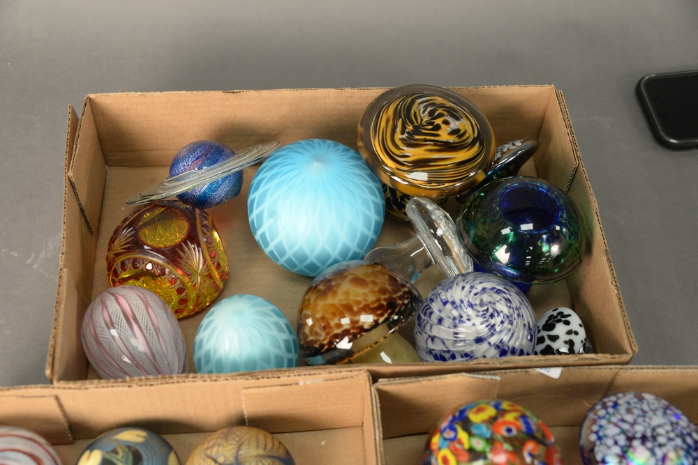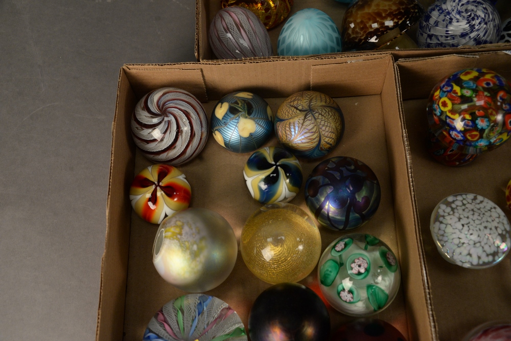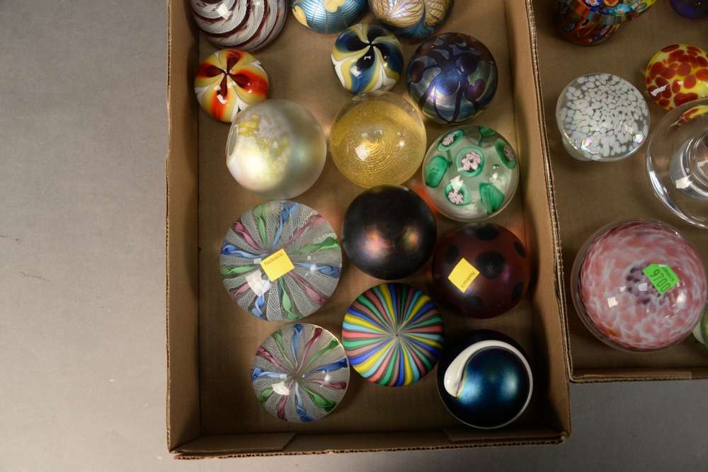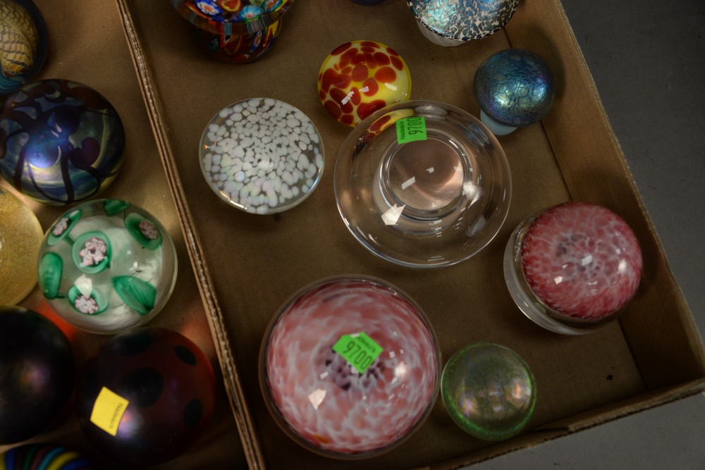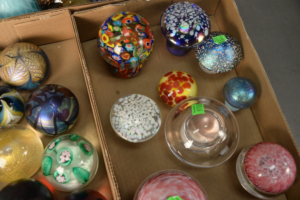 Group of Thirty-seven Assorted Glass Paperweights, to include several in the form of mushrooms, two marked Wedgwood, one marked “Rainbow, West VA”, along with several iridescent glass paperweights. Provenance: Estate of James Wadhams.