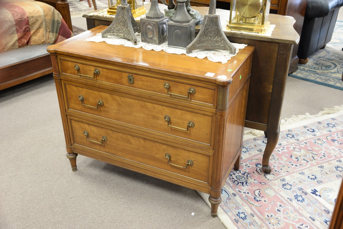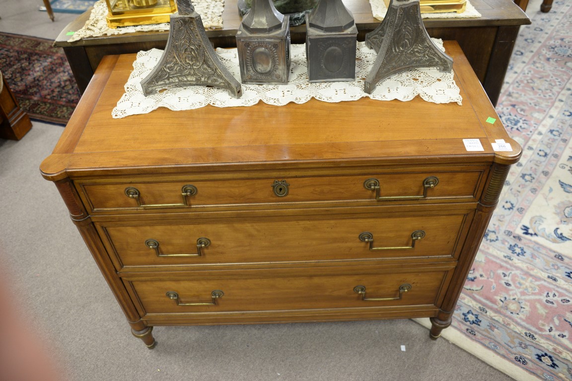 Kindel fruitwood three drawer chest, ht. 32in., wd. 38in., dp. 19in.