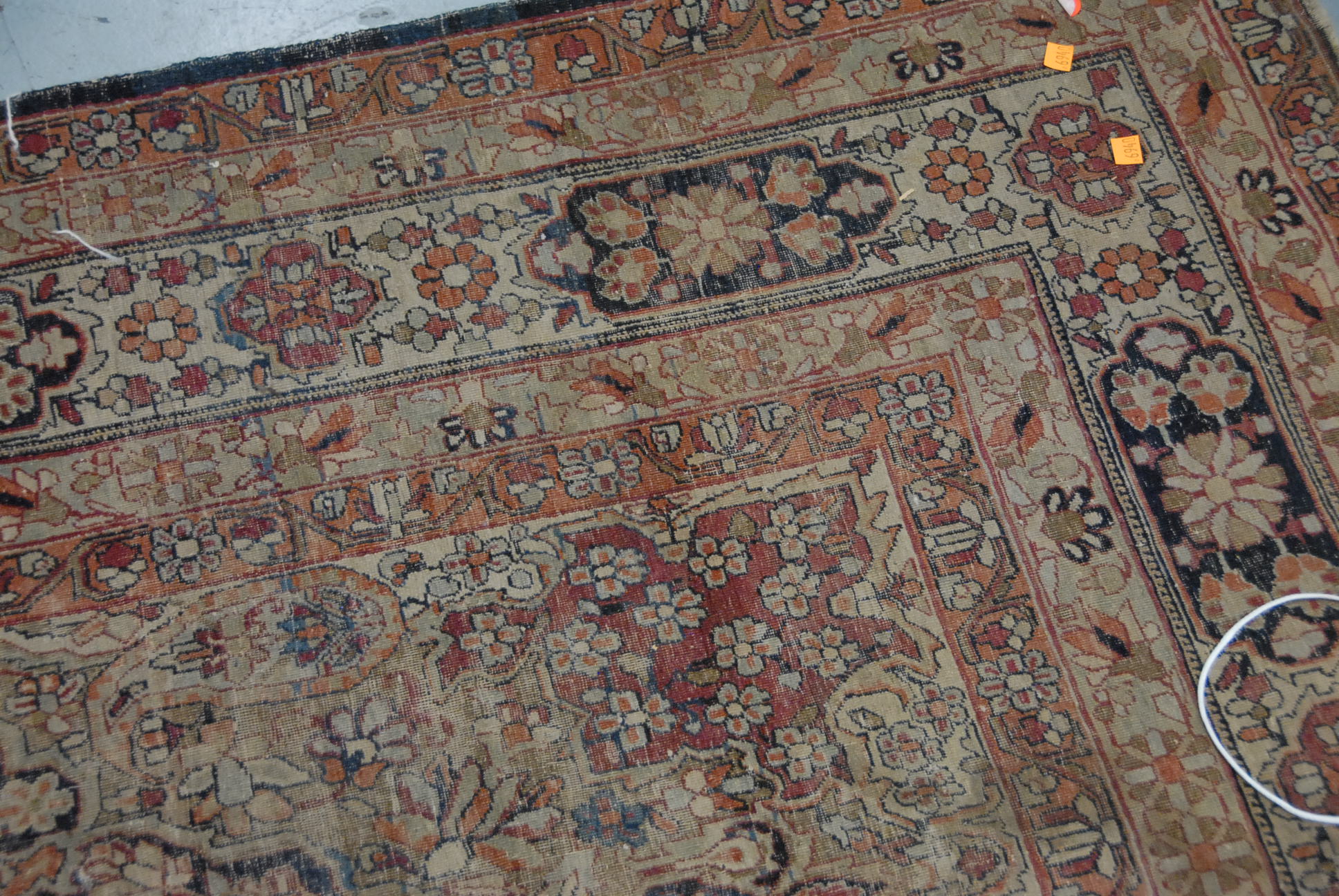 Laver Kirman Oriental rug worn, 4′ x 6’5.