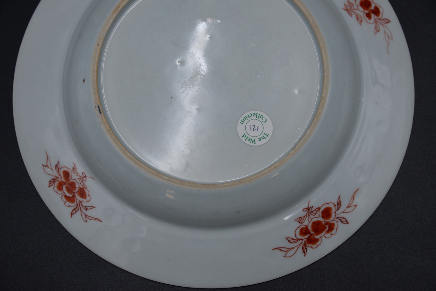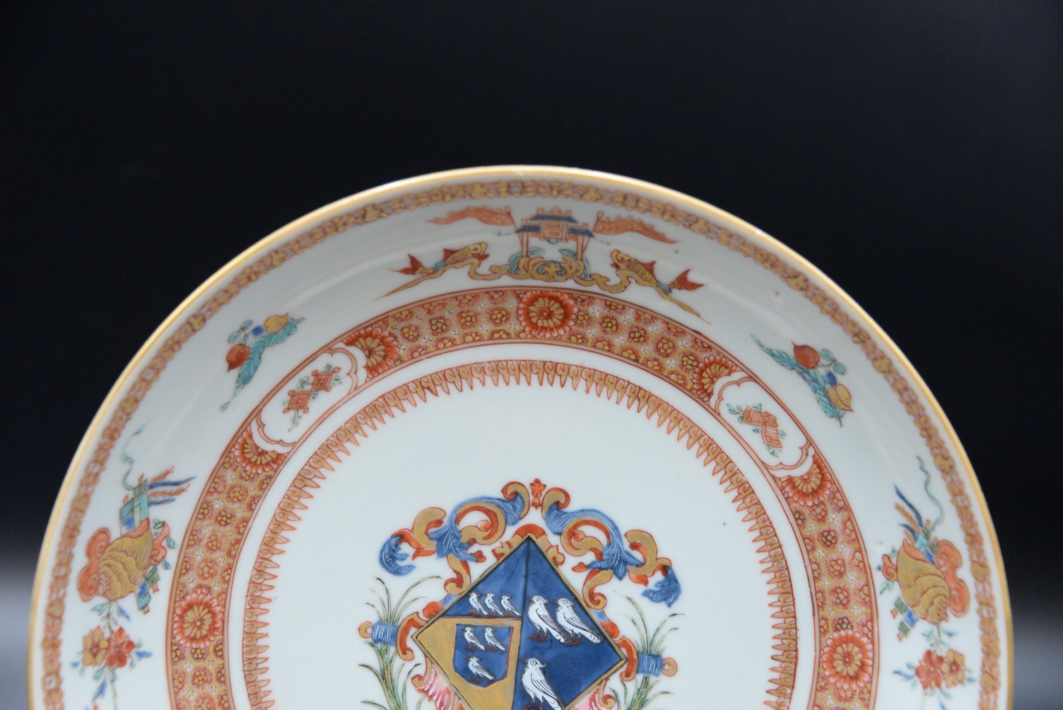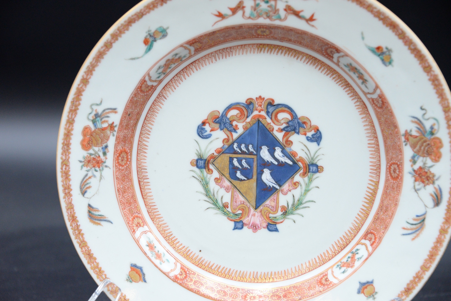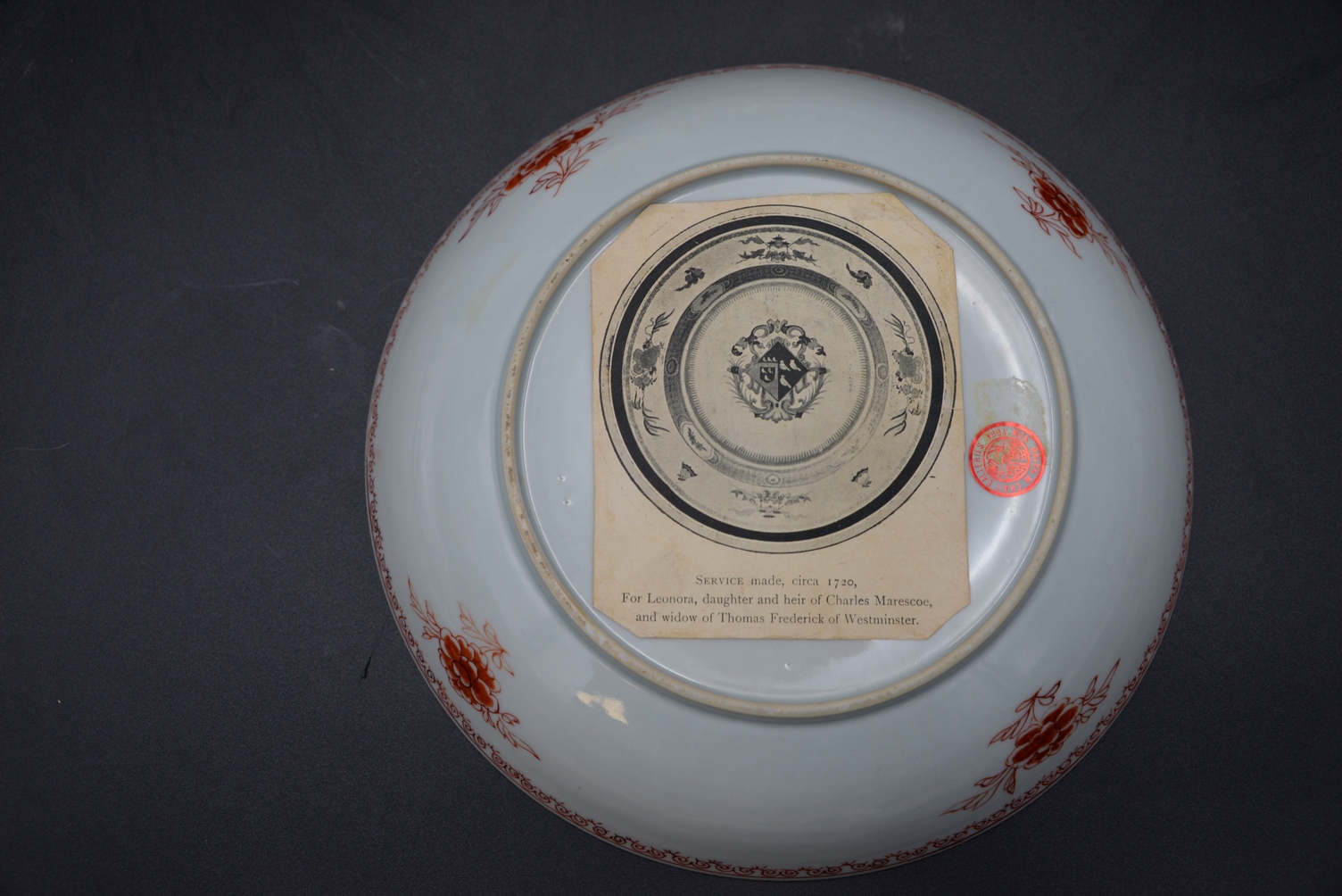 circa 1720 shallow bowl and a plate having centralized coat of arms with enameled birds, iron red and gilt band border with stylized fruit and flowers, in good condition with minor surface chips on rim, service made circa 1720 for Leonora daughter and heir of Charles Marescoe and widow of Thomas Frederick of Westminster, height 1 1/2 inches, diameter 9 inches; height 1 1/4 inches, diameter 9″