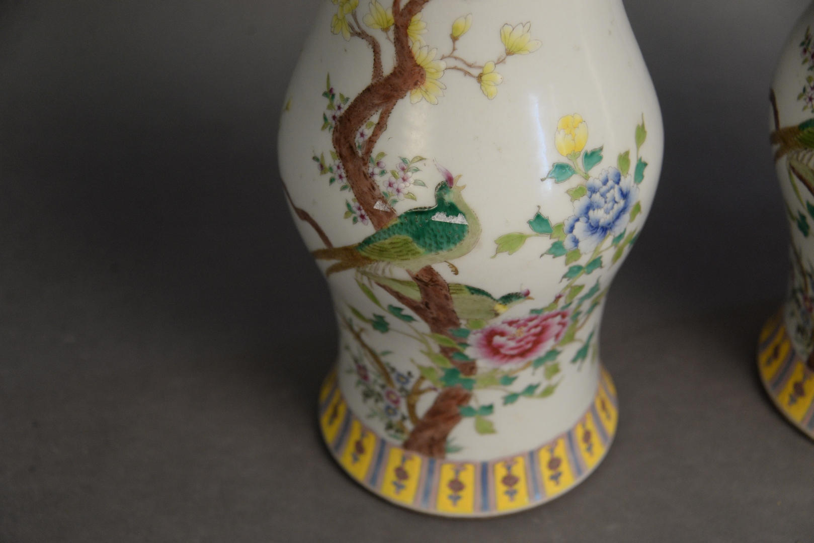 Pair of Chinese Famille Rose Vases having painted birds in a tree decoration, marked with six characters to the underside, height 15 3/4 inches.