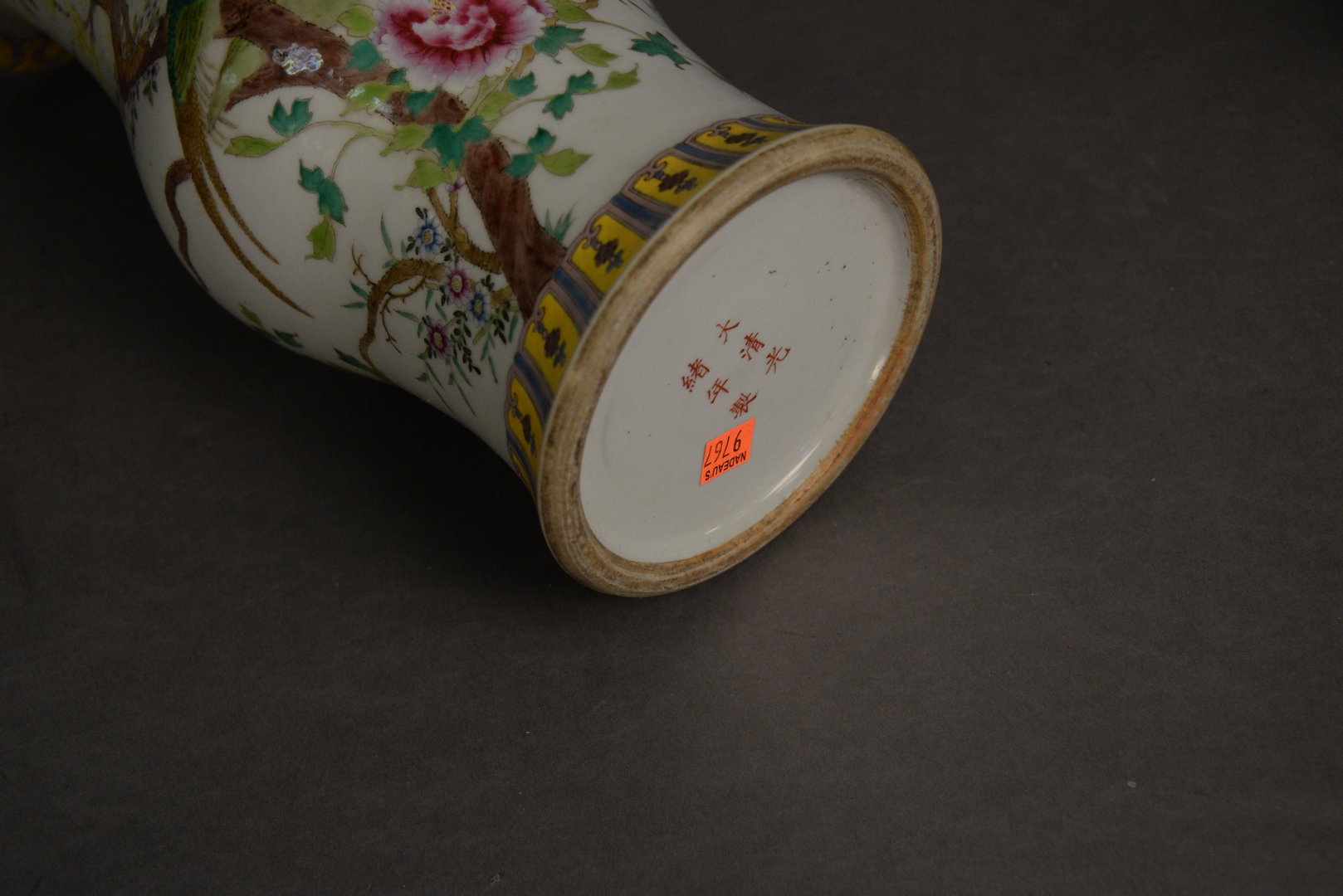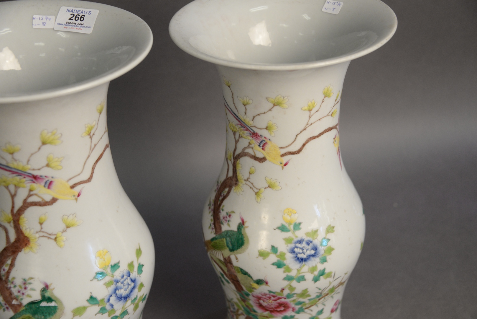 Lot 266: Pair of Chinese Famille Rose Vases having painted birds in a tree decoration, marked with six characters to the underside, height 15 3/4 inches.