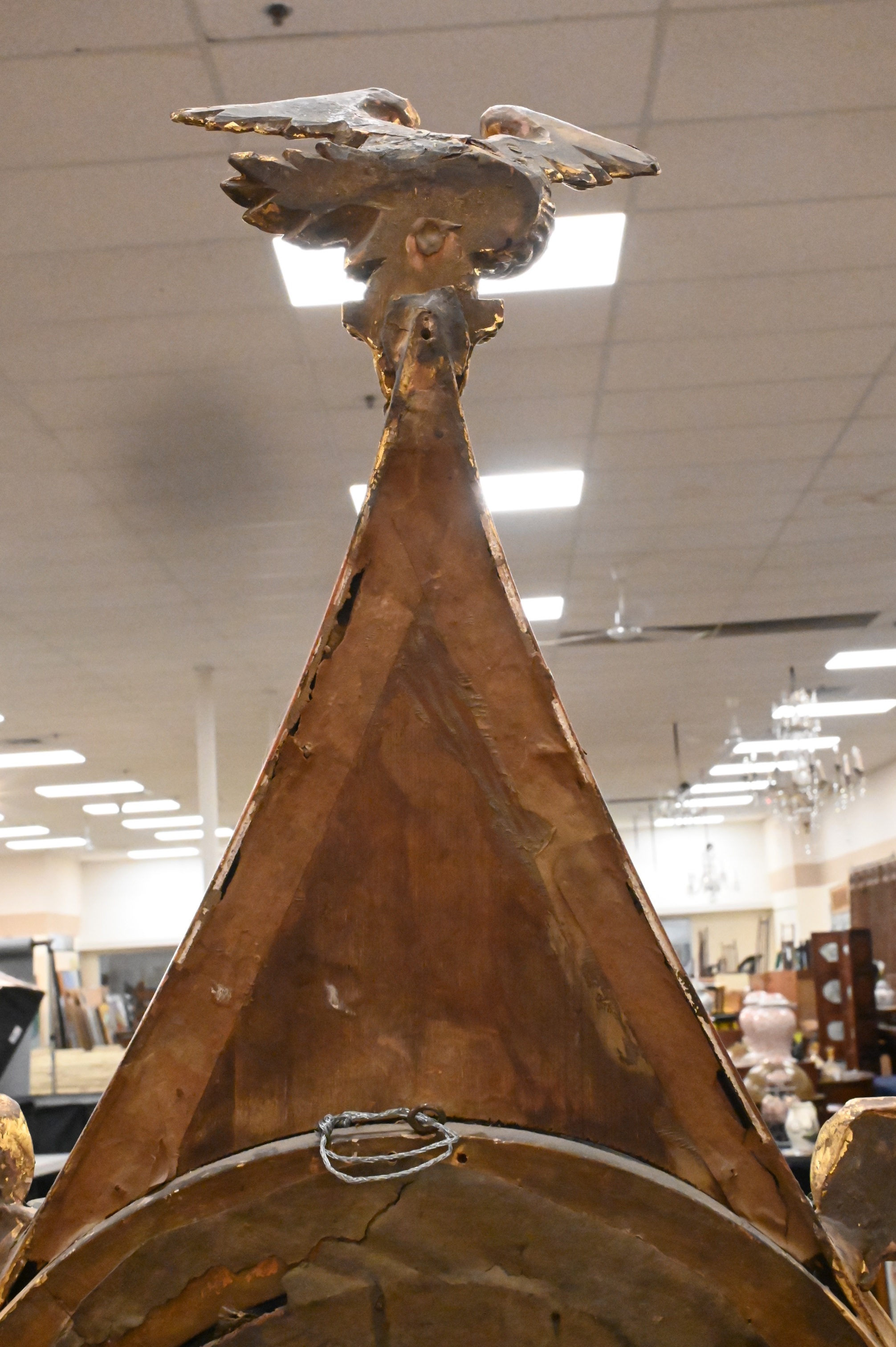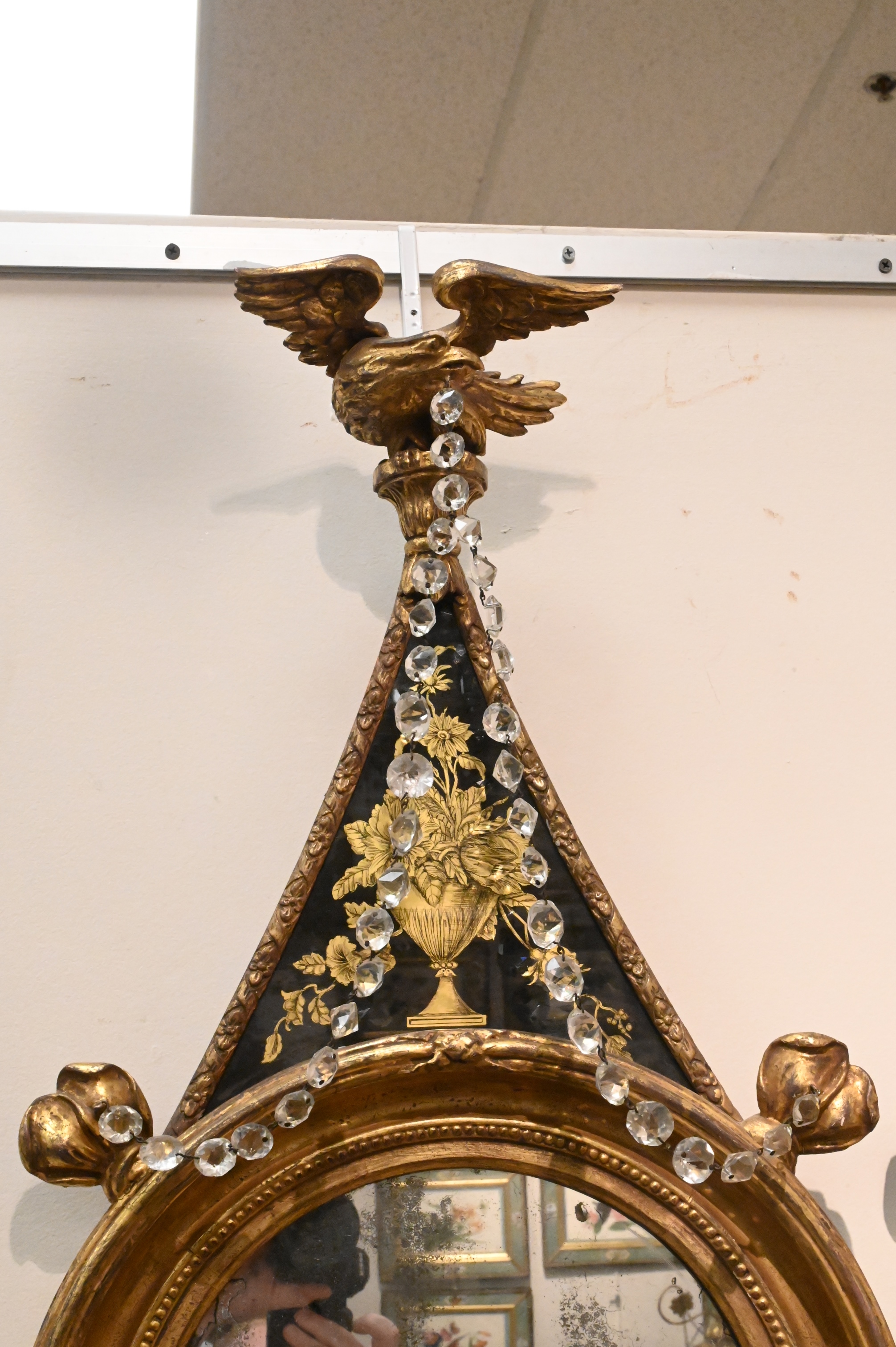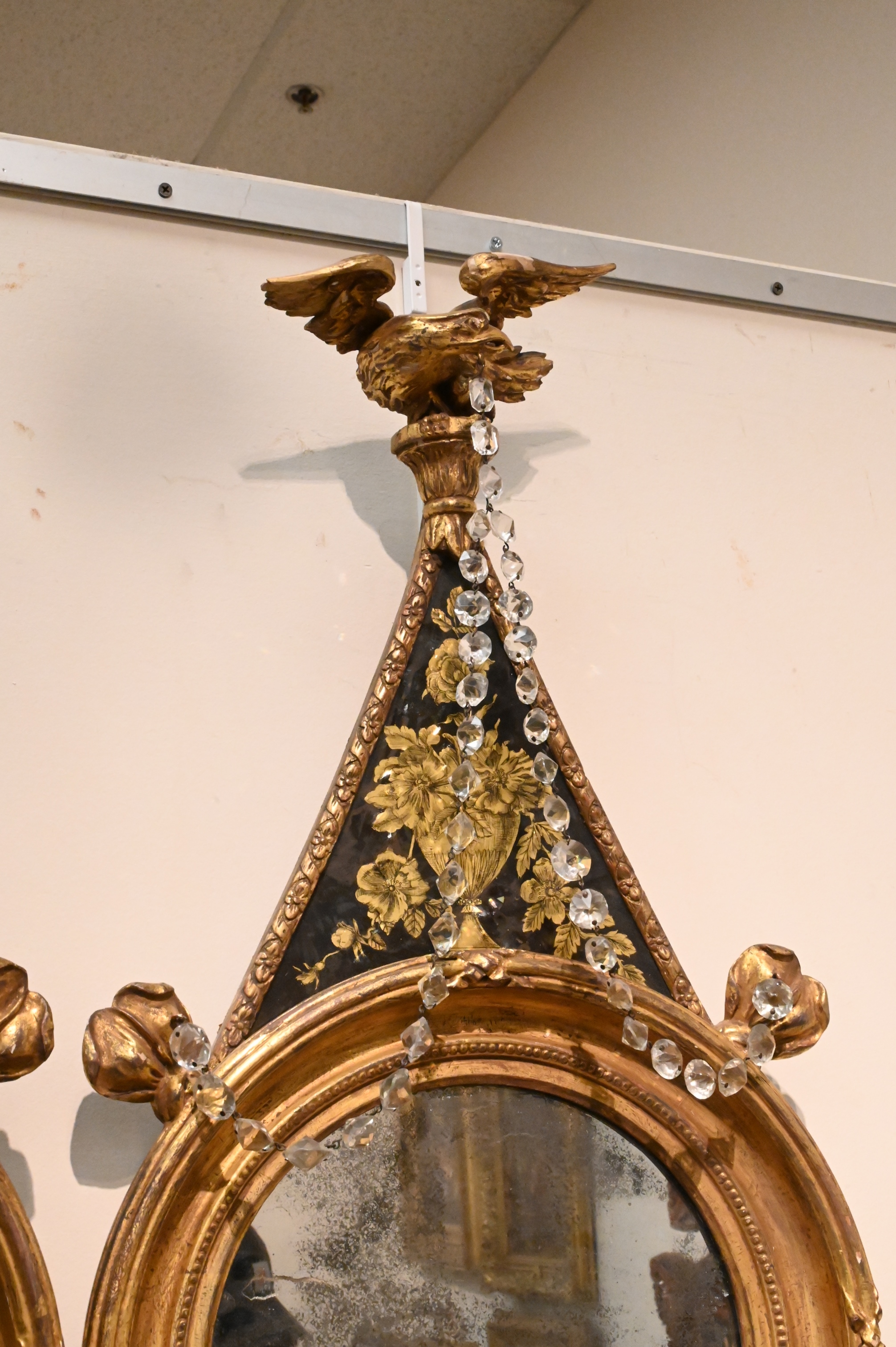 Having verre eglomise panels below eagles and crystal chain with brass candleholders