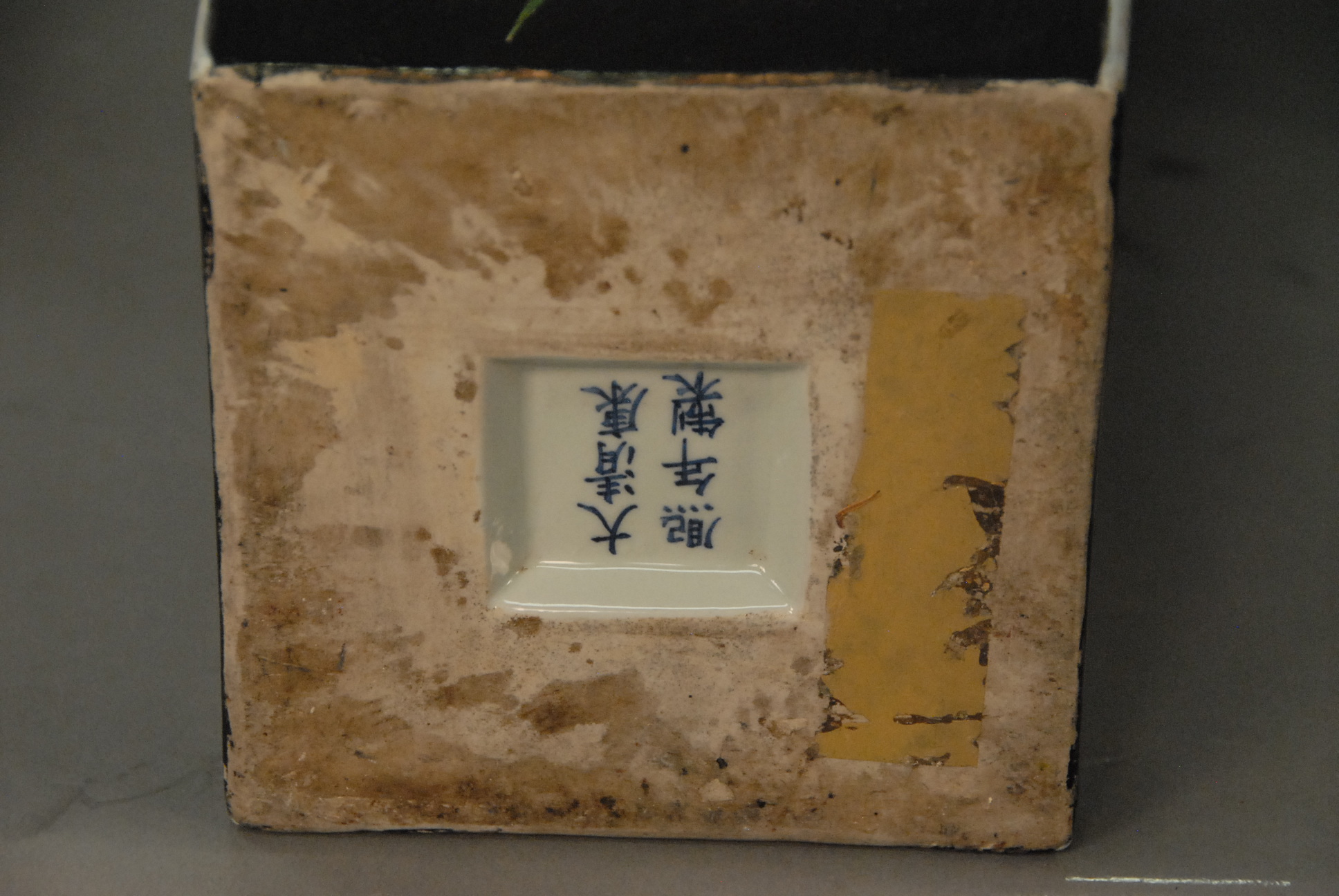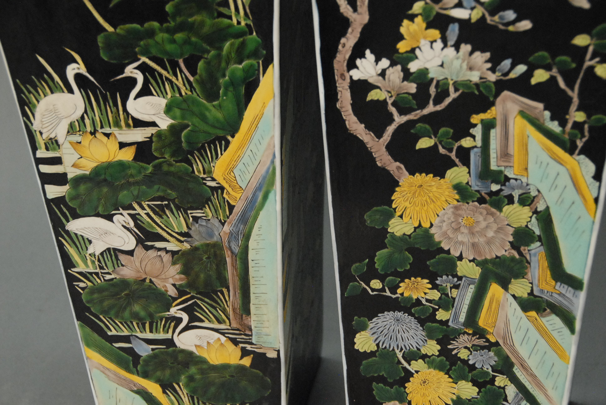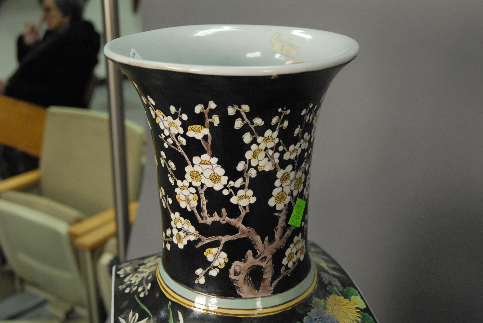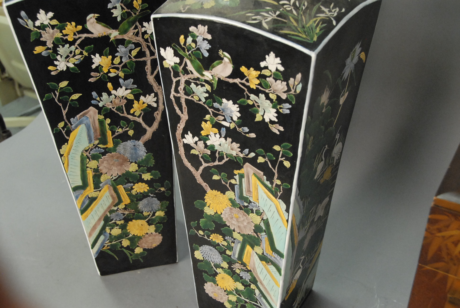 Lot 266: Pair of large famille noir quadrangular vases decorated with flowers of the four seasons, China, 20th century. ht. 29in.