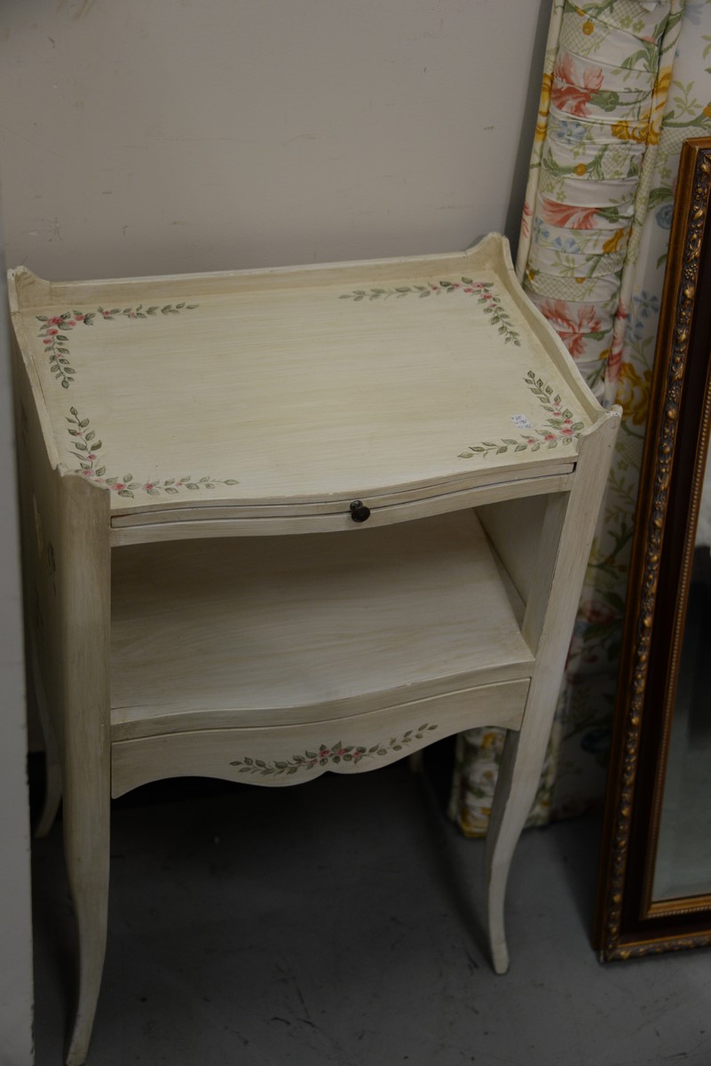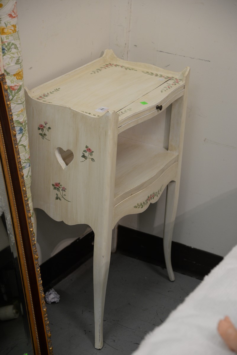 Lot 266: Pair of Louis XV style paint decorated night tables.ht. 28 in. wd. 17 1/2 in. dp. 11 1/2 in.