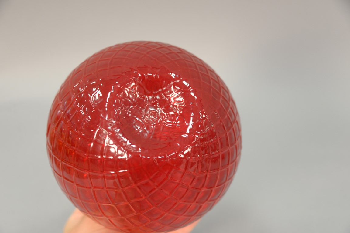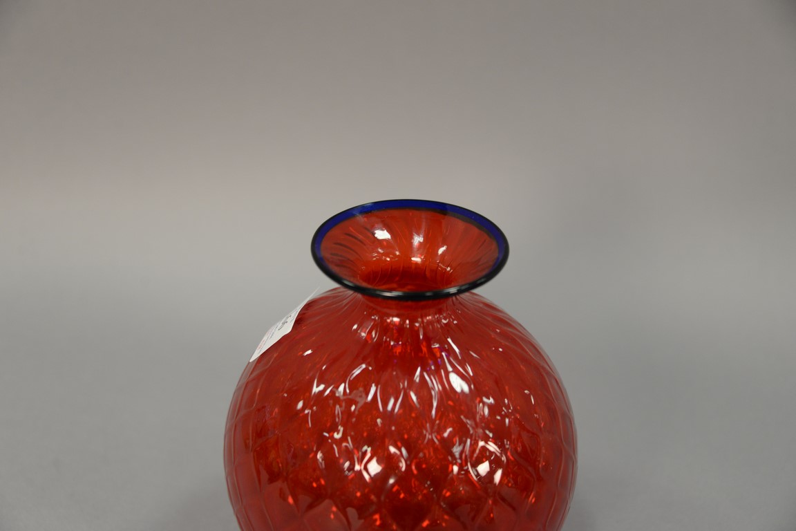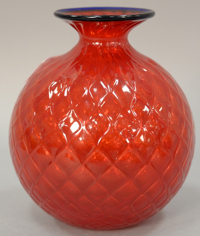 Lot 266: Paolo Venini Monofiori Balloton red quilted art glass vase with cobalt blue rim. ht. 6 1/2in.