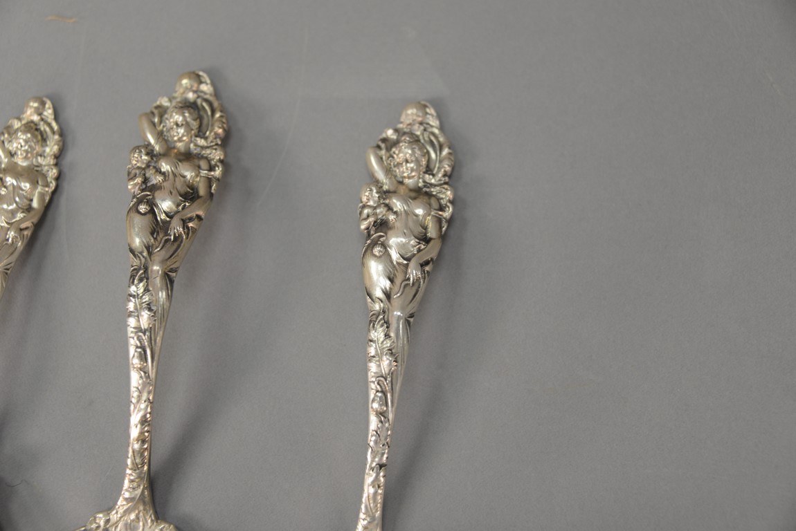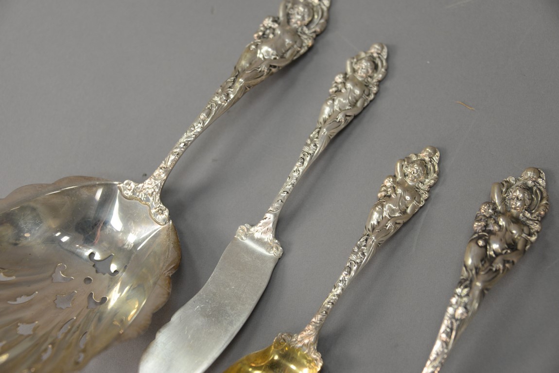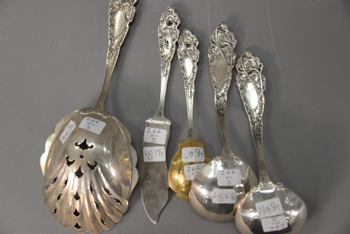 Lot 266: Reed & Barton Love Disarmed five sterling silver pieces to include pea/cracker server lg. 8 3/4 in., two gravy ladles lg. 6 1/2 in., master butter knife lg. 7 1/2 in., and preserve spoon lg. 6 in. with gold washed bowl. 12.6 t oz.