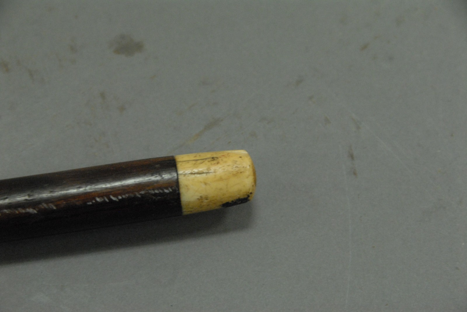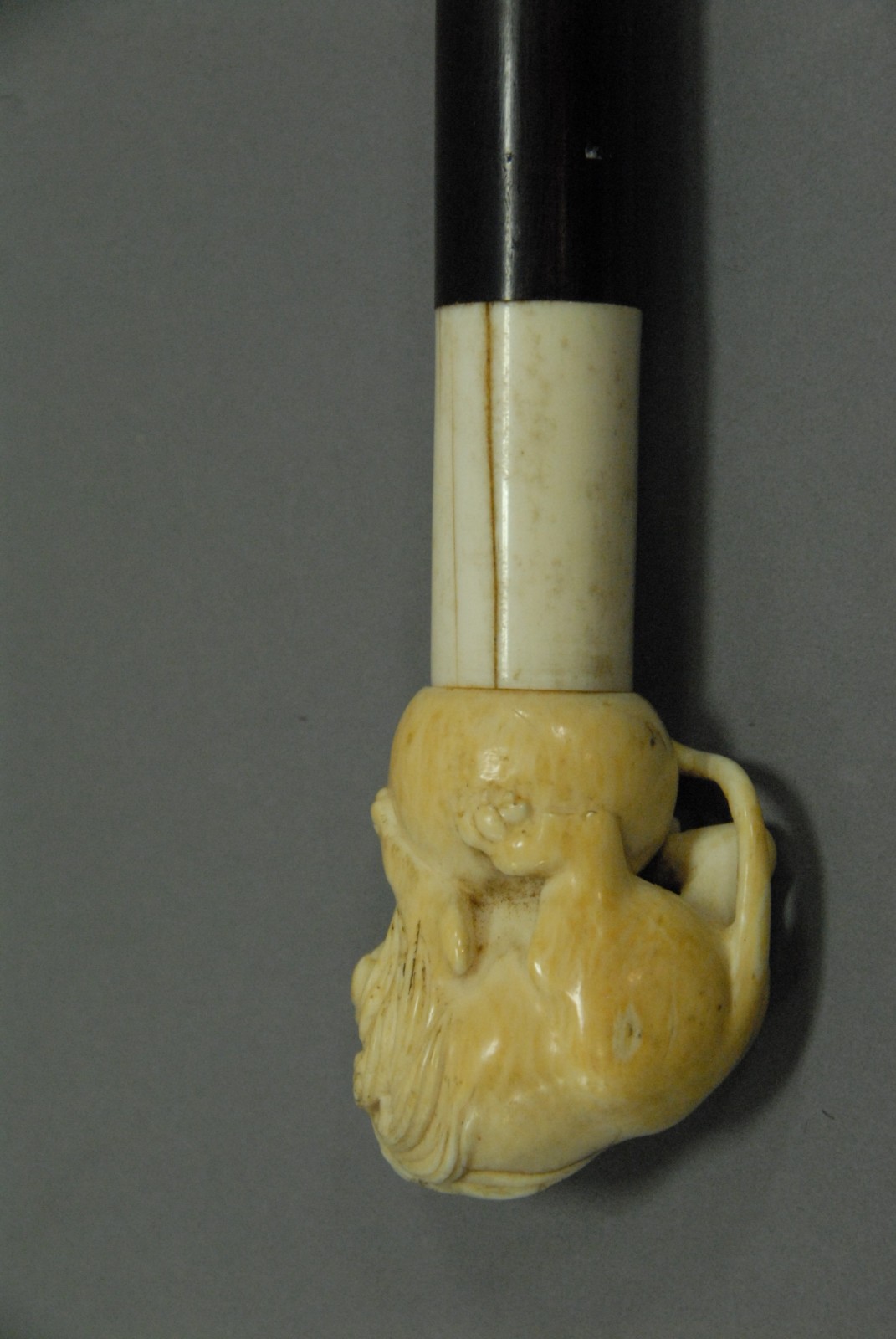 Rosewood cane with ivory carved lion top and ivory tip.