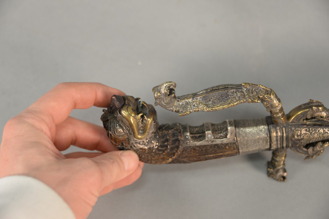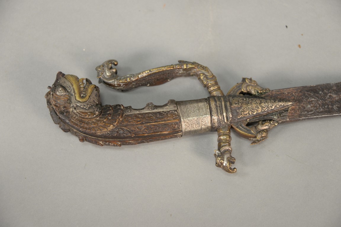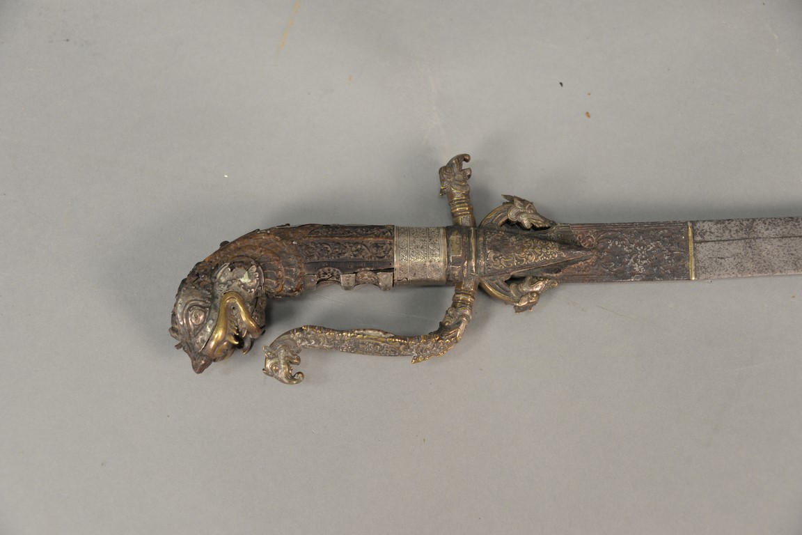 Sri Lanka Sinhalese sword Kastane with curved single edged blade, the wood and bronze hilt with applied silver and brass panels, the guard with openwork head of mythical beast and the grip carved with scrollwork and a dragon’s head pommel. some minor losses, some silver at beginning of blade missing total length 25 1/2 inches