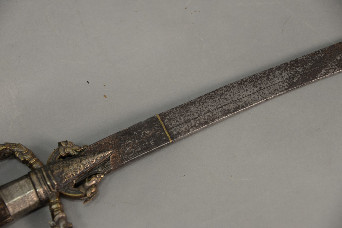 Lot 266: Sri Lanka Sinhalese sword Kastane with curved single edged blade, the wood and bronze hilt with applied silver and brass panels, t…