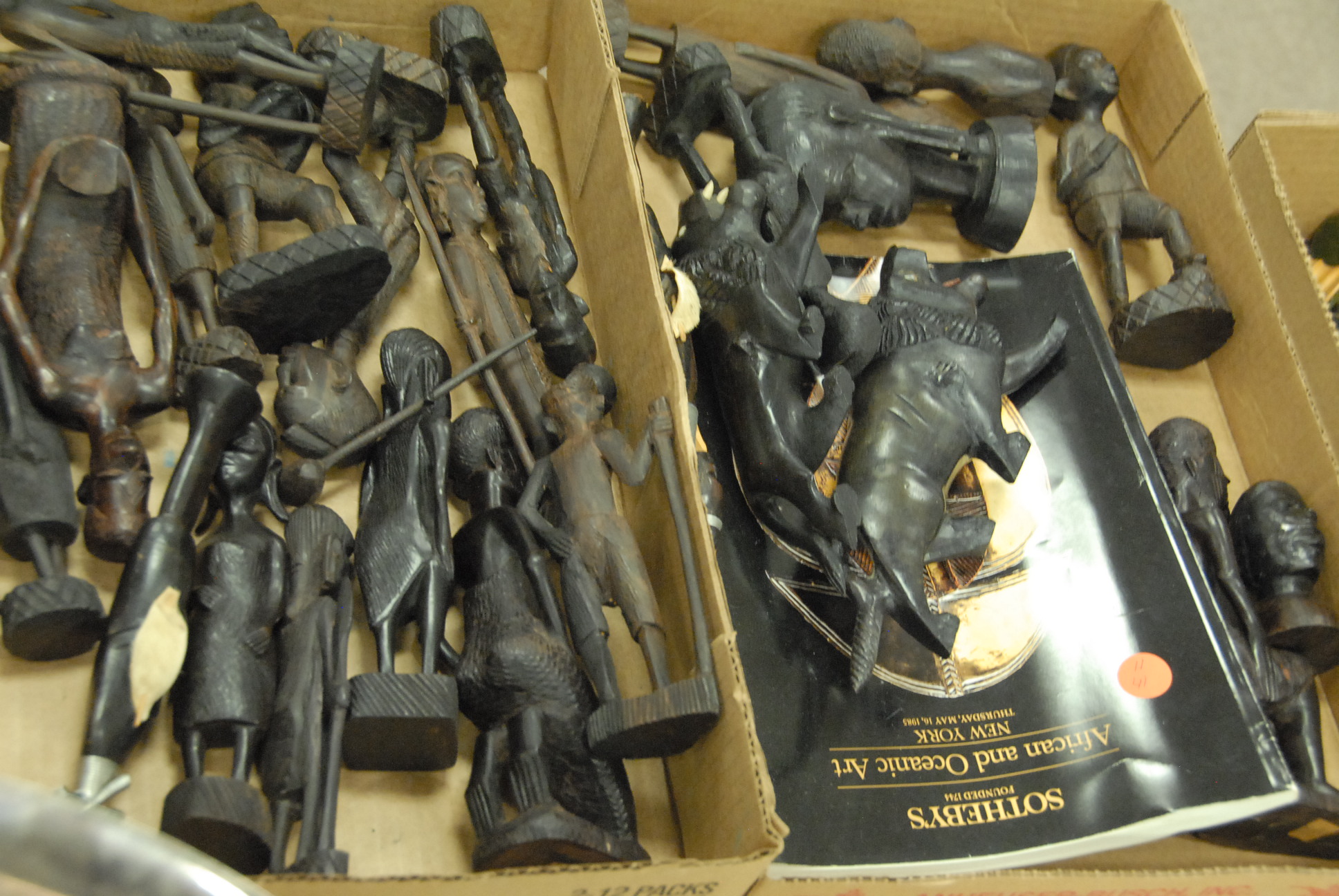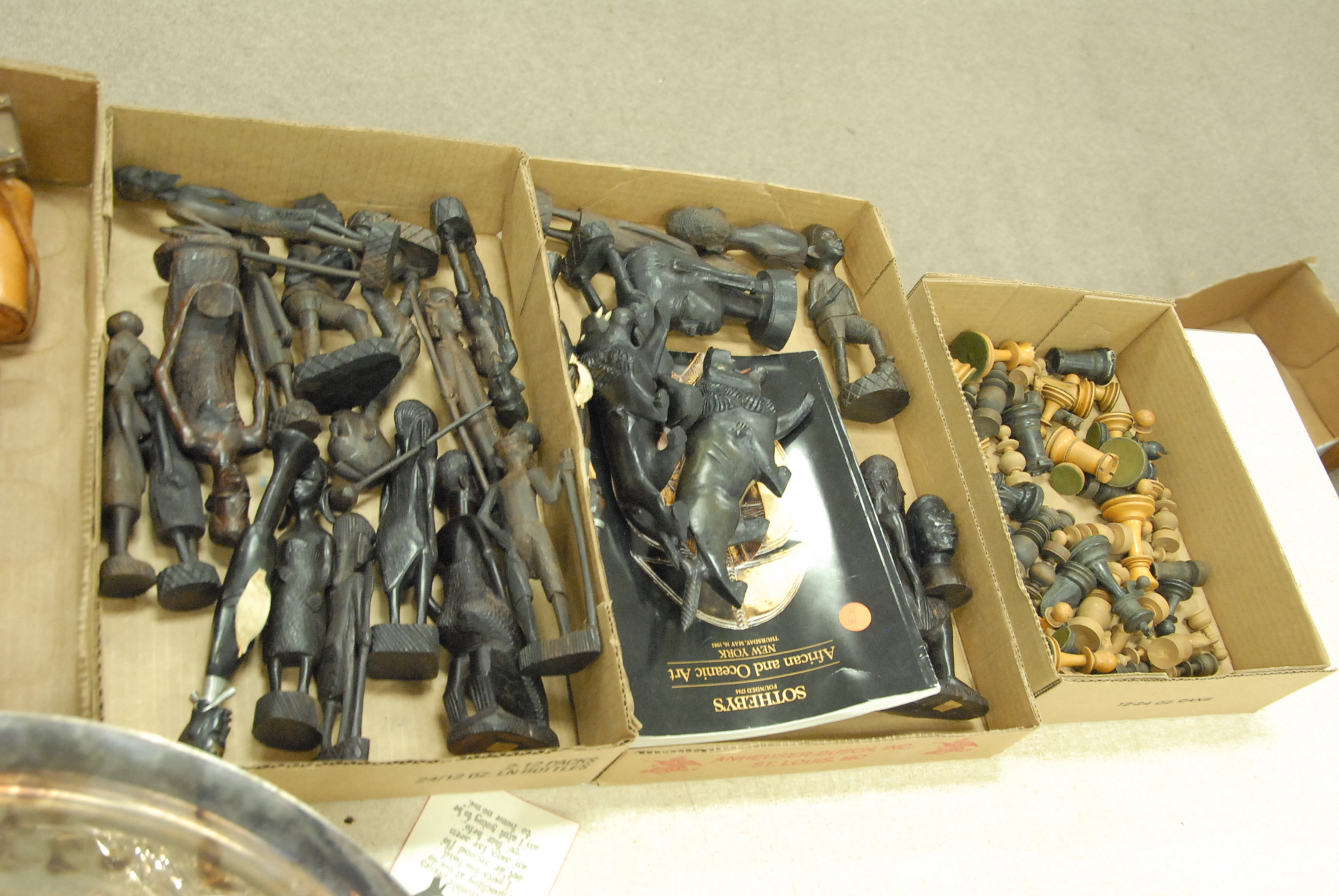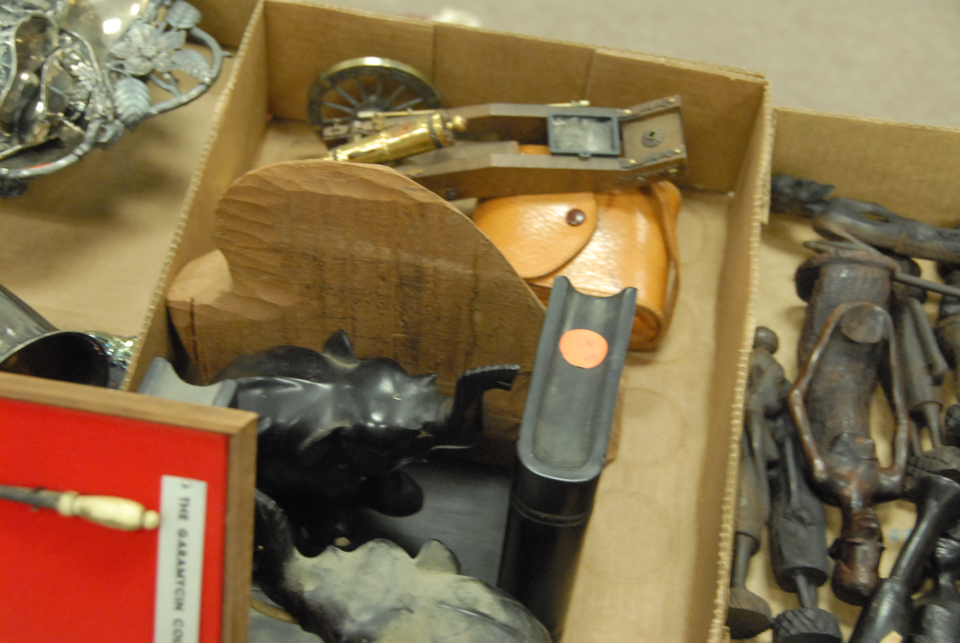 Ten box lots to include a mirrored candle sconce, a pair of metal antelope book ends, miniature tools, carved African figures, elephant book ends, silver plated items, a miniature oil lamp with shade as is.