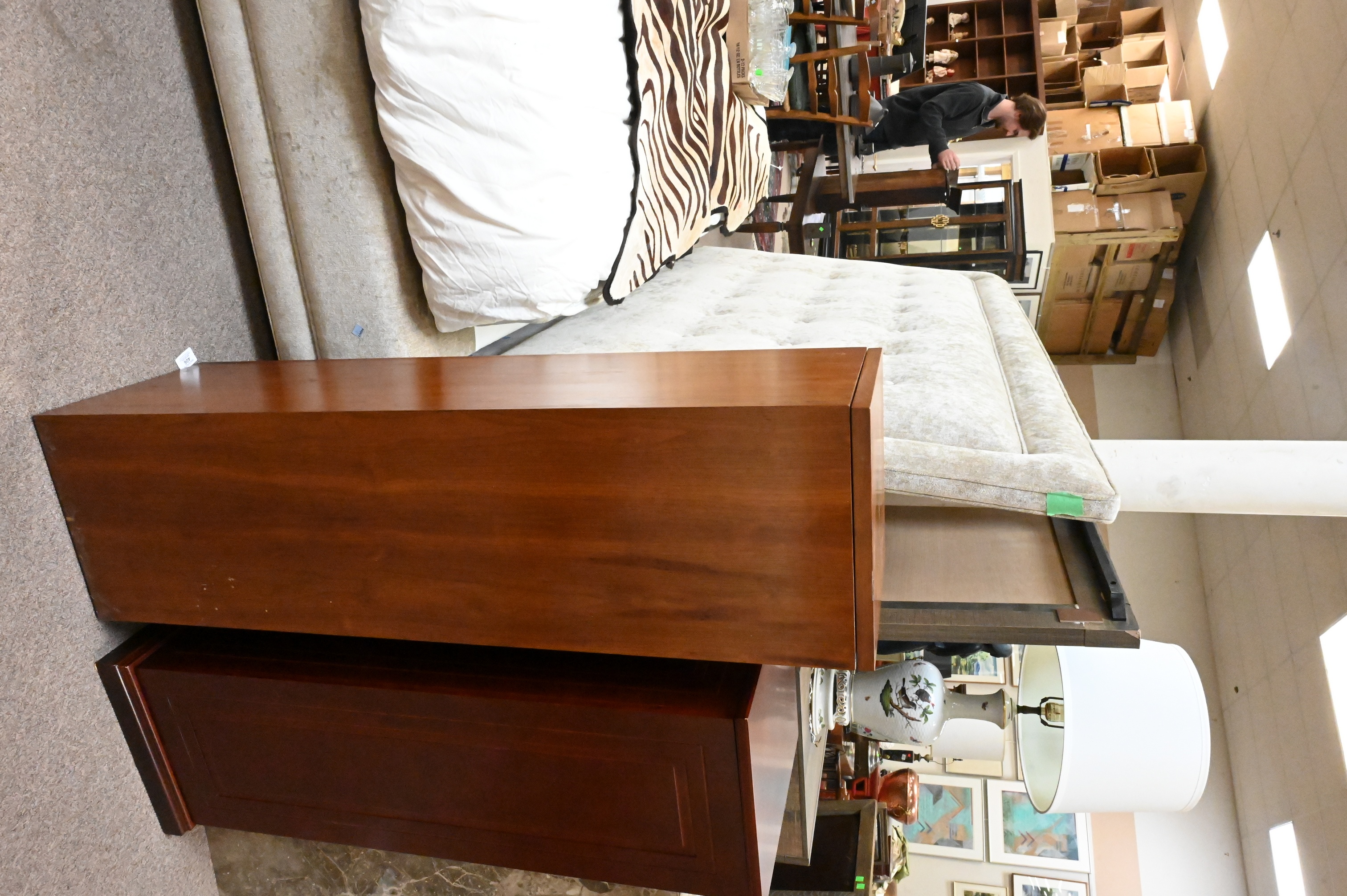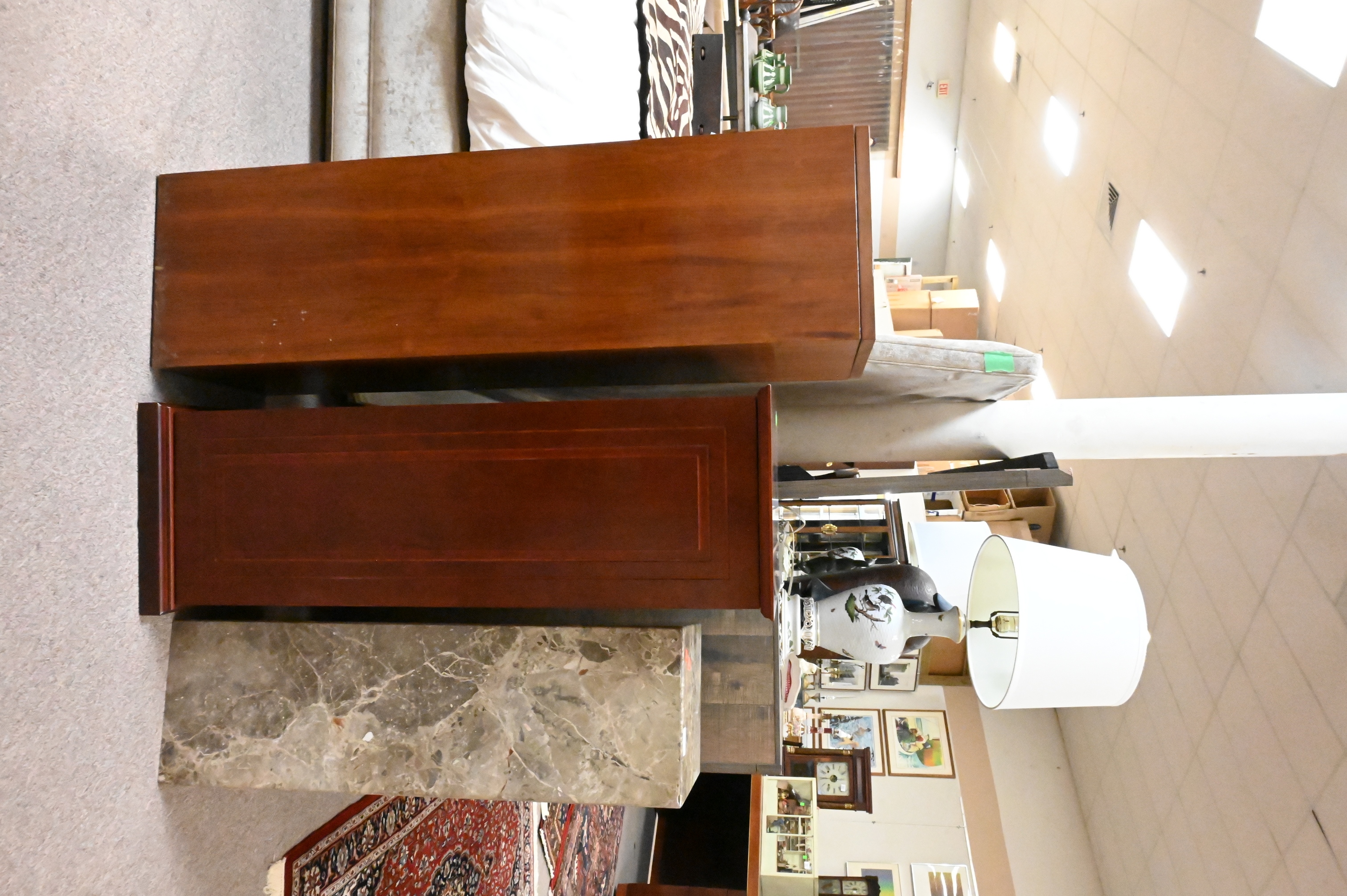 to include a modern marble pedestal, height 32 inches, and rectangular wood pedestal having paneled side doors opening to cabinet storage, height 37 inches