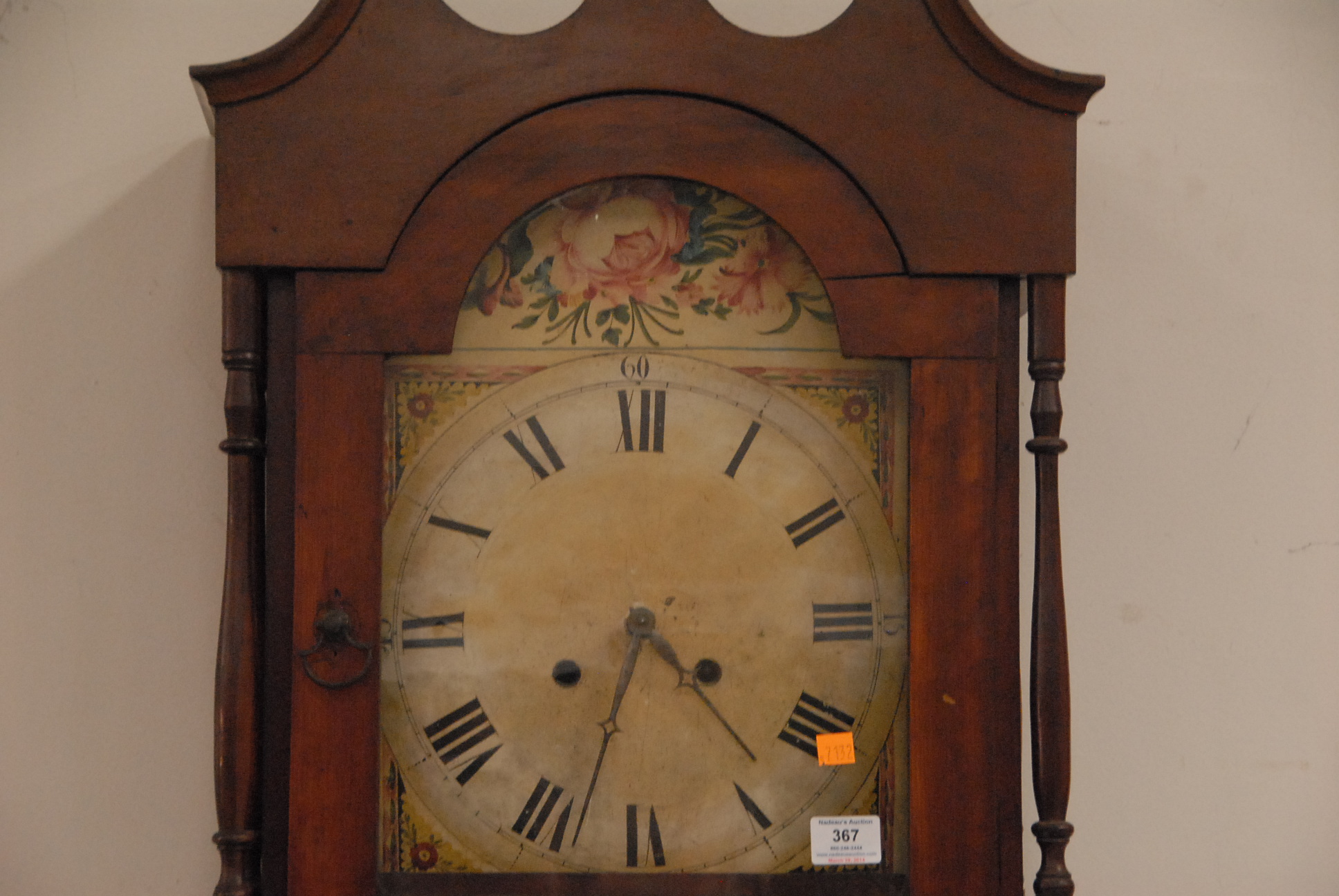 Lot 266A: Federal tall clock with broken arch top over tombstone wood dial, plain case with door on base set on bracket feet with brass works….