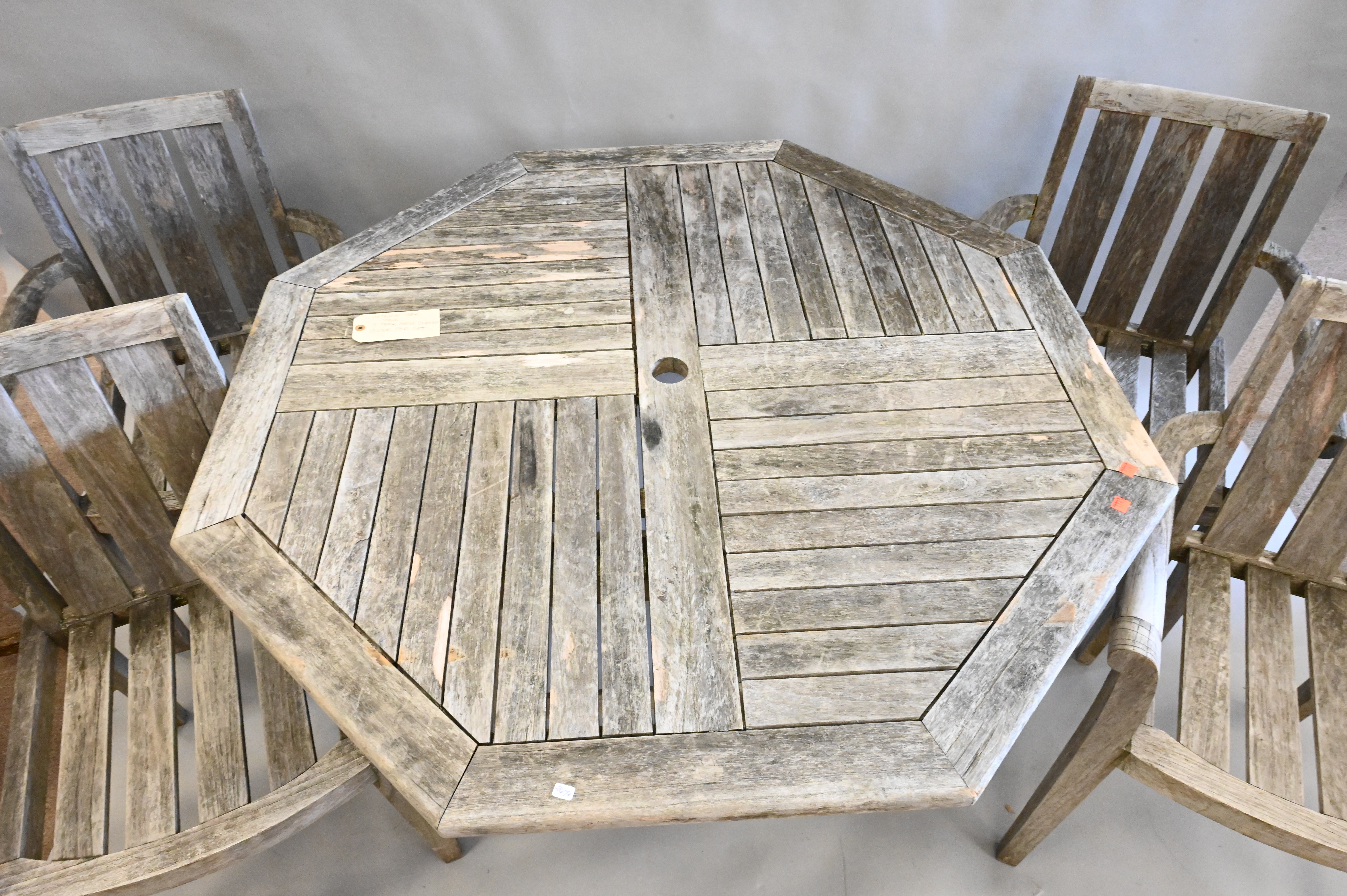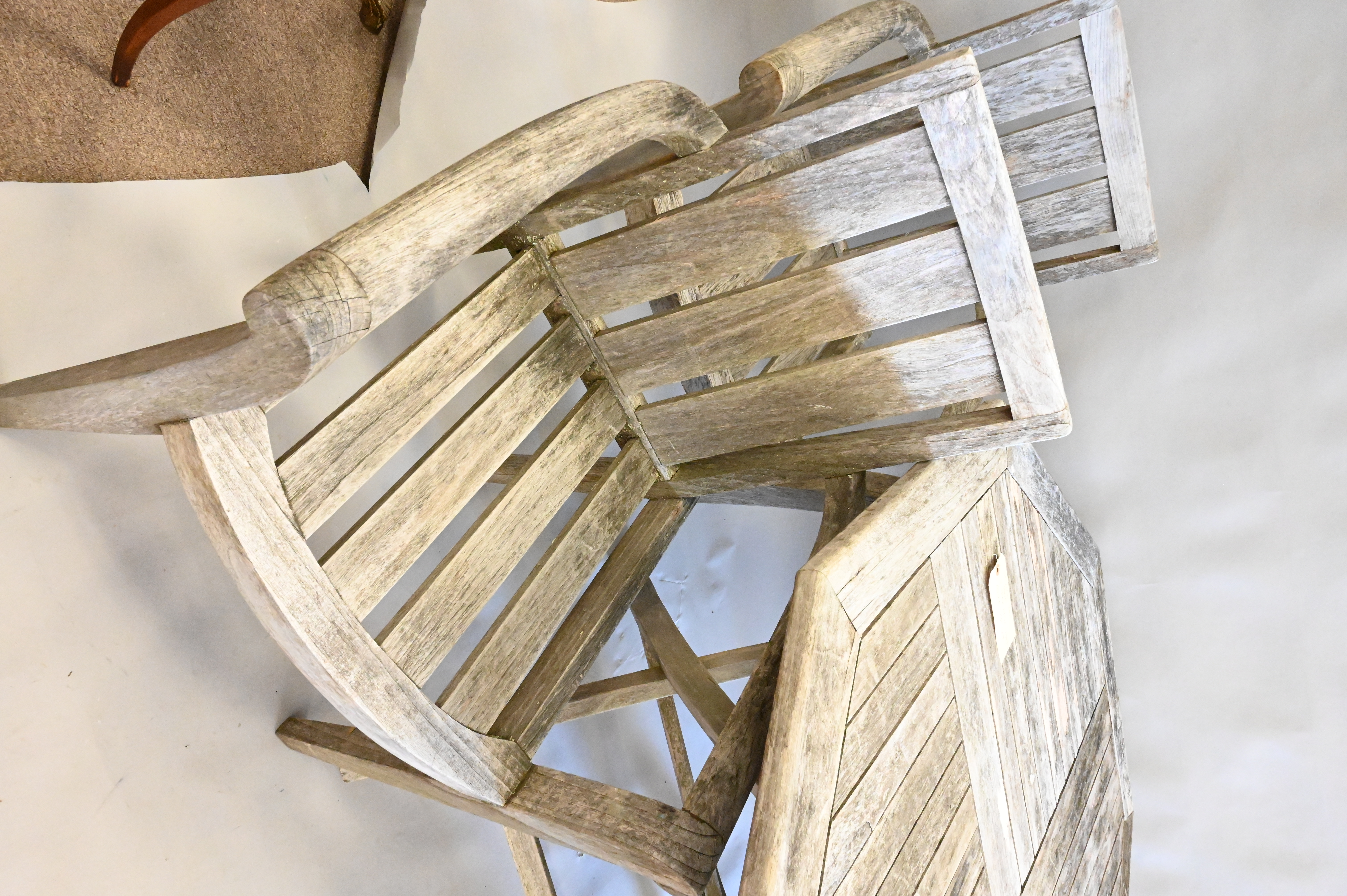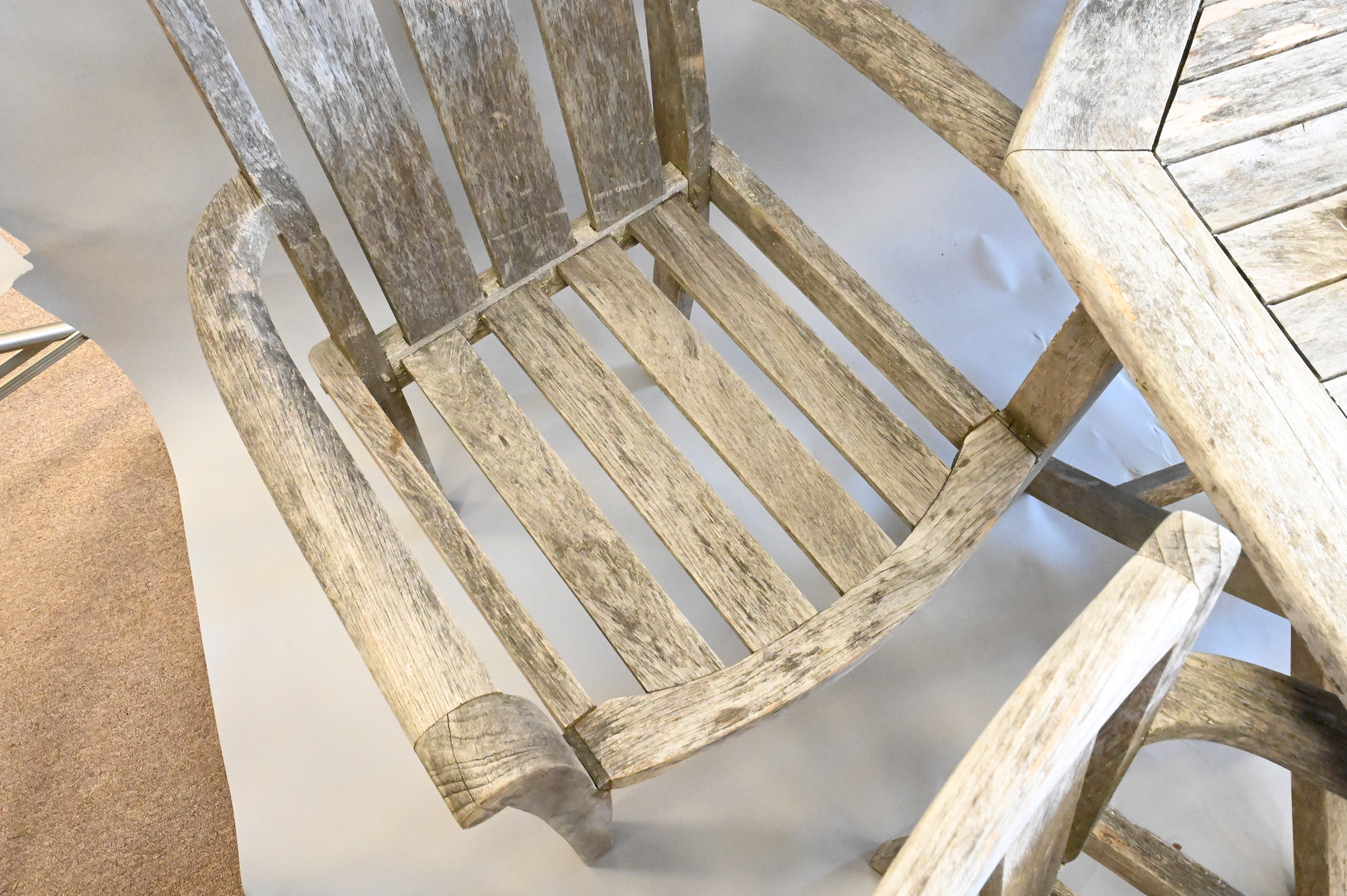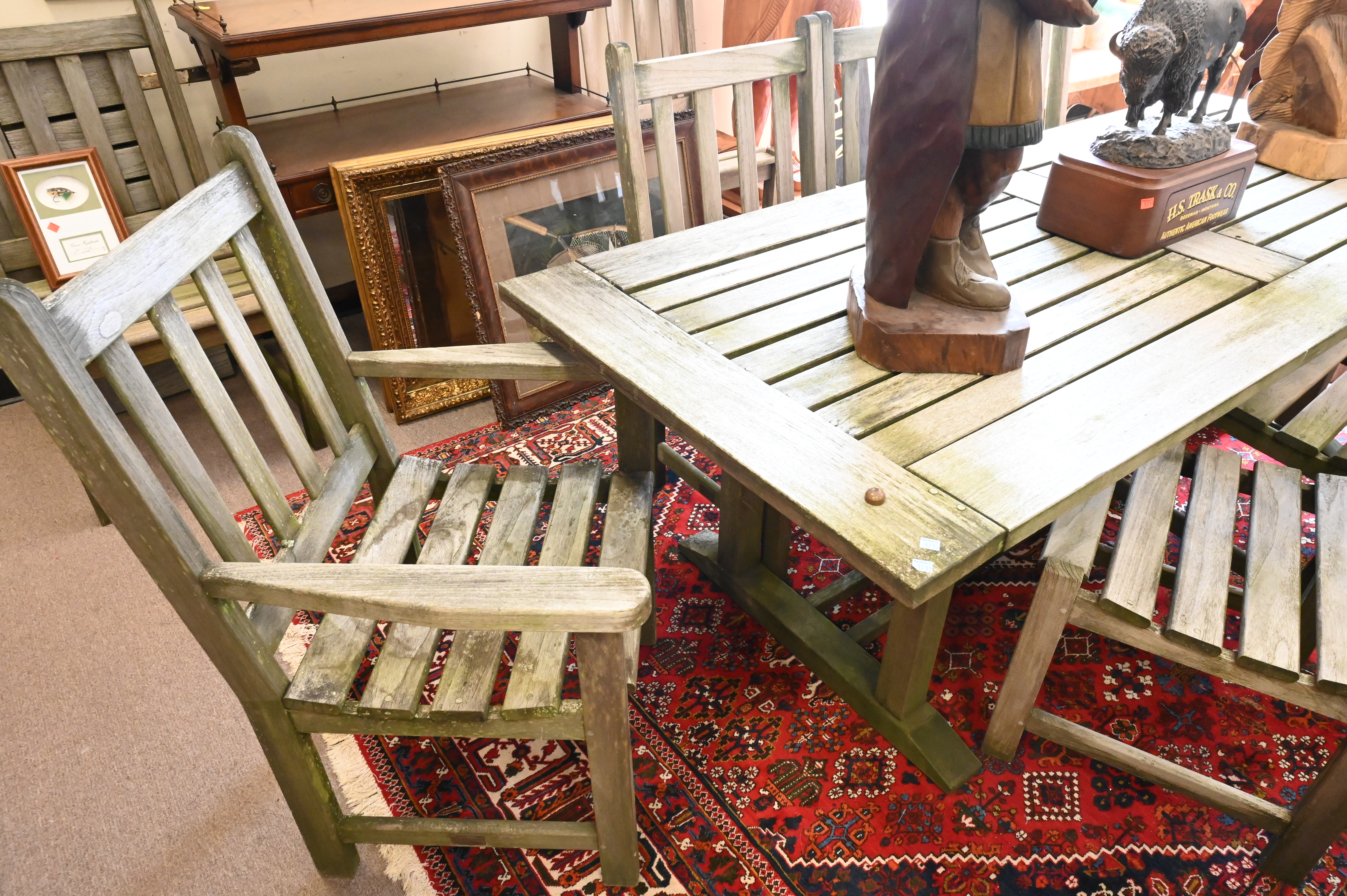 11 Piece Teak Outdoor Set, table with two rounded end leaves, 10 chairs including two with arms, chair height 39 inches, chair width 24 inches, table top 35″x88″, table height 28 inches.