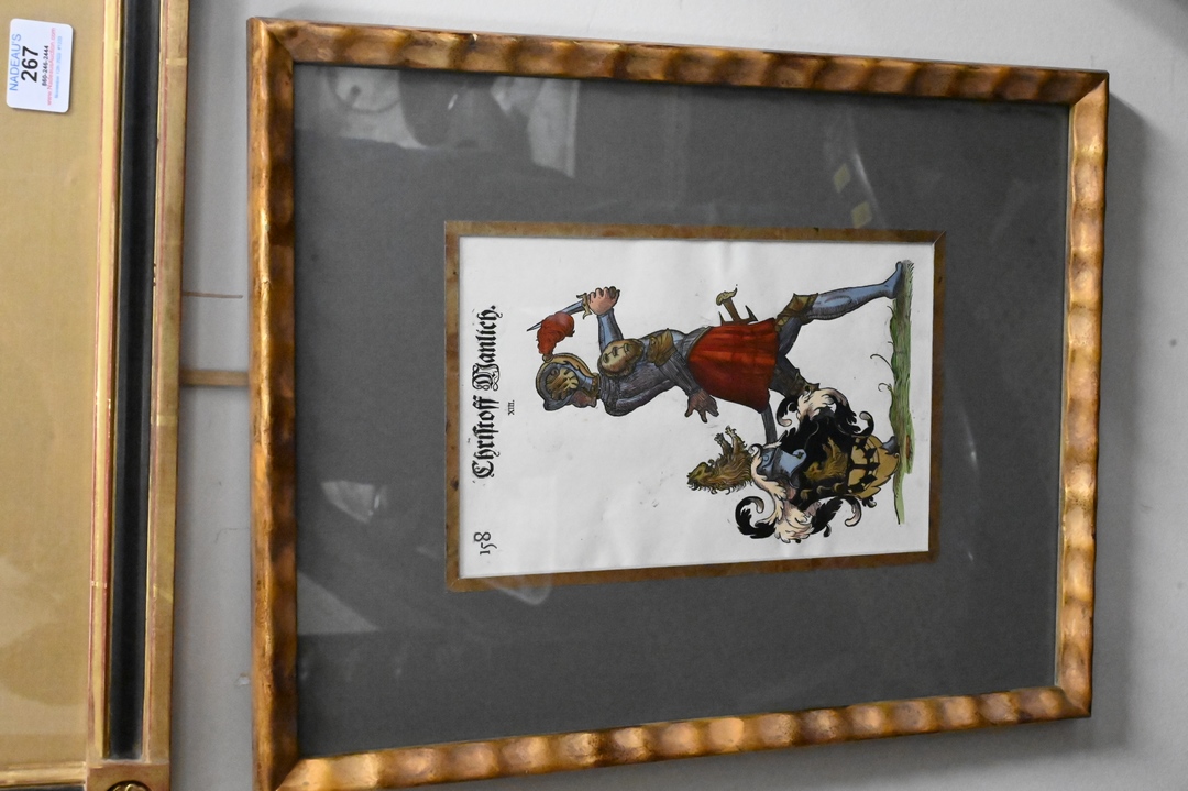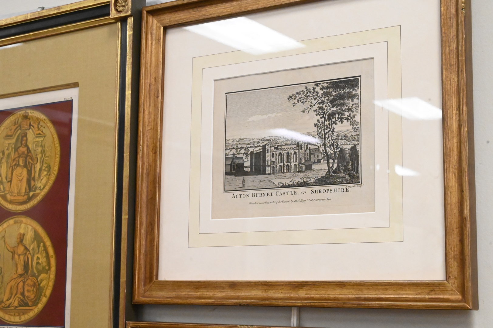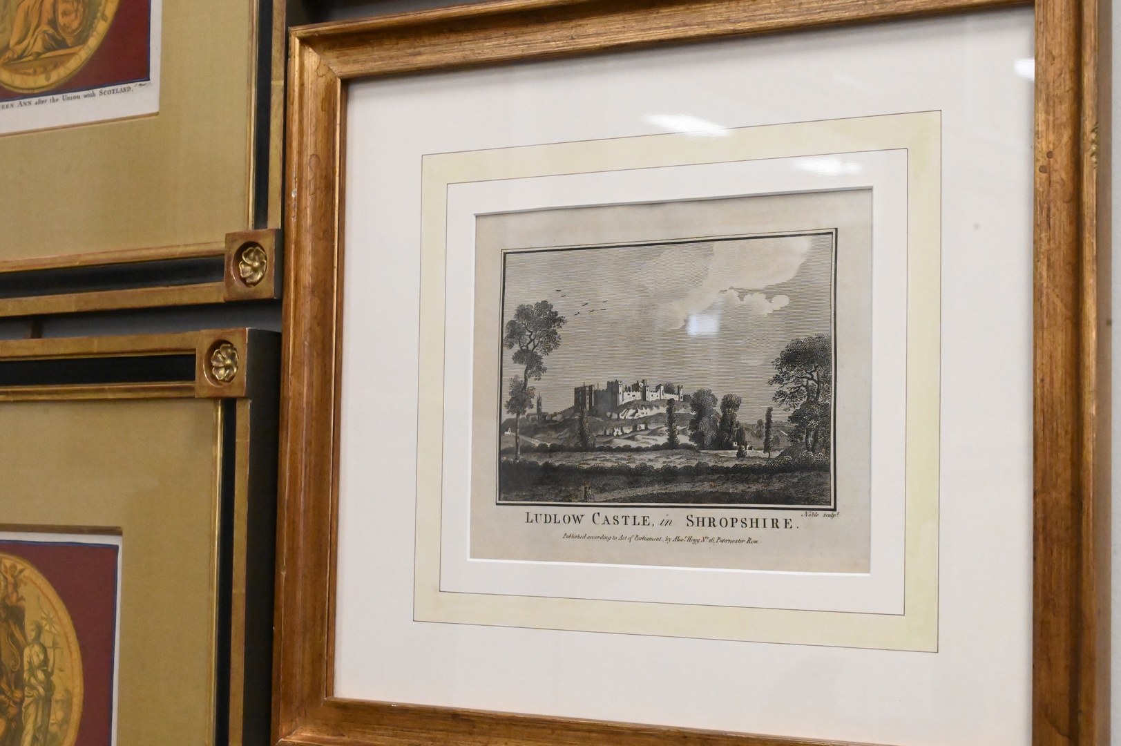 A Group of Six Framed Assorted Prints, to include Ludlow Castle in Shropshire; Acton Burnell Castle in Shropshire; two knight colored engravings, along with a pair of engravings of seals, King George I, and Queen Anne; 14″ x 8 1/2″.