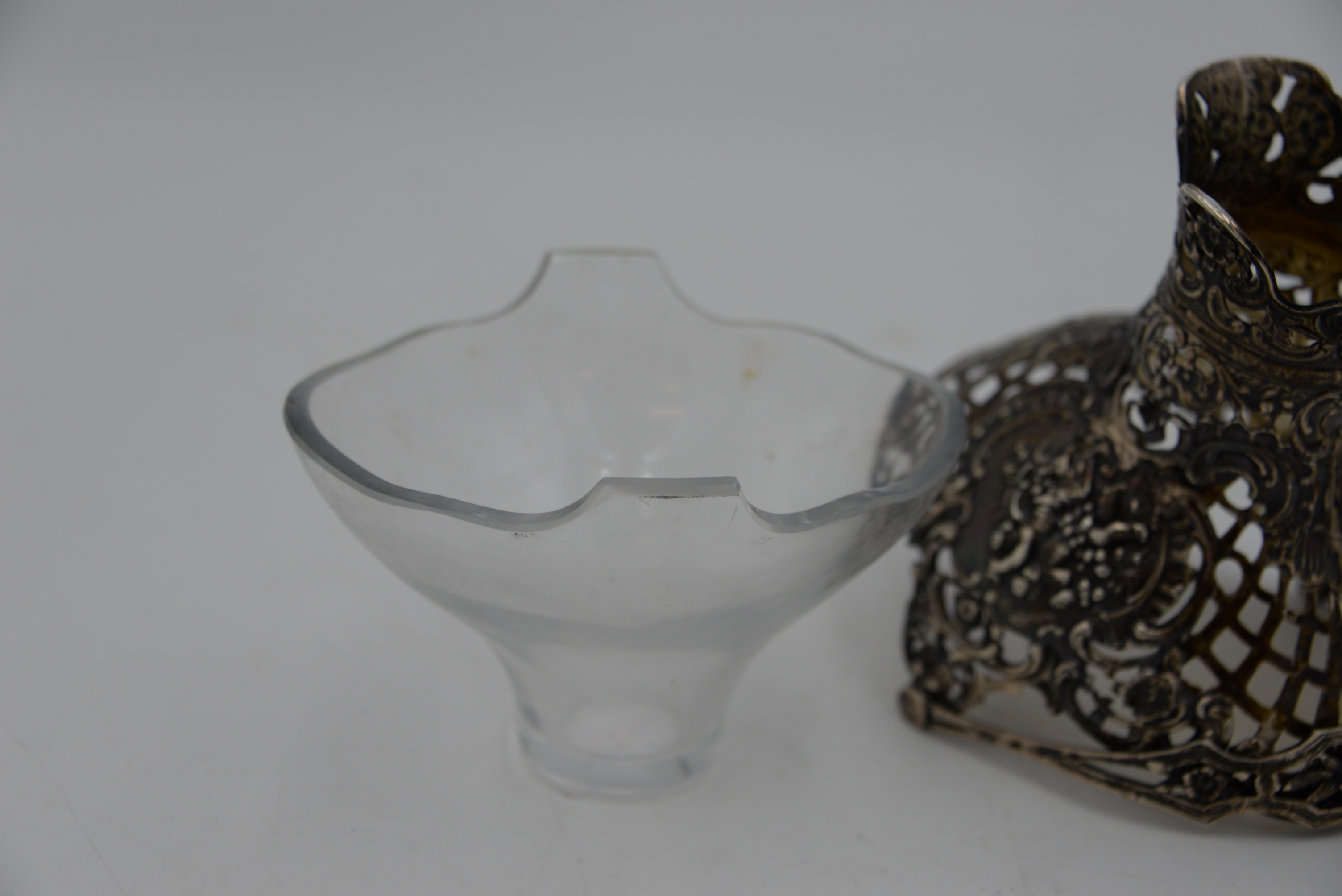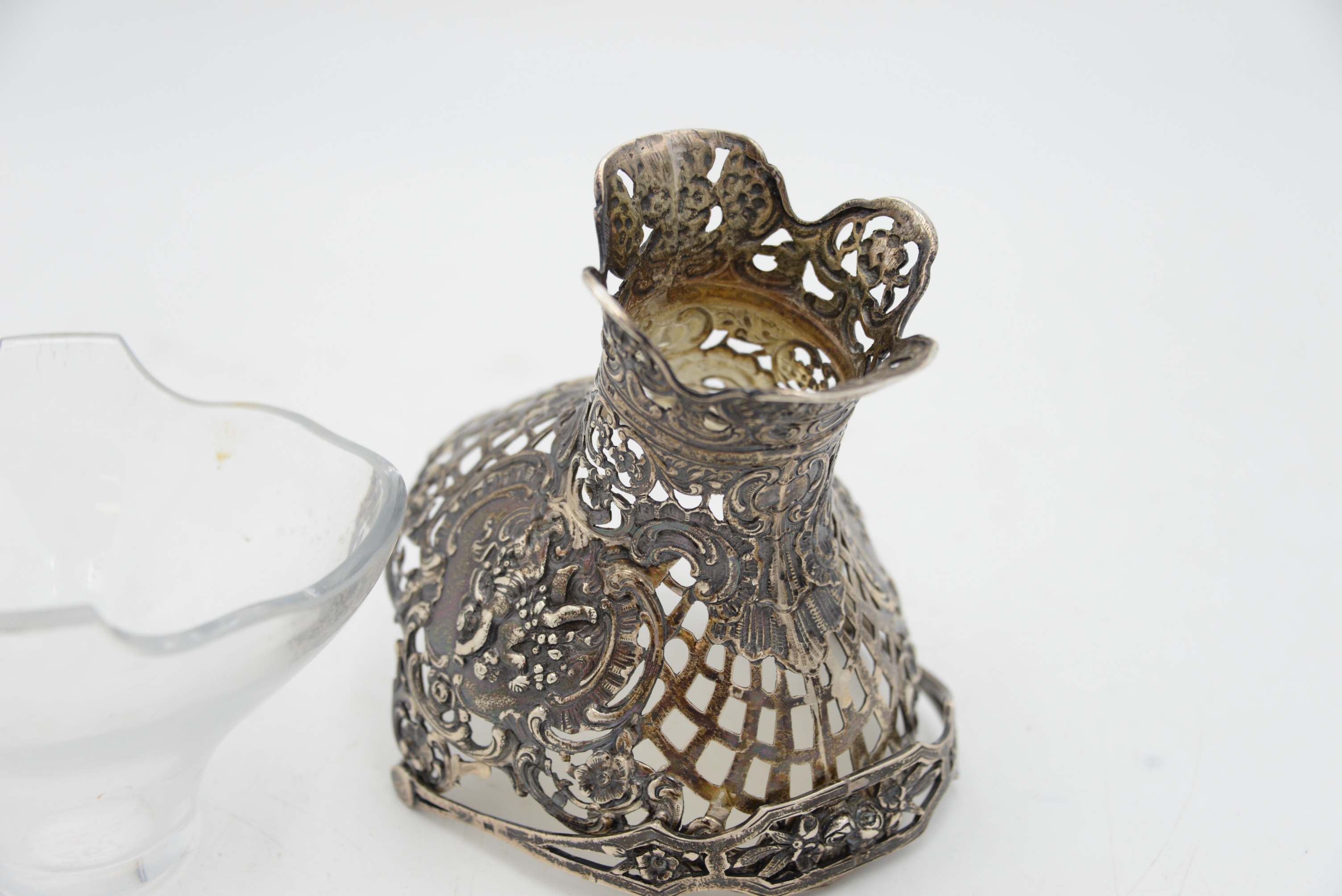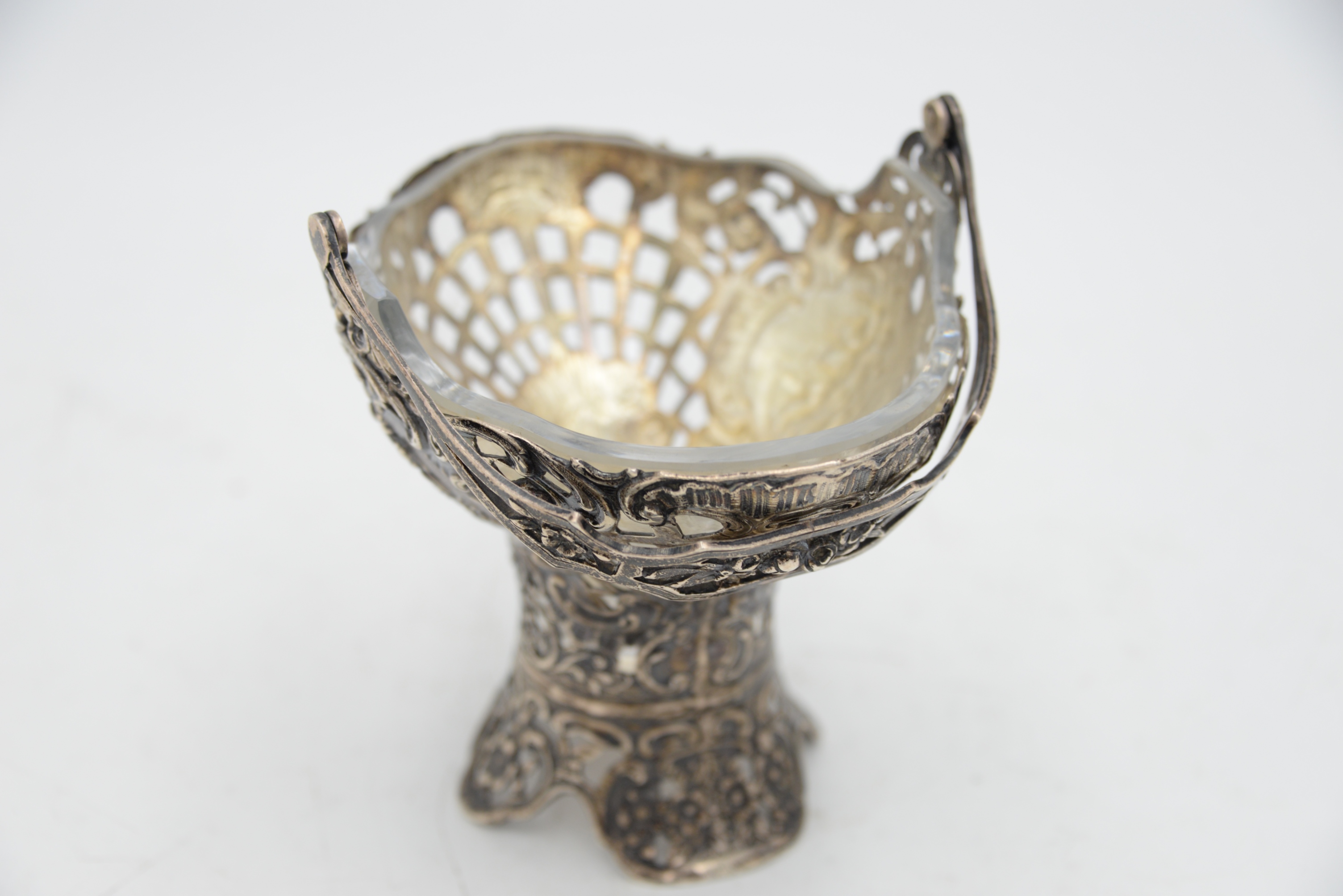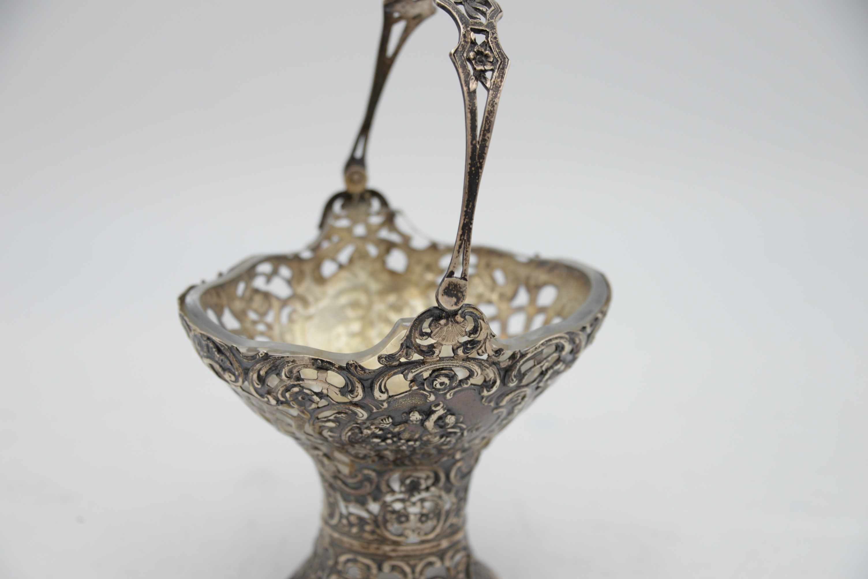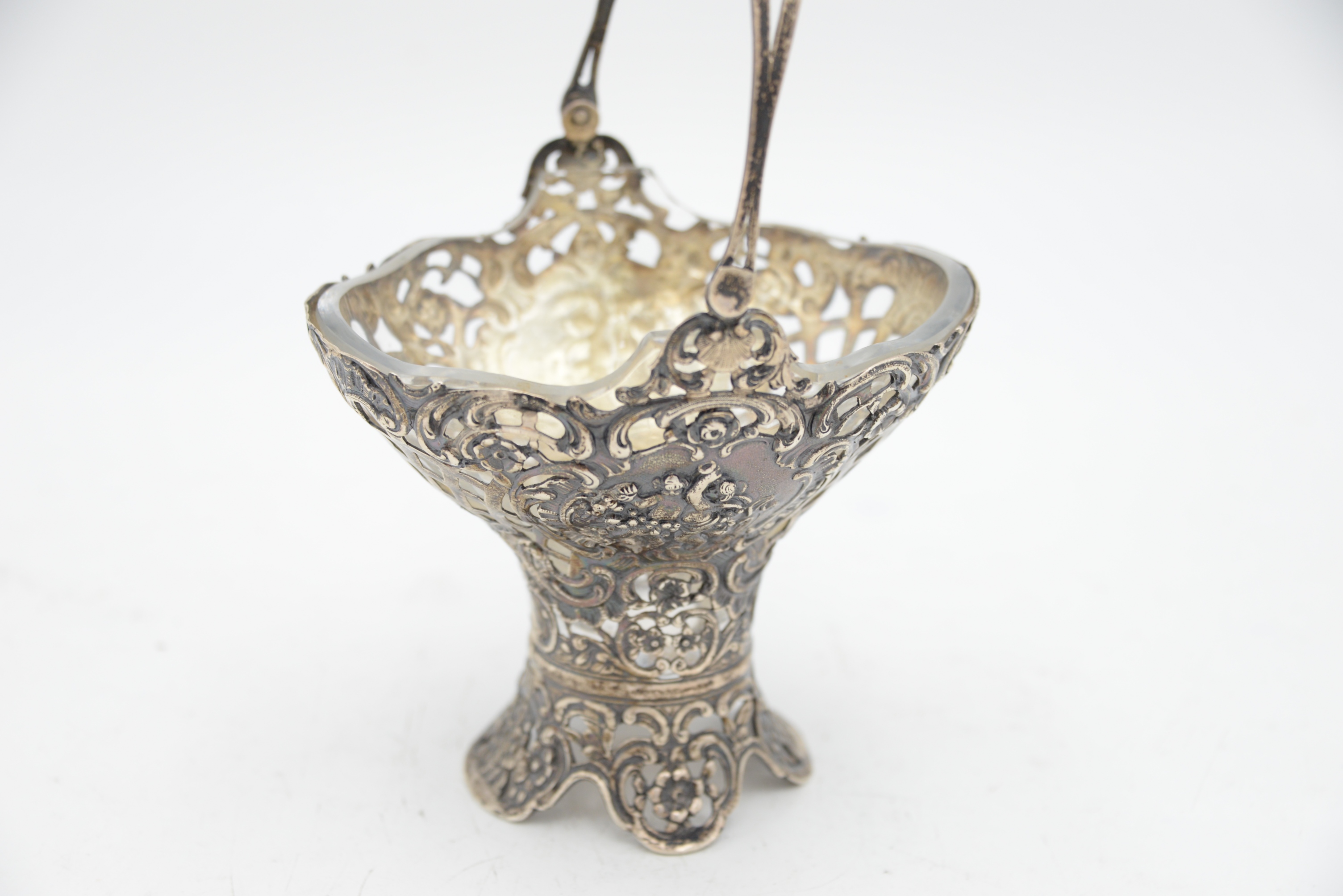Continental Silver Basket with Swing Handle, having openwork basket weave and puttis with crystal liner, total height 9 inches, 9.6 t.oz.